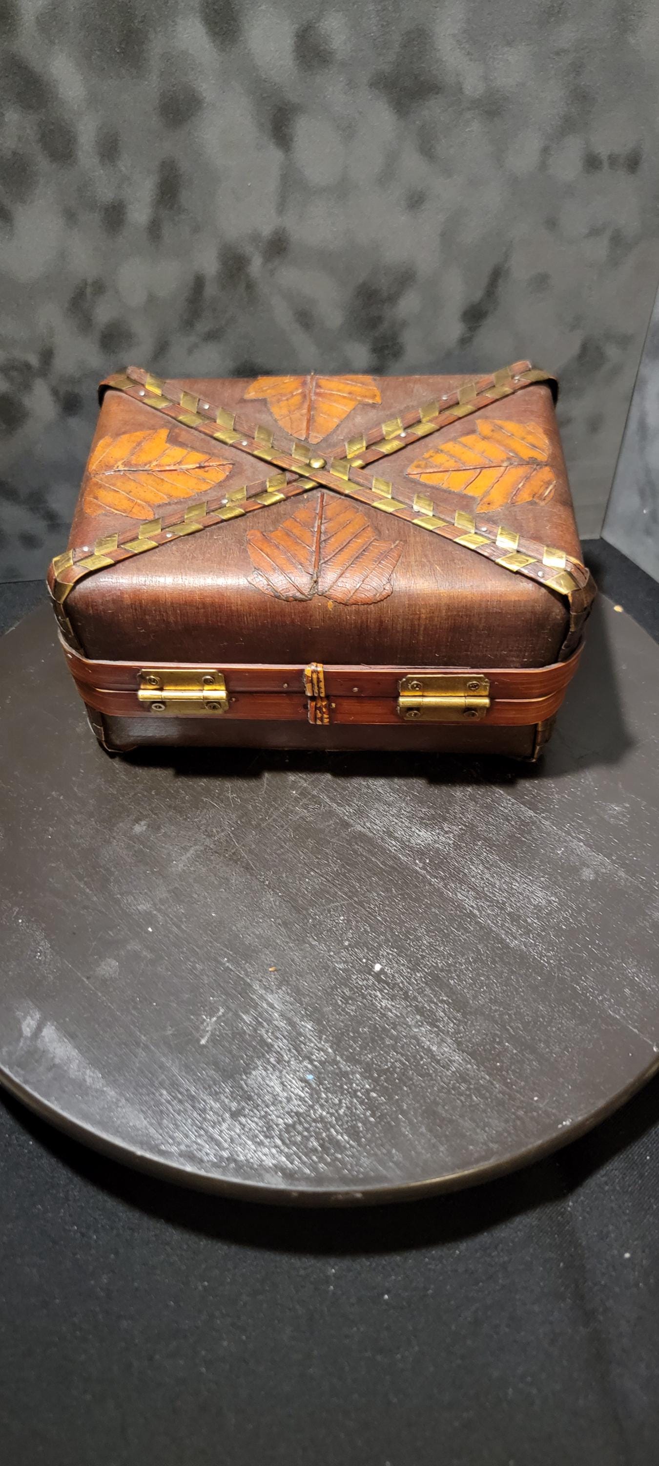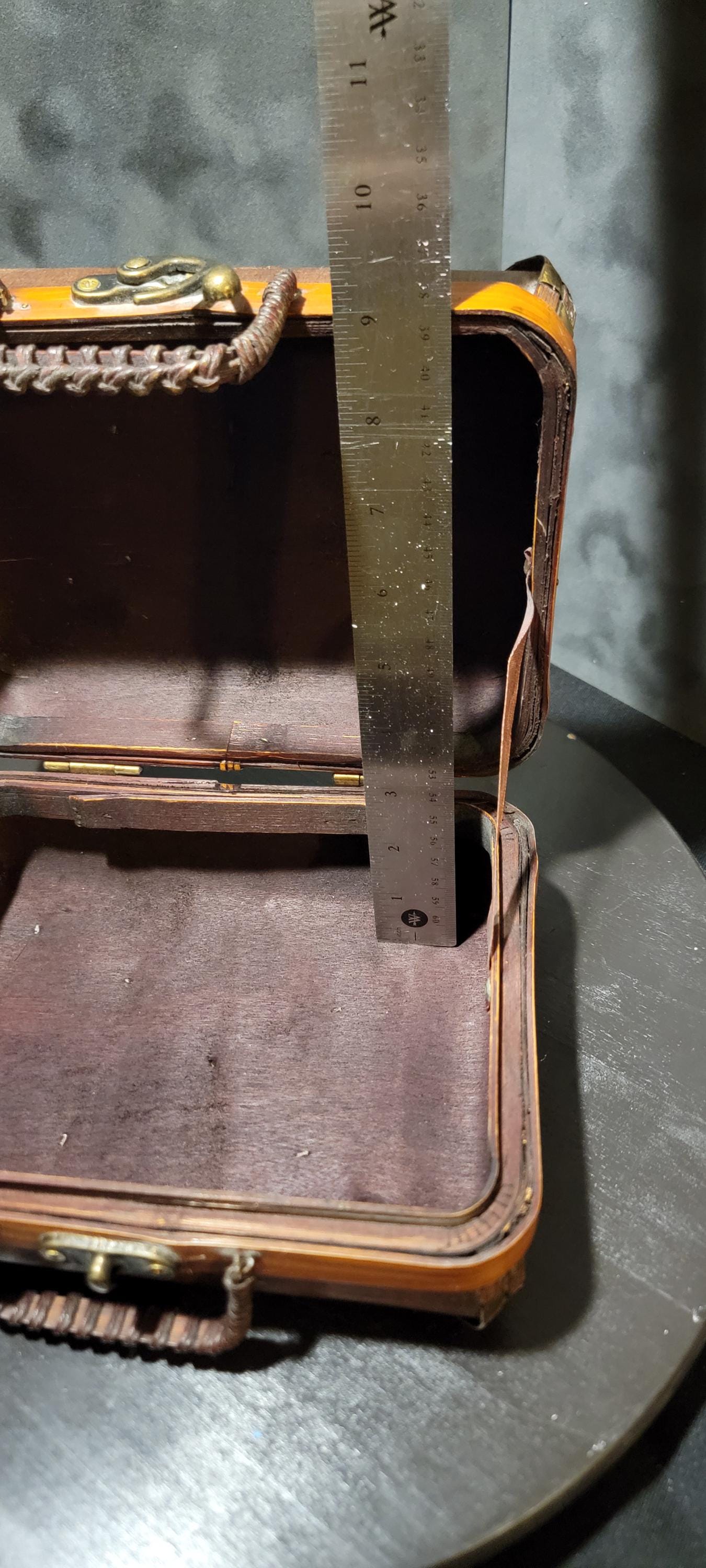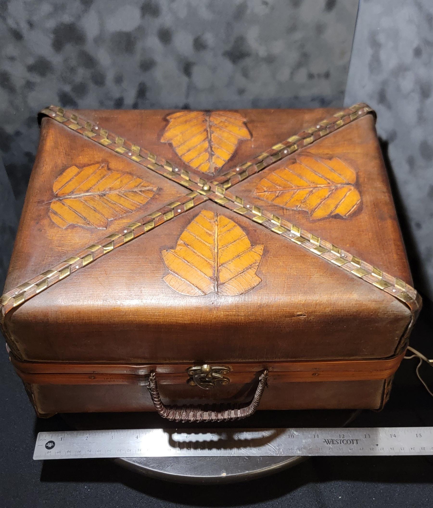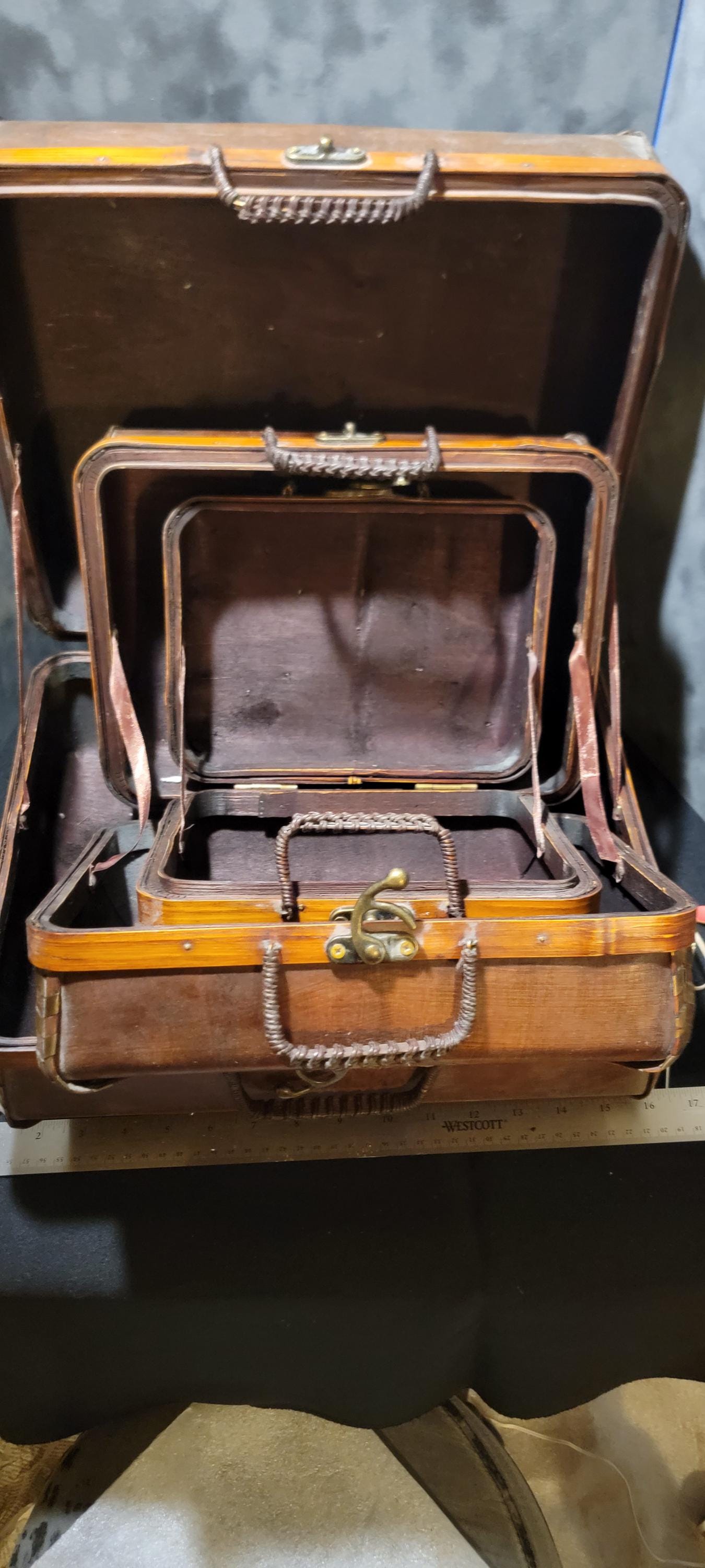 Bring timeless charm to your home with this vintage wooden nesting suitcase set, beautifully decorated with handcrafted leaf inlay and brass trim. These suitcases were never used and still retain their original $99.99 price marking, making them a rare find in excellent condition. Perfect for adding a touch of rustic farmhouse style or boho décor, they also serve as unique decorative storage boxes or a one-of-a-kind display piece.