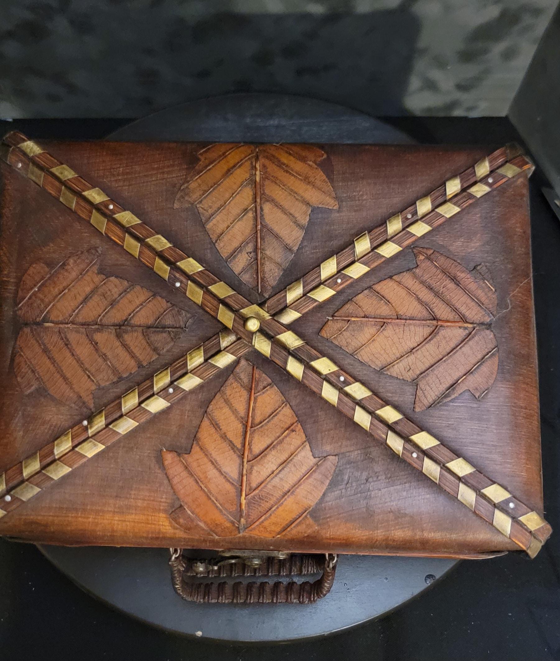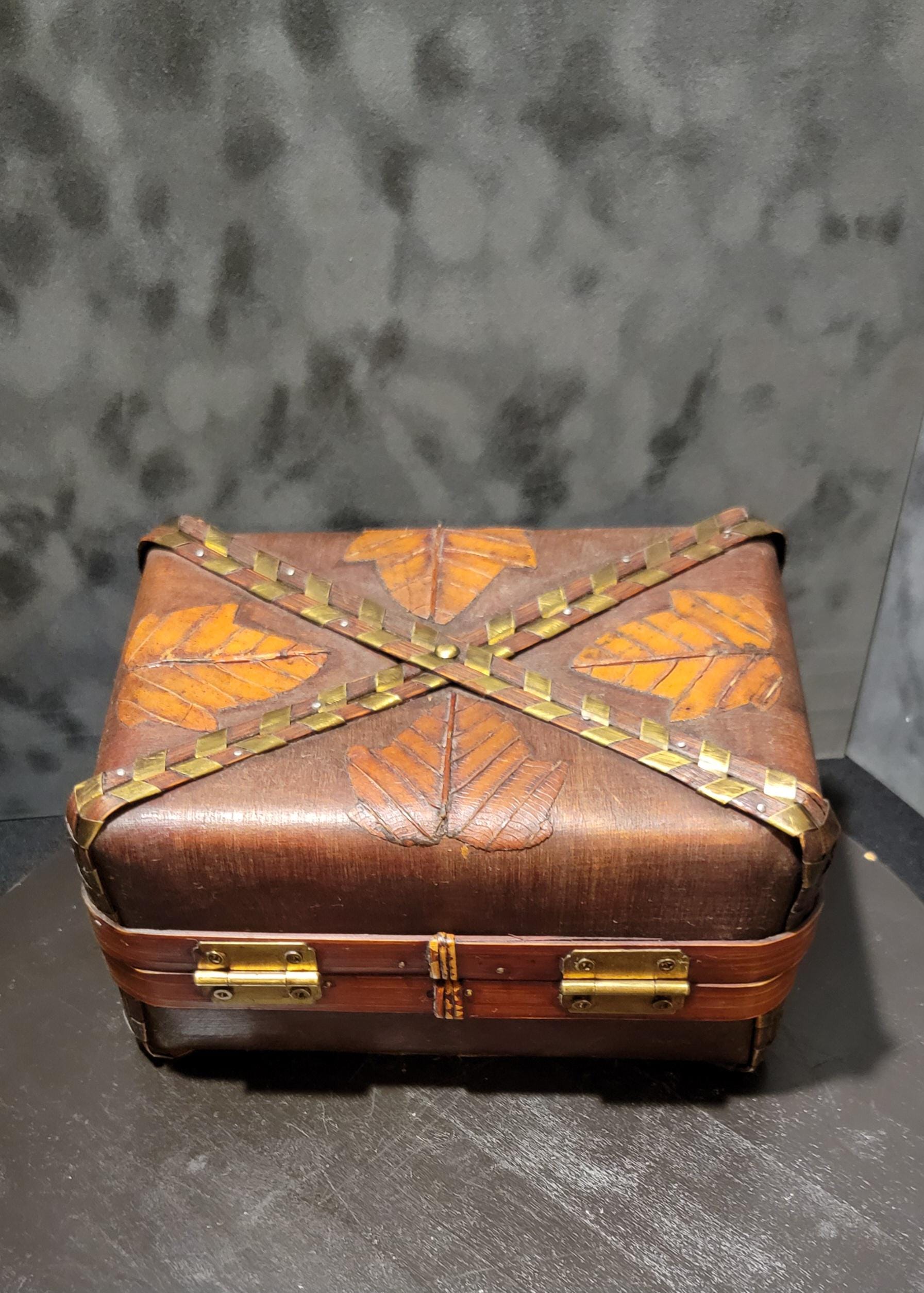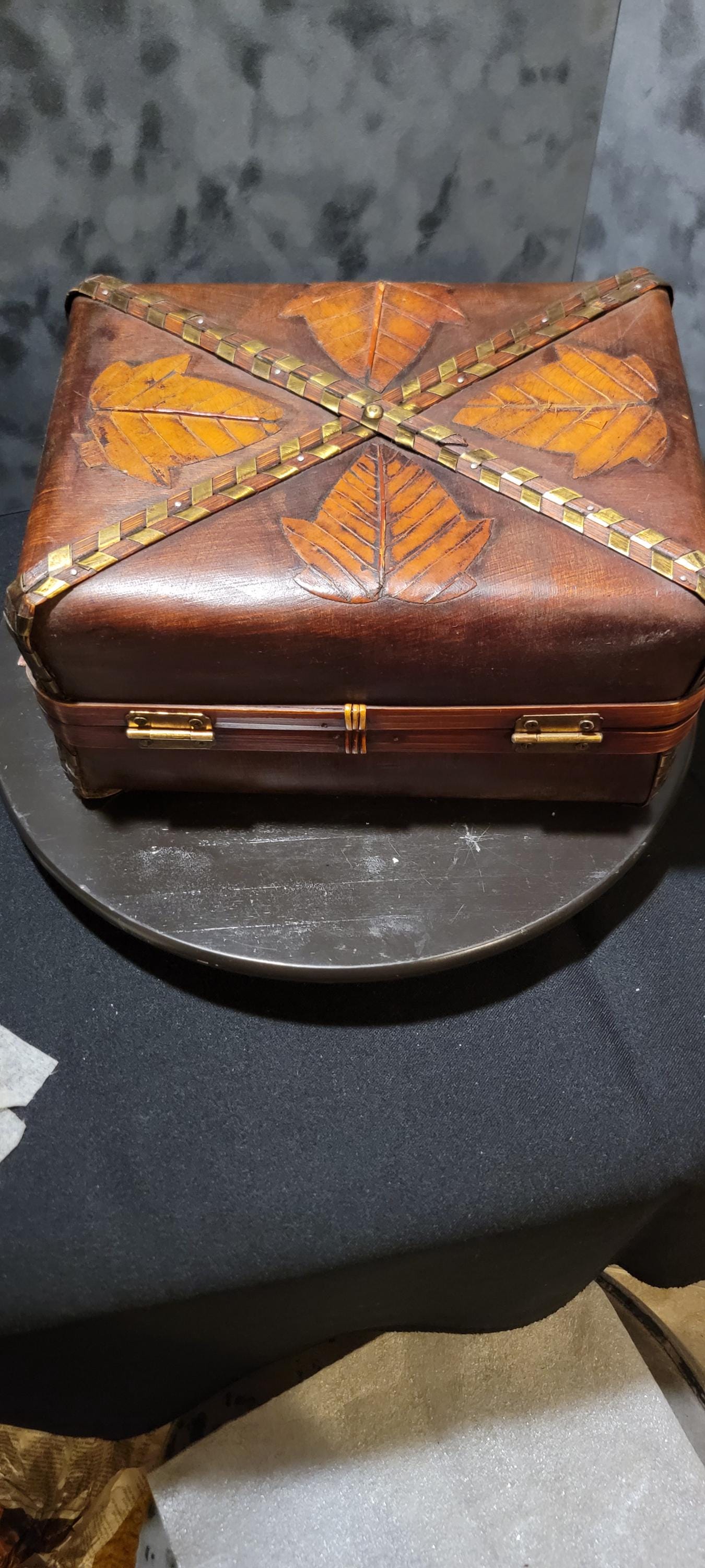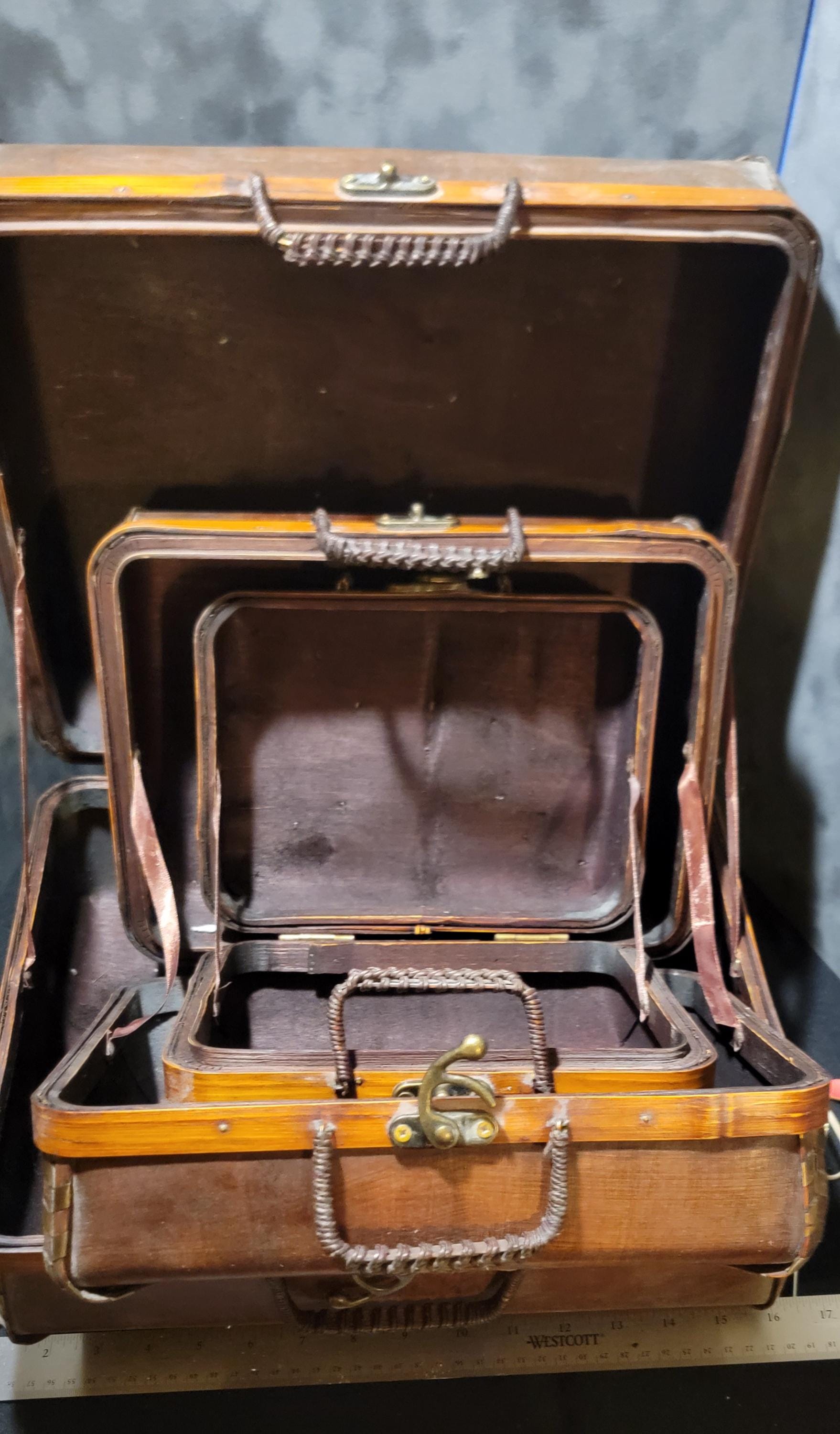 This charming set includes three nesting wooden suitcases with matching woven handles and brass clasps, all fitting neatly into the largest case. The exterior features a beautiful inlay of pressed leaves under lacquer, framed with brass accents. Functional clasps and braided handles add rustic charm, while the interior has a warm, natural patina.