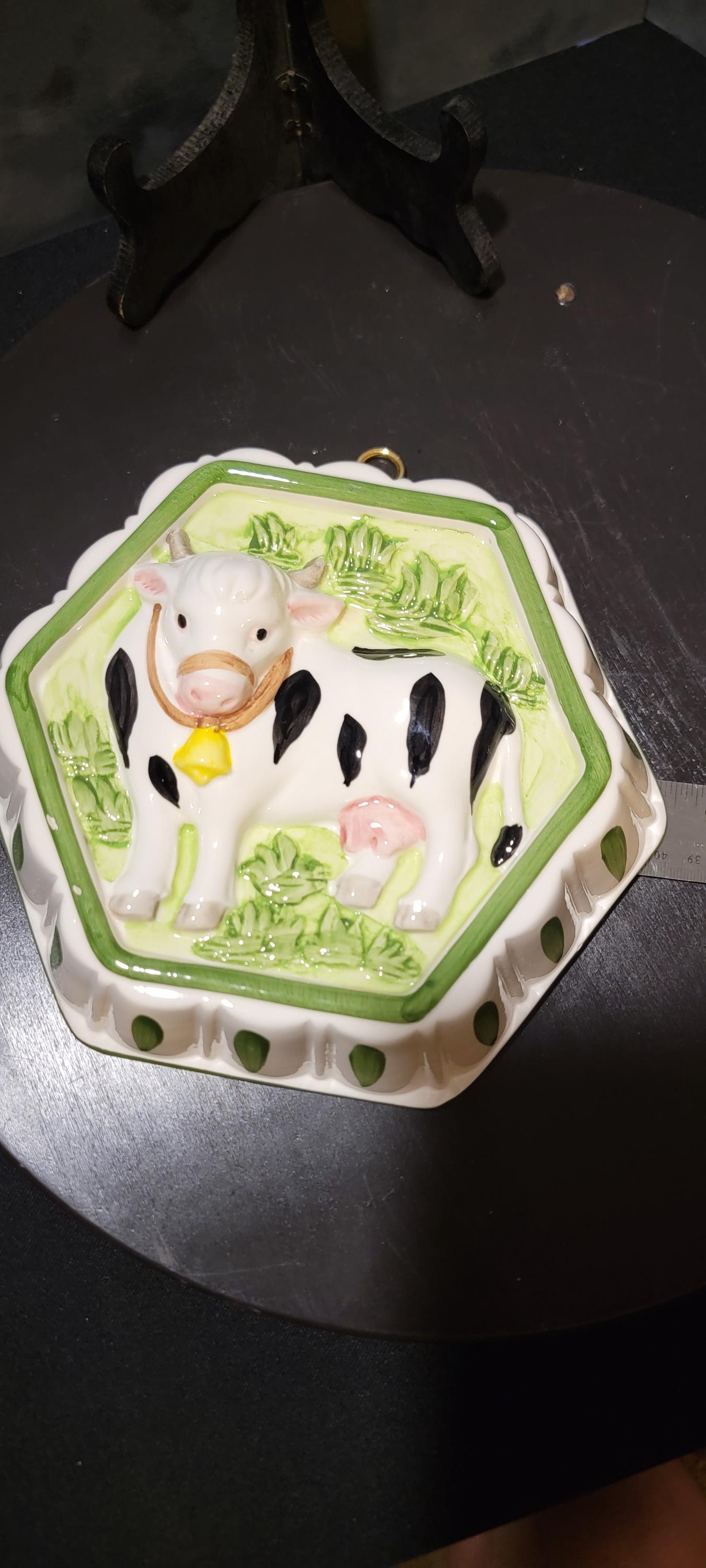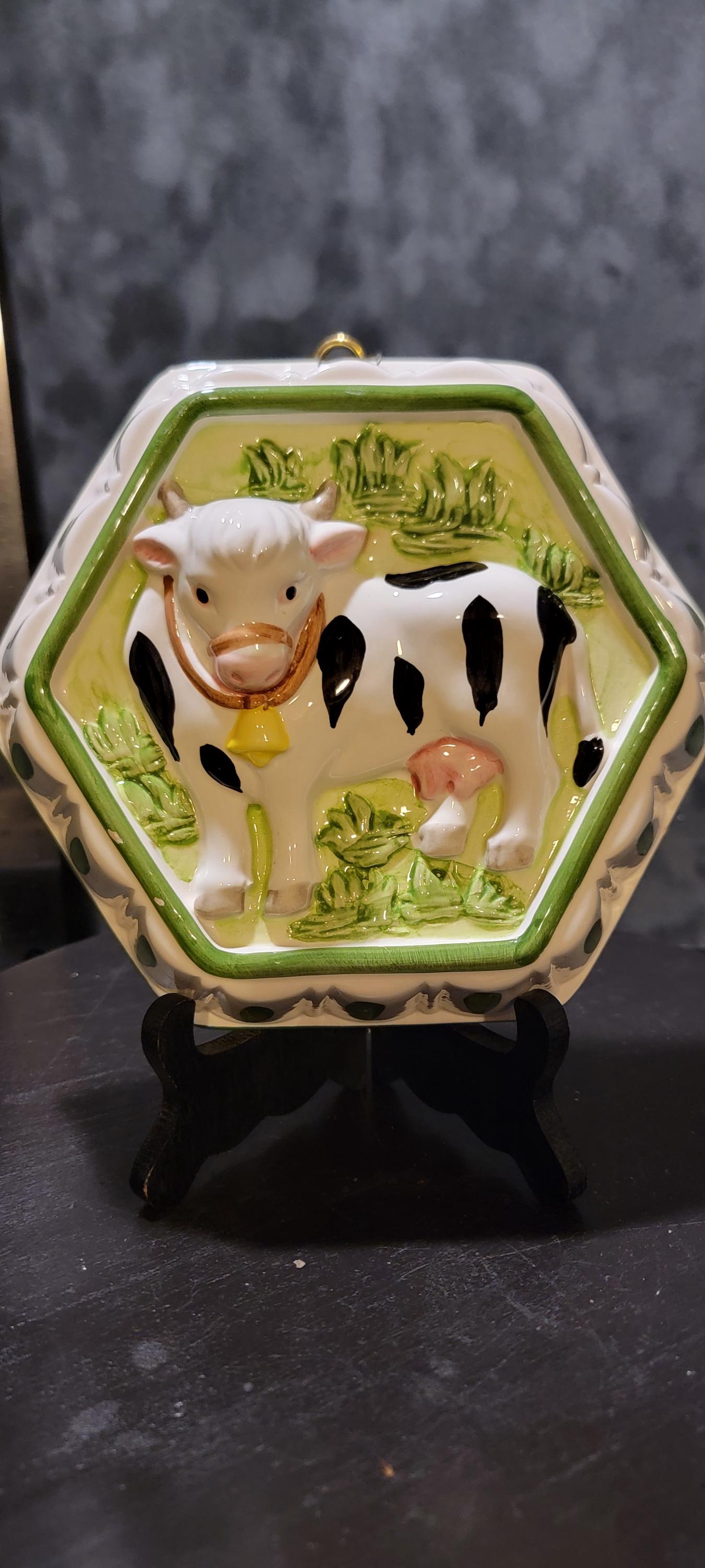 Design: Raised 3D cow in green pasture, hexagonal shape, hand-painted details