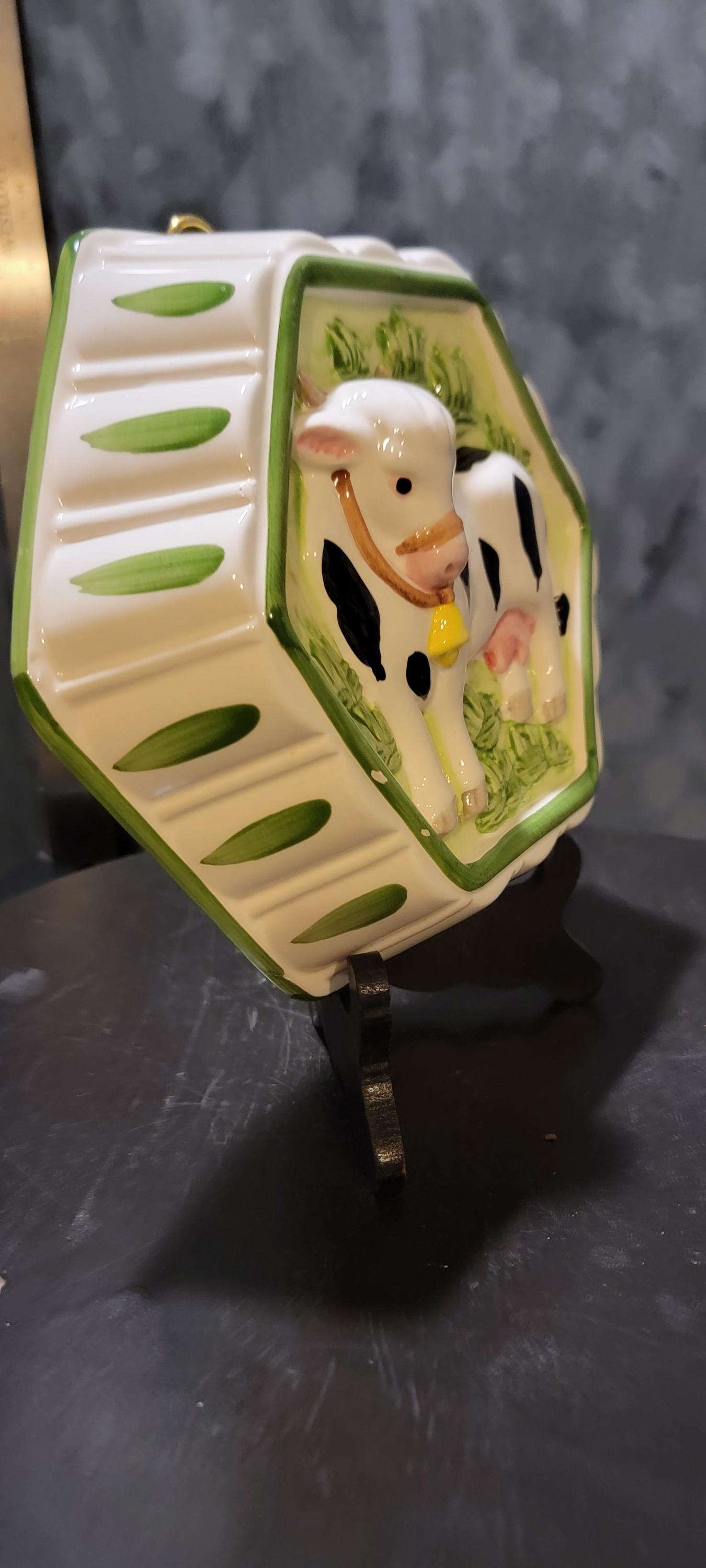 Add rustic farmhouse charm to your home with this vintage ceramic wall plaque featuring a cheerful black-and-white dairy cow with a golden bell. This 3D relief-style piece is set inside a hexagon-shaped frame with green trim and leafy accents, giving it a vibrant country feel.