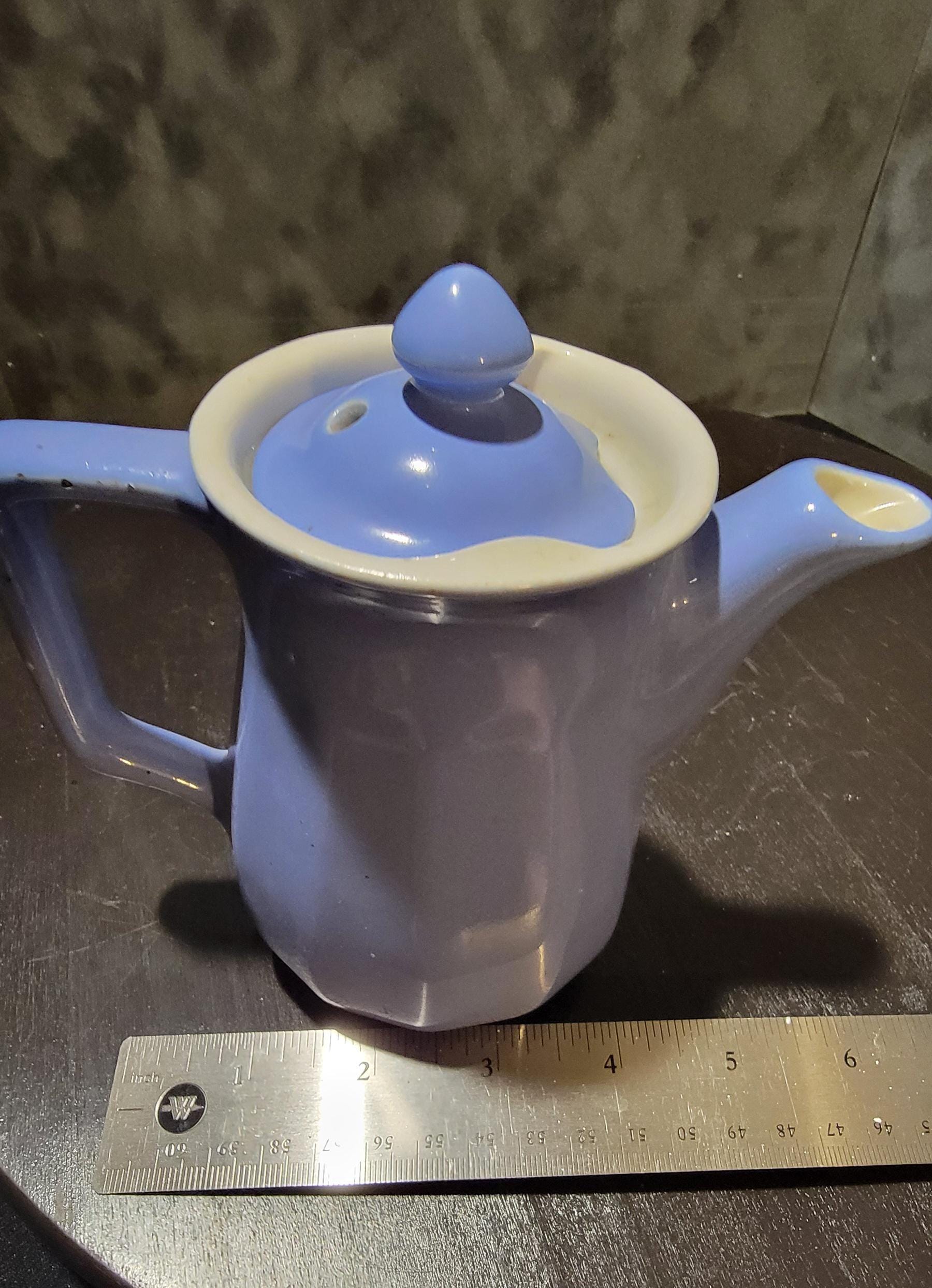 Brew your favorite cup of tea in style with this vintage ceramic teapot in a beautiful periwinkle blue glaze. Its compact size and cheerful color make it perfect for everyday use or as a decorative accent in your vintage-inspired kitchen.
