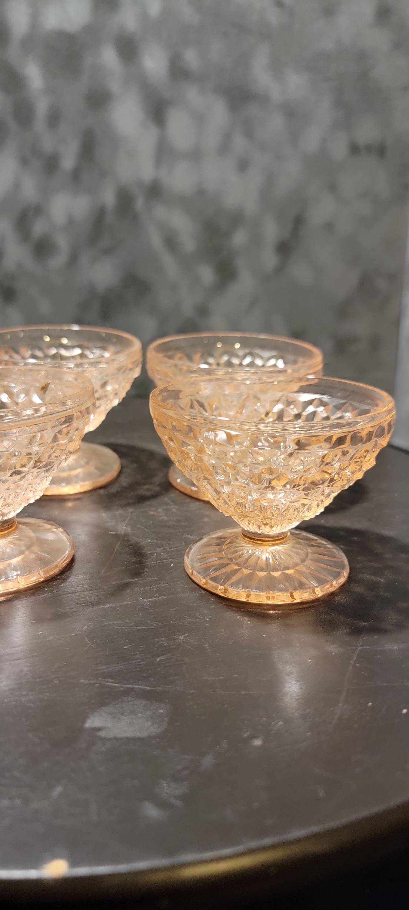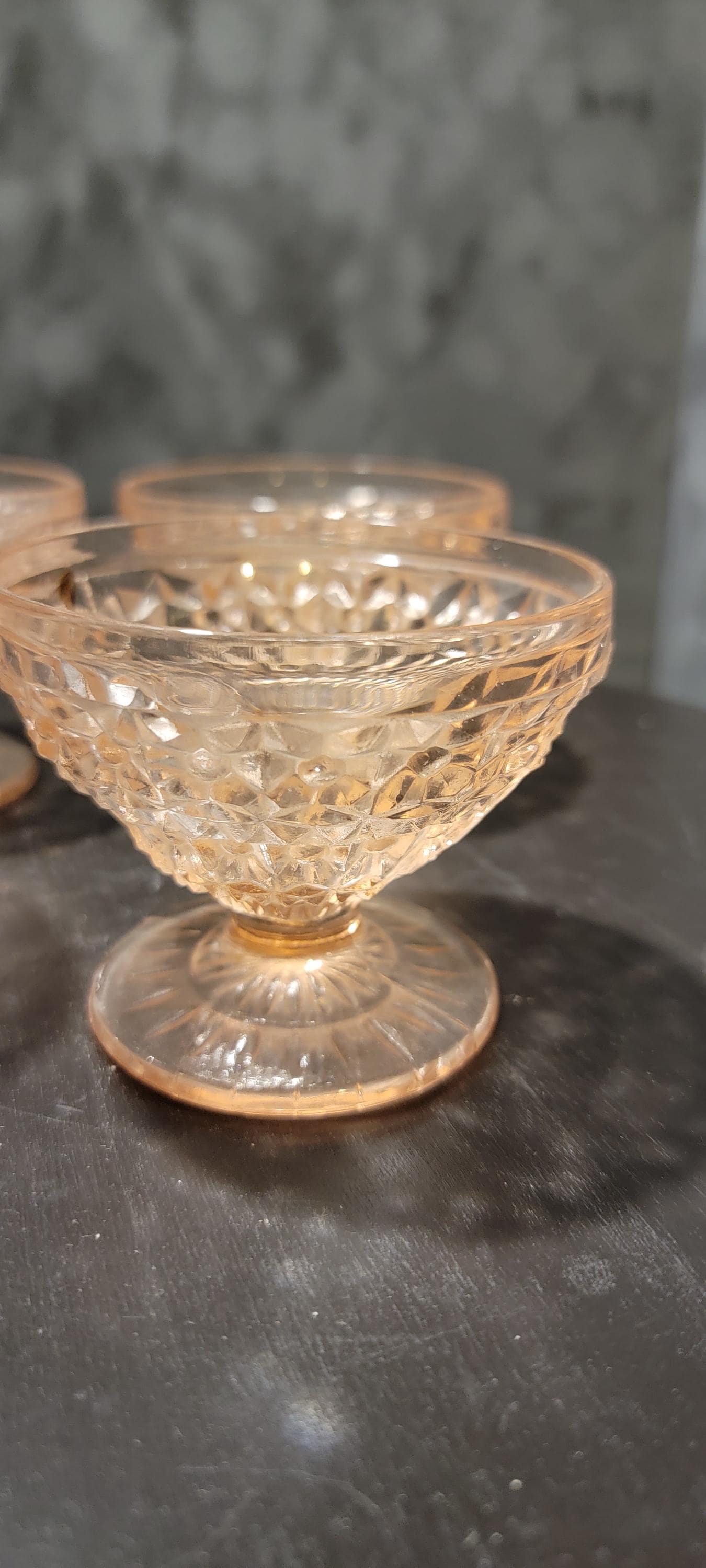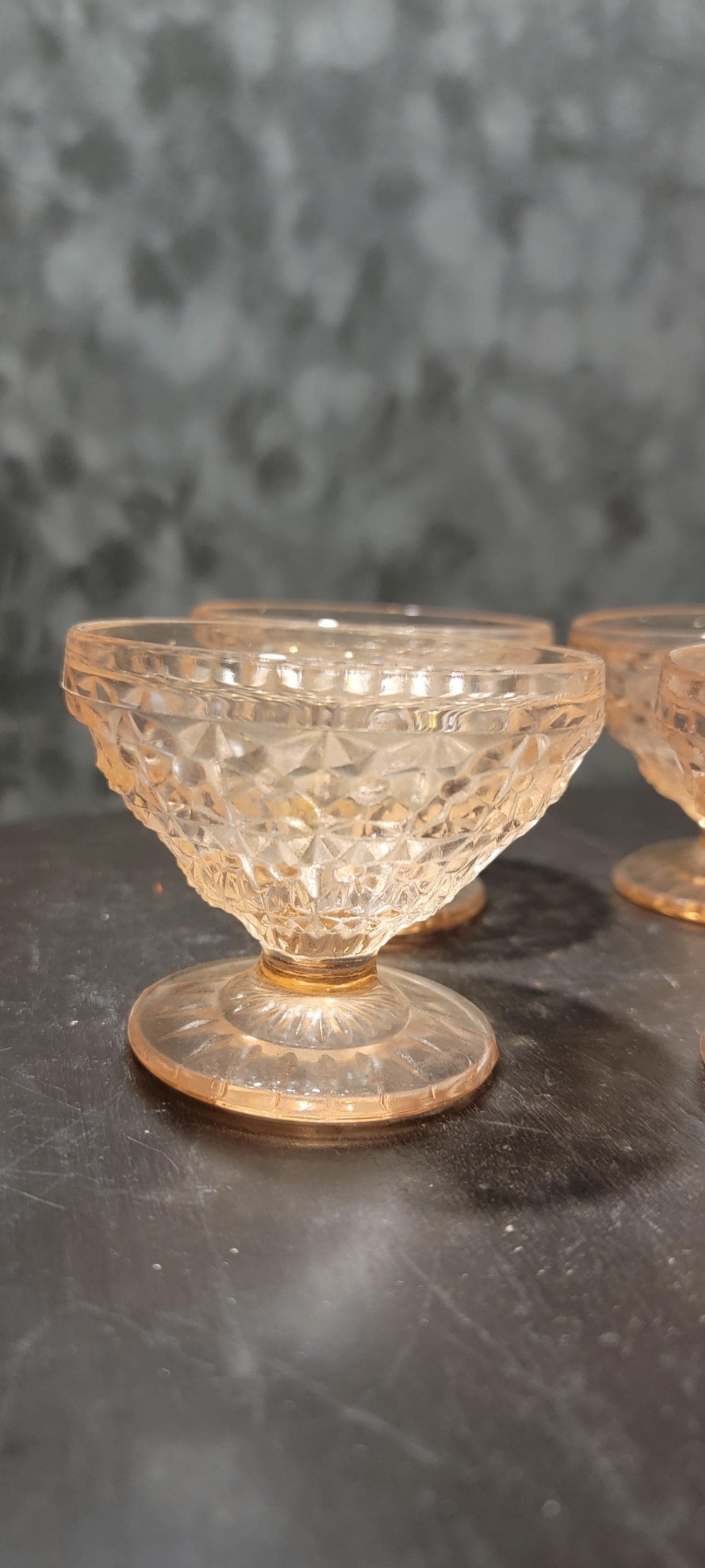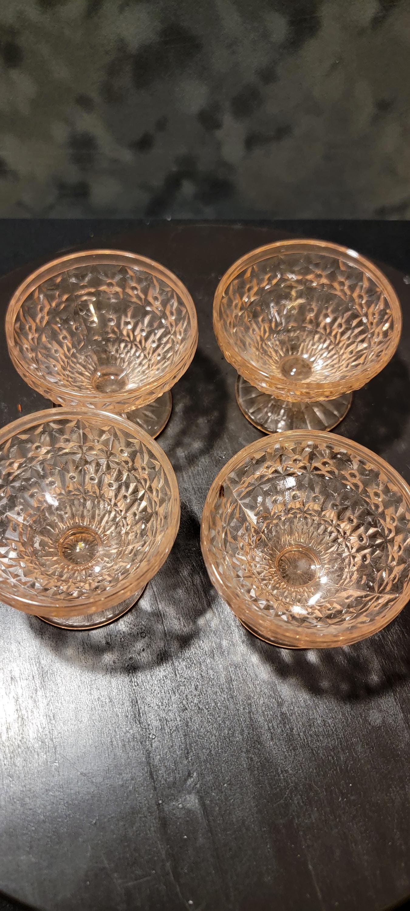 This set of four pink Depression glass sherbet/dessert cups carries both beauty and history. Produced during the 1930s–1940s, these dainty pedestal bowls feature a pressed cube-style geometric pattern that glows with soft pink elegance.