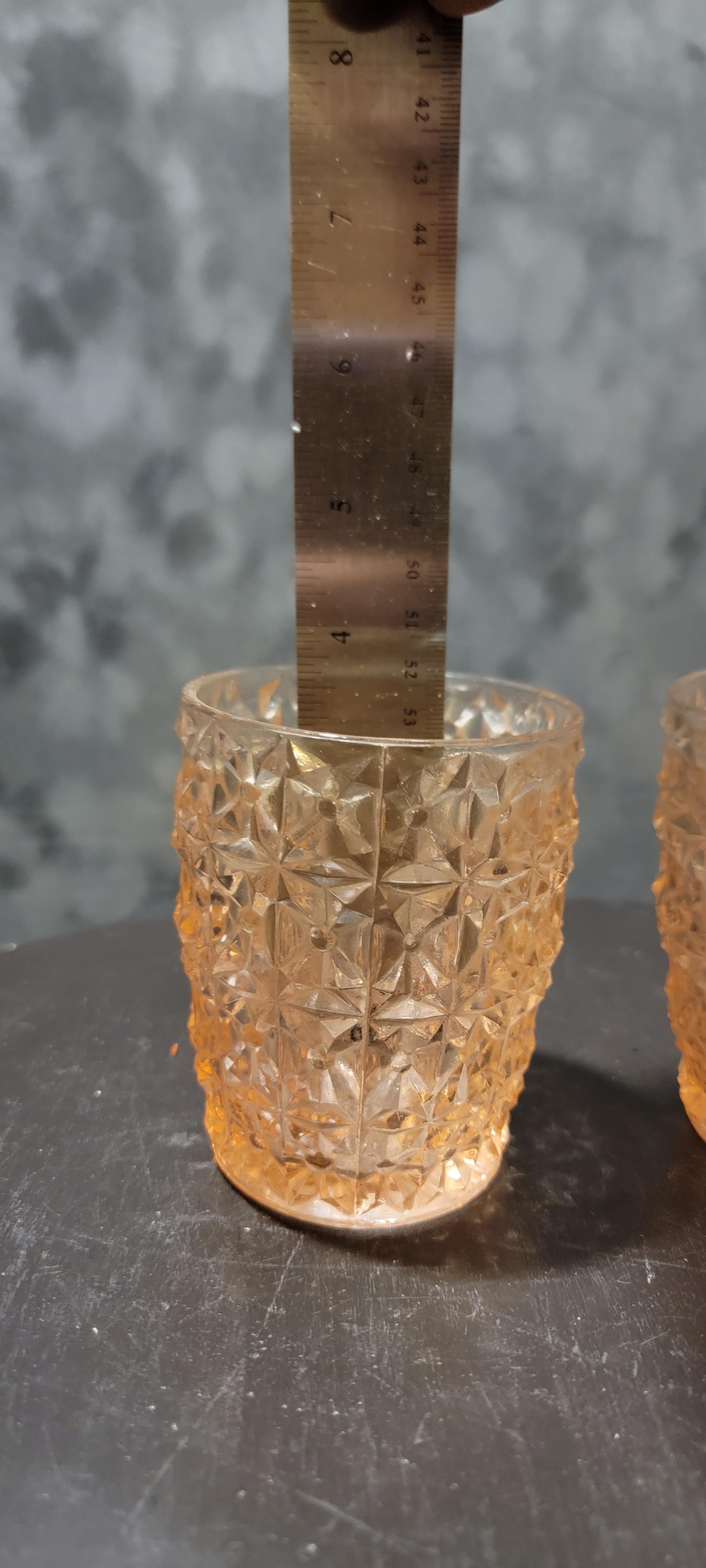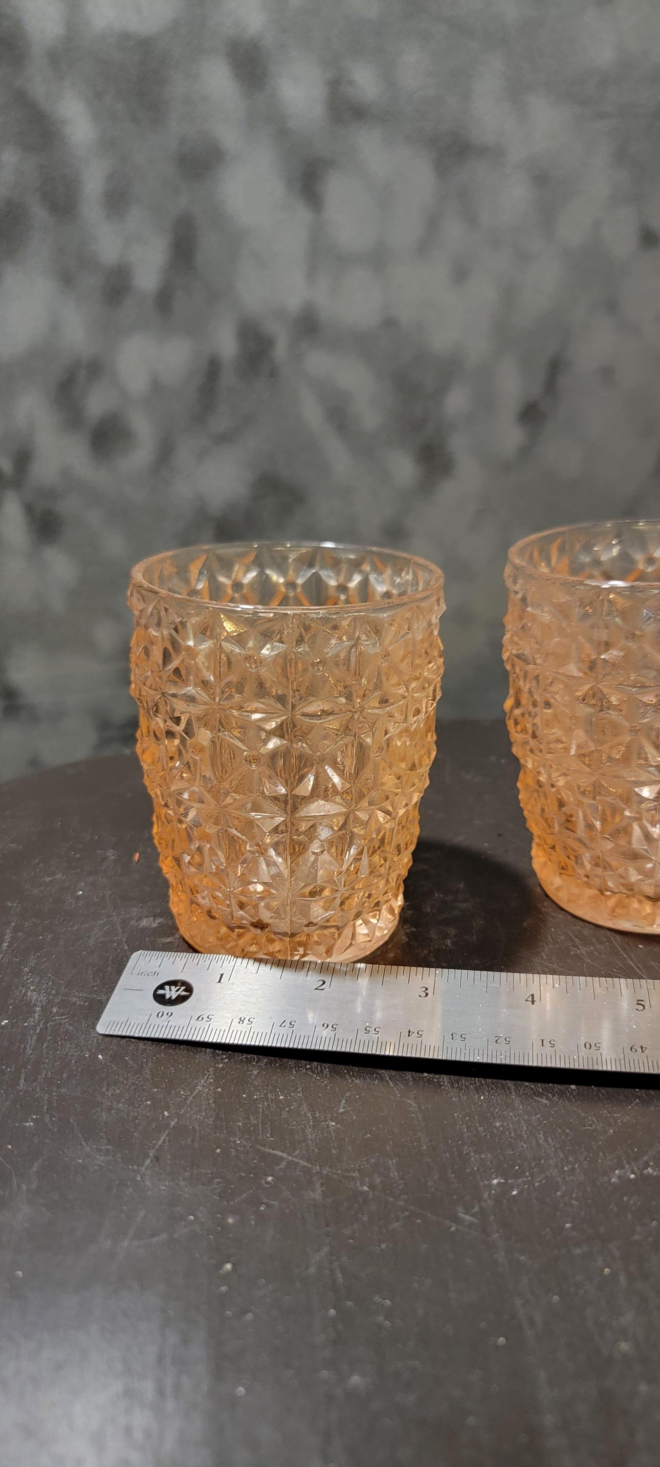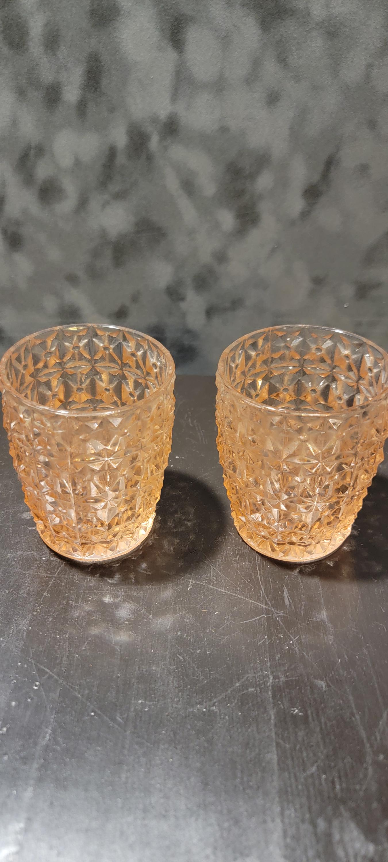 Step back into the Depression era with this delightful pair of pink Depression Glass tumblers. Featuring a geometric cube-style pressed glass pattern, these little treasures date to the 1930s–40s and remain a favorite among collectors today.