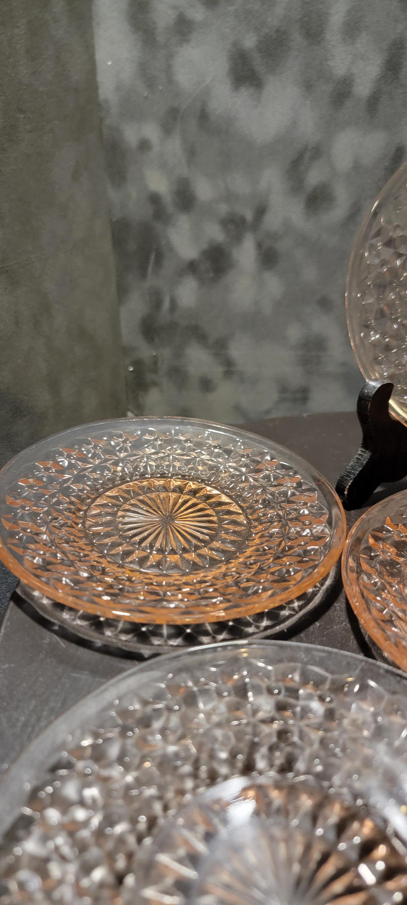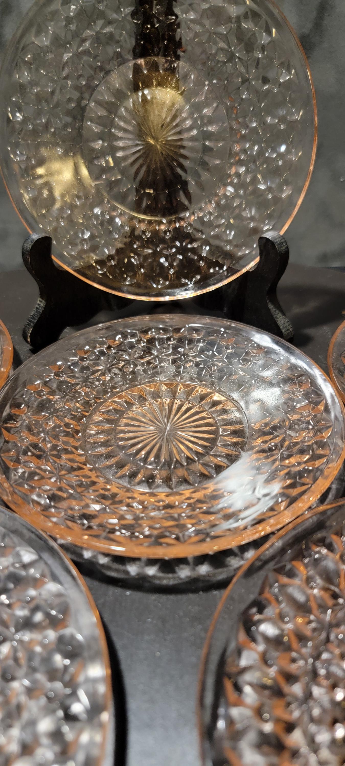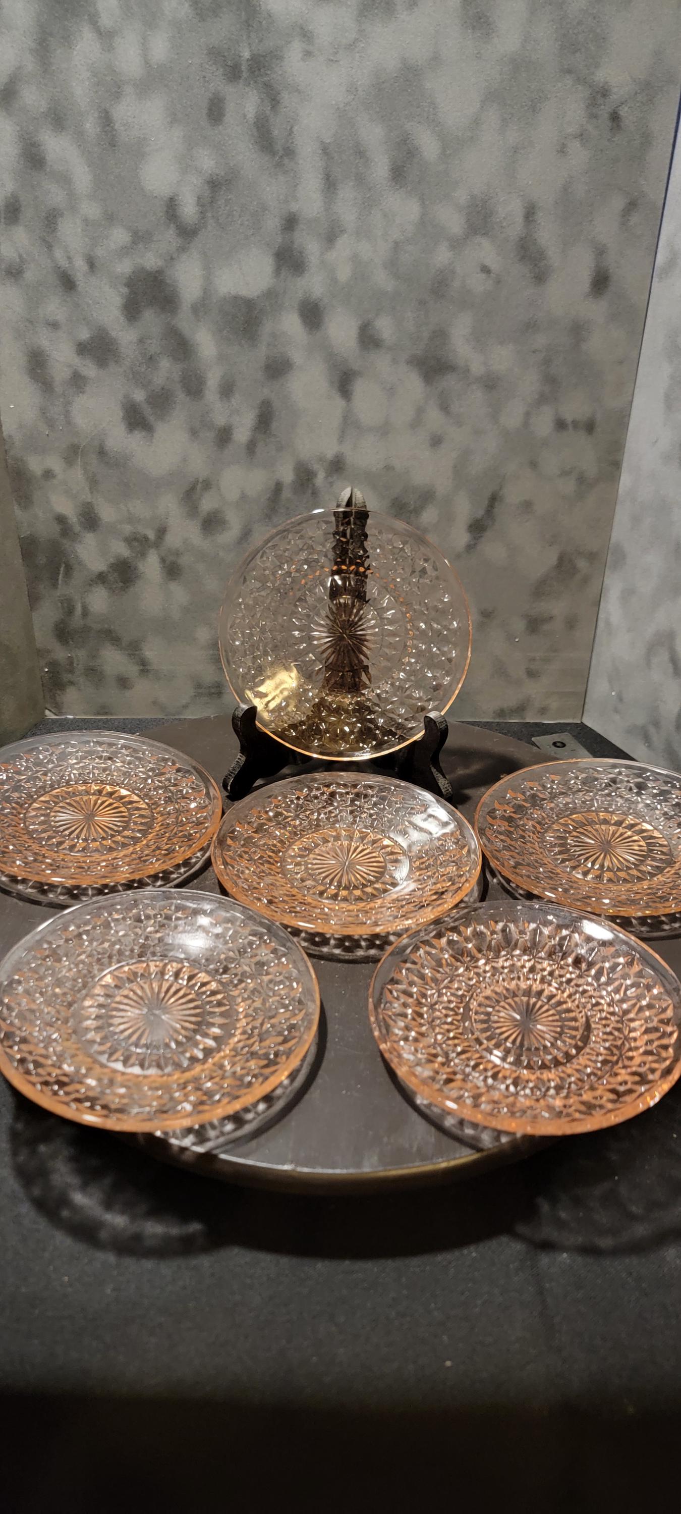 Add a piece of history to your table with this set of six pink Depression glass plates, dating back to the 1930s–1940s. Each plate features a striking pressed glass design with a diamond lattice border and radiant starburst center, catching the light beautifully with a warm pink hue.