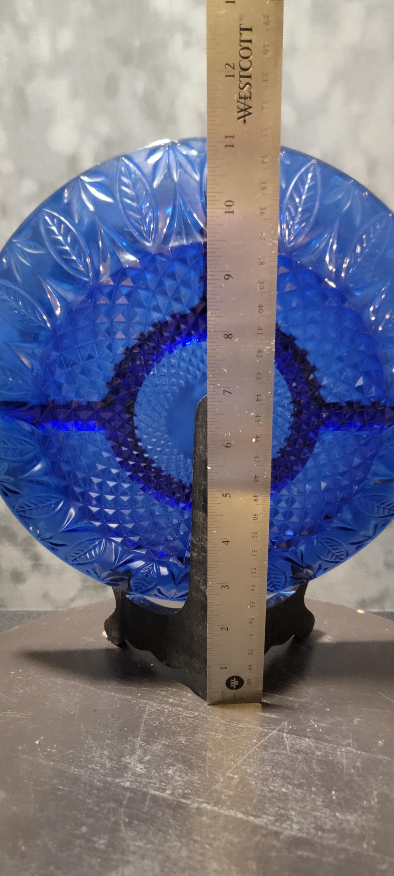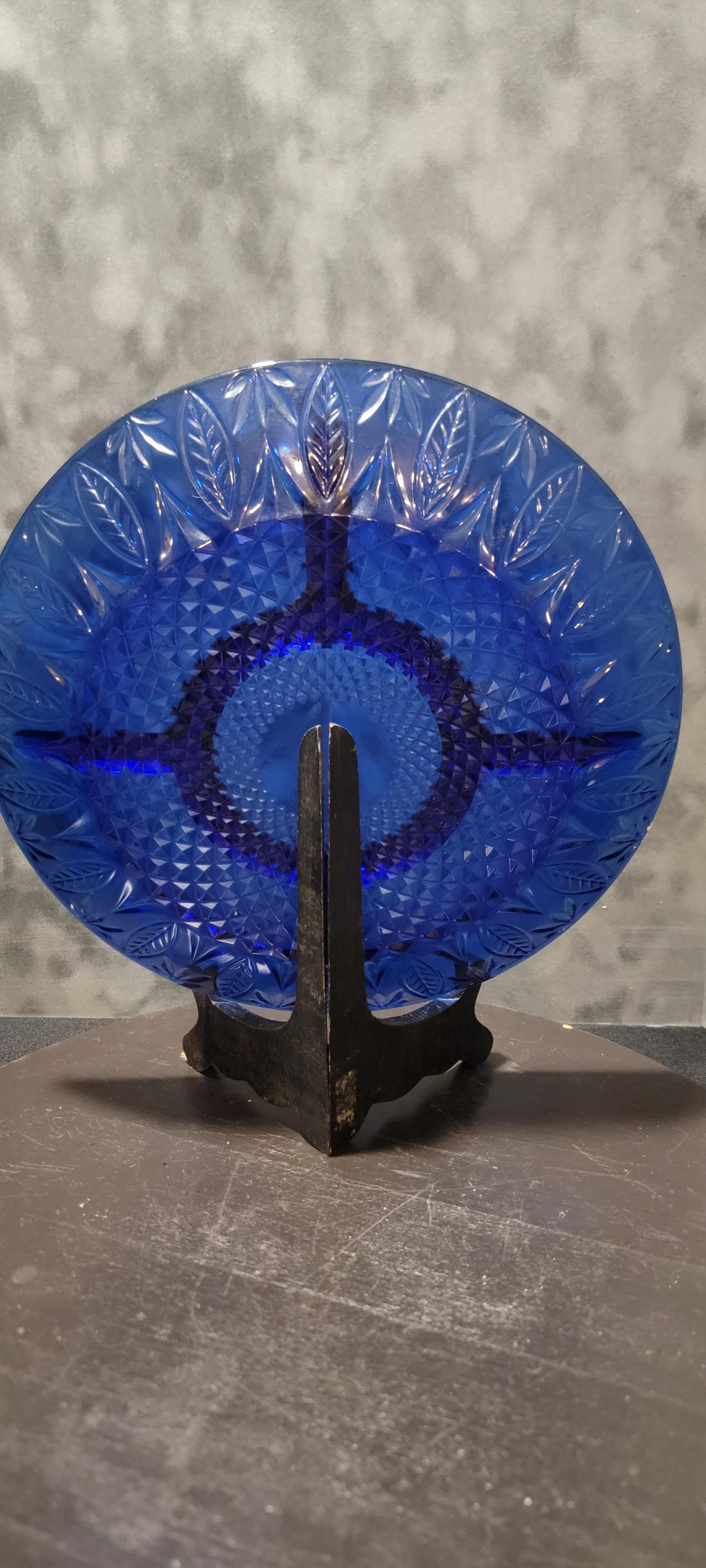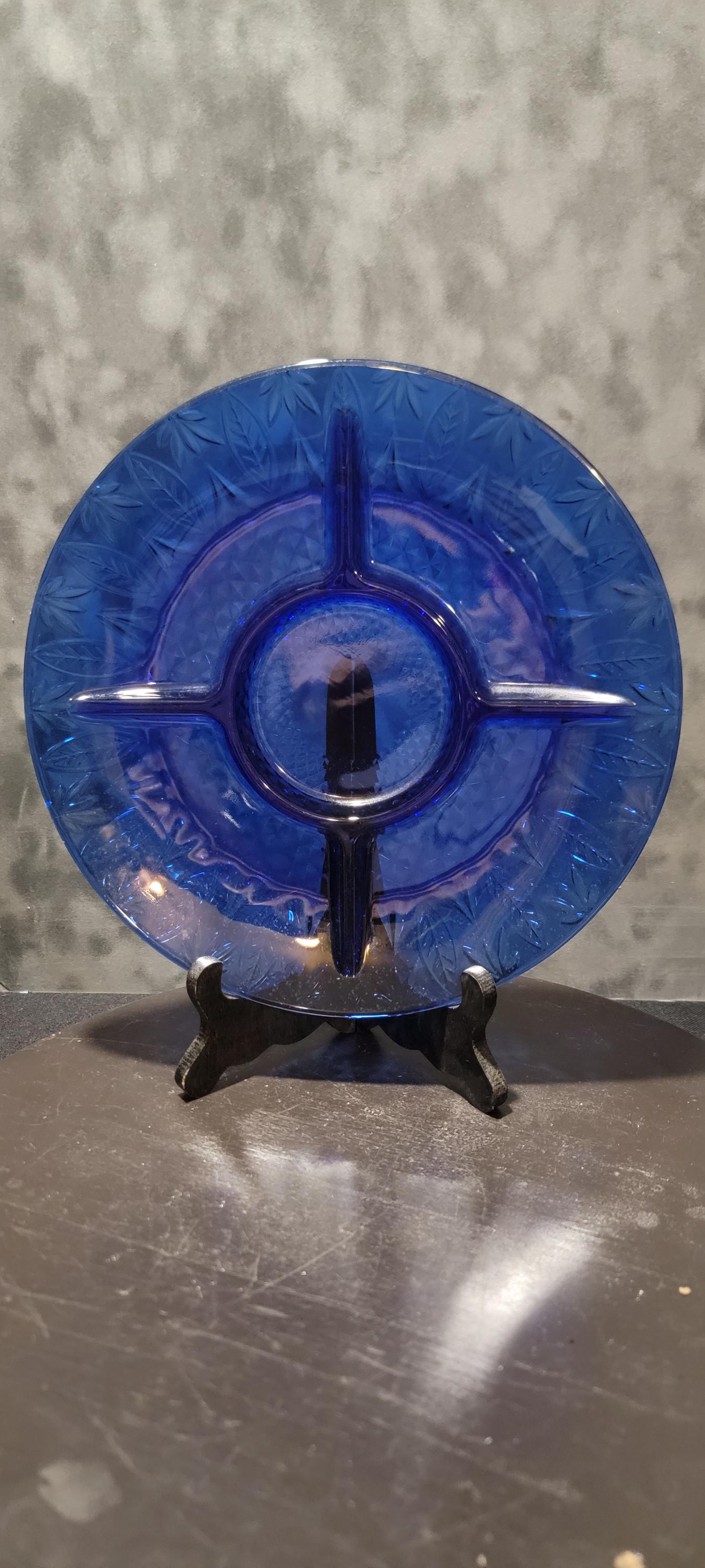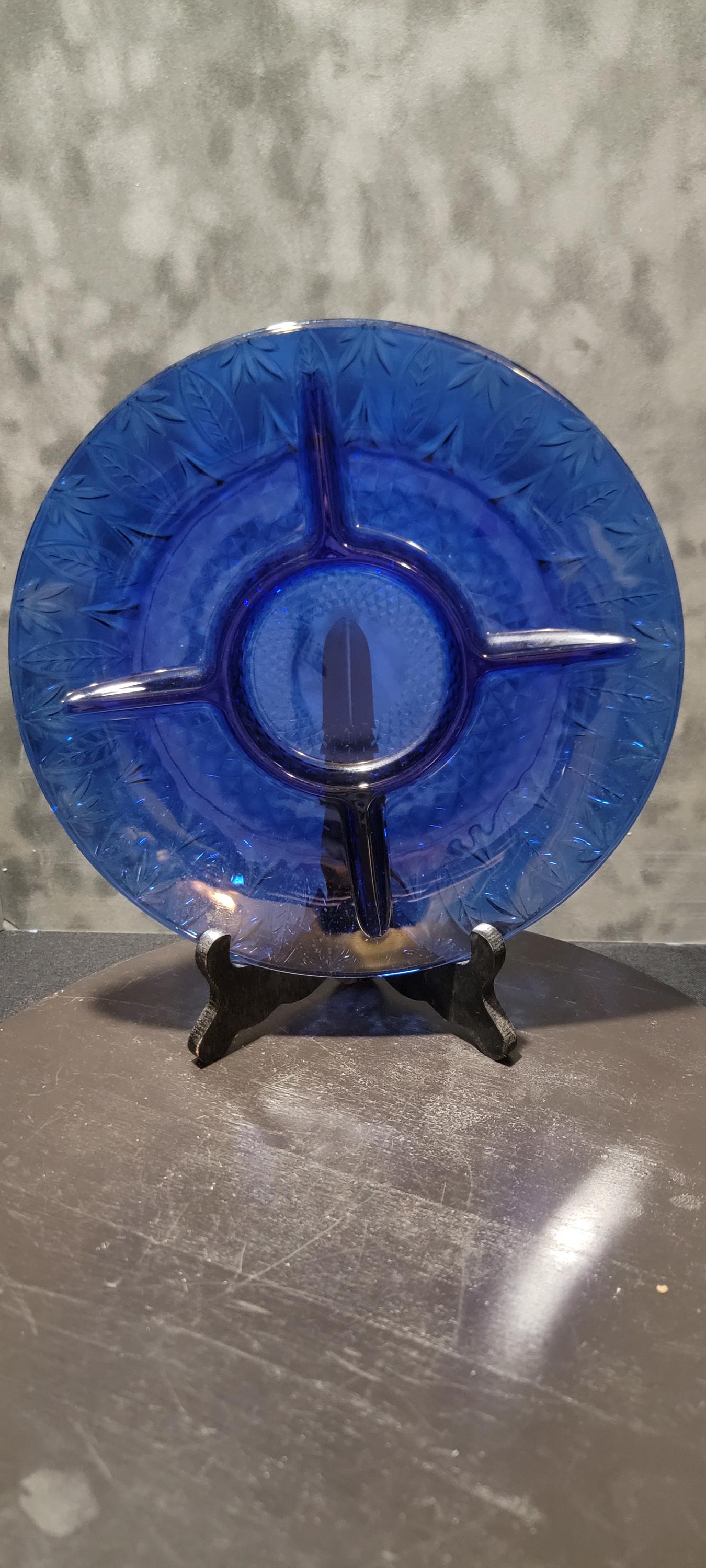 This stunning vintage plate by Avon features rich cobalt blue pressed glass in a unique 4-section divided design. With its textured Art Deco-style rim and bold color, it's both functional and collectible — perfect for serving relishes, candies, or as a striking display piece in any retro or farmhouse kitchen.
