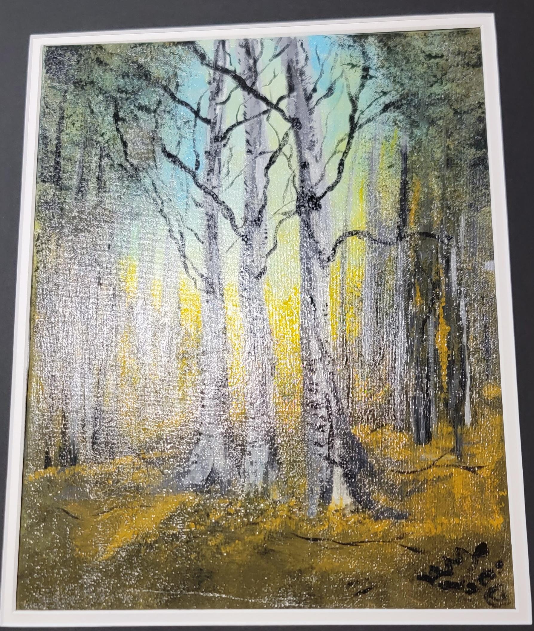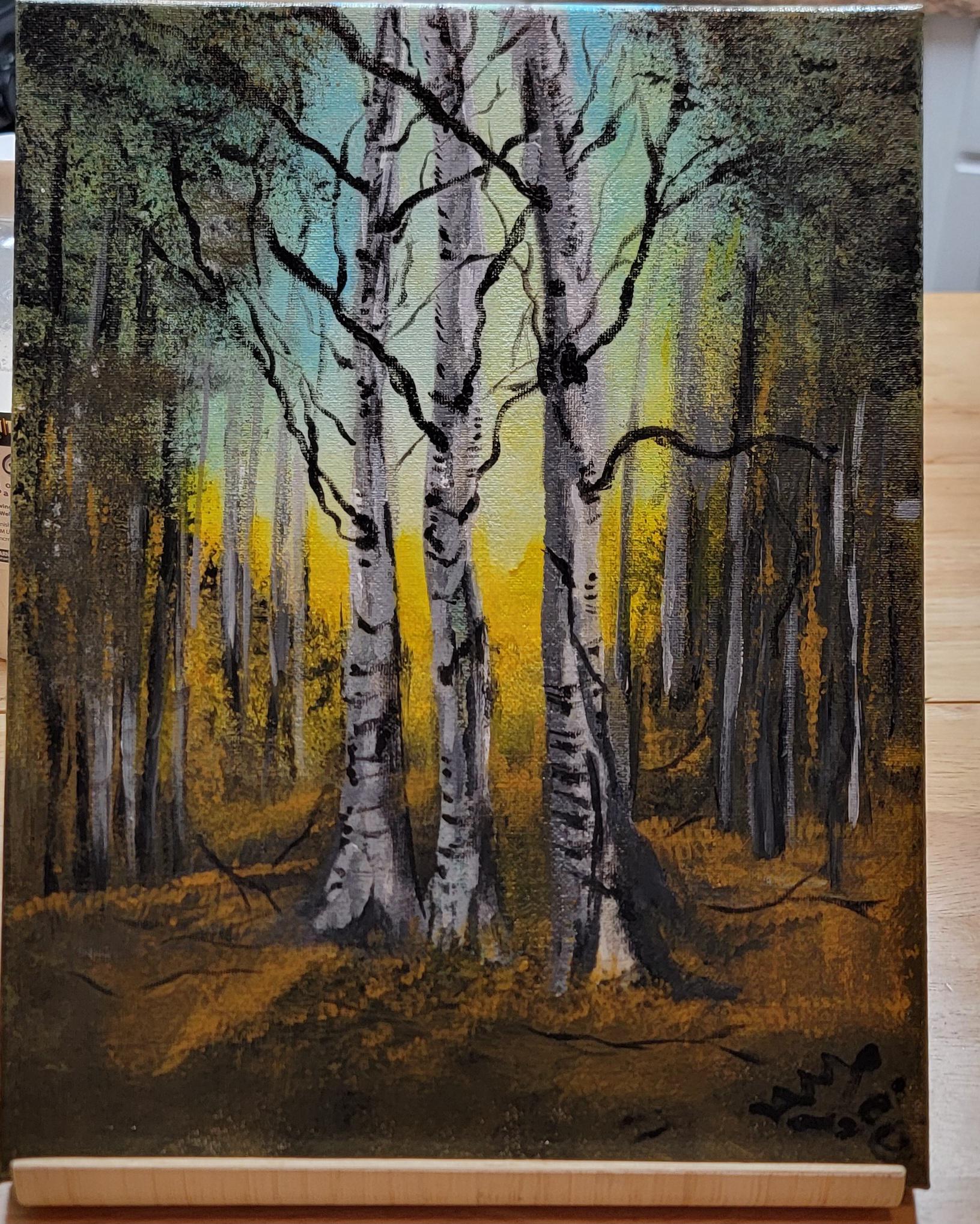 This award-winning original painting captures the serene glow of sunlight filtering through a grove of birch trees — a peaceful, nature-inspired moment frozen in color and light.