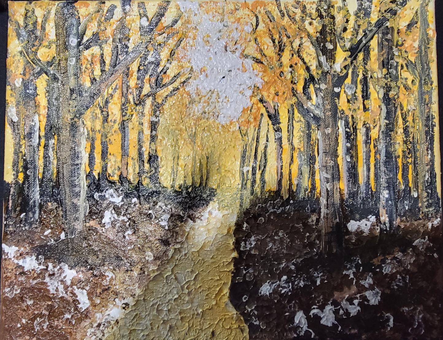 This award-winning original acrylic painting celebrates the beauty of autumn and the peace of a woodland path bathed in golden light. The richly textured brushwork and layered depth invite the viewer to wander among the trees — where warmth meets serenity.