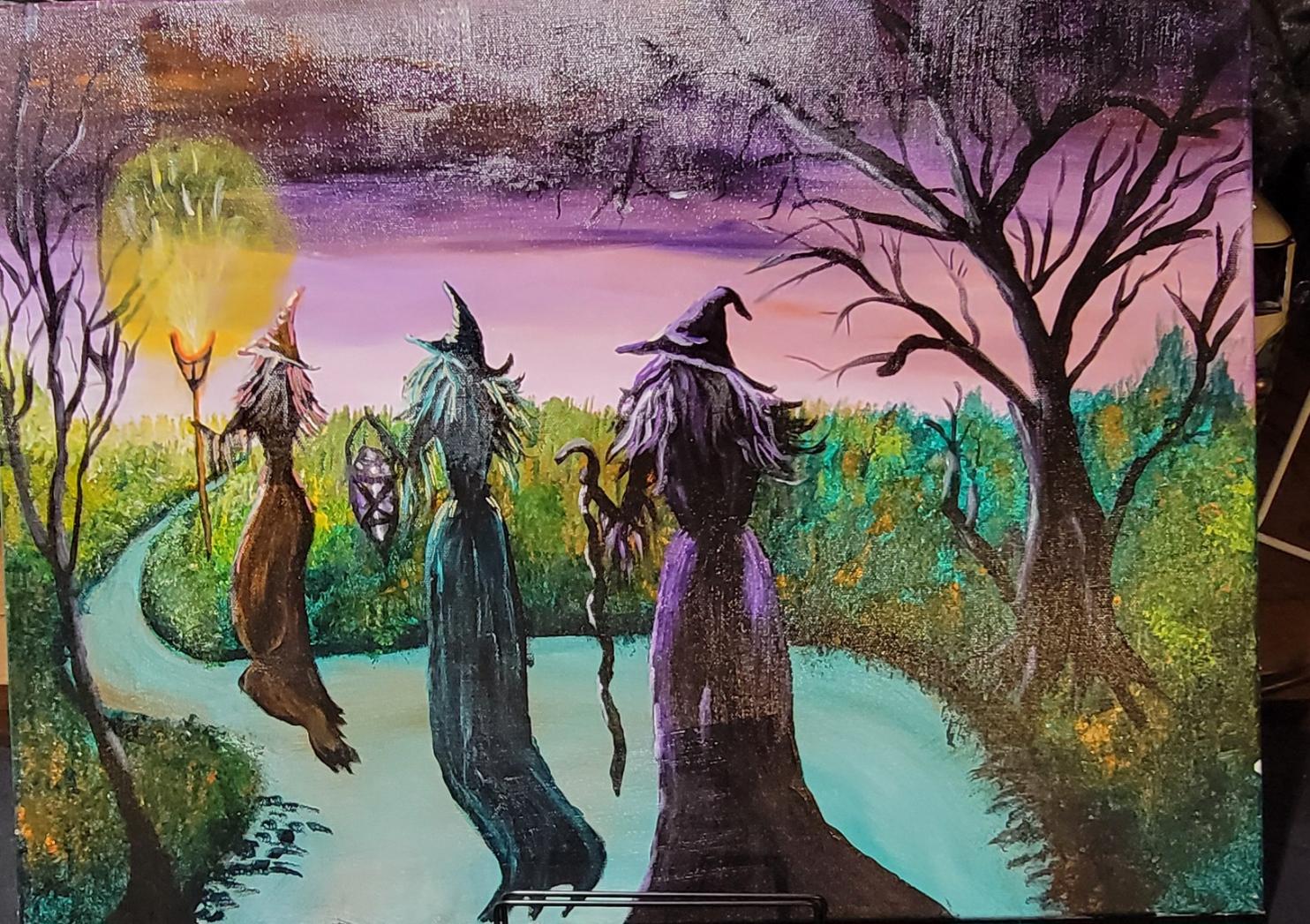 The Gathering captures the moment when three witches meet beneath a glowing moon, lanterns and staffs illuminating their secret woodland path. Painted in rich purples, teals, and golden light, the scene blends fantasy, mystery, and enchantment — perfect for collectors of mystical or gothic art.