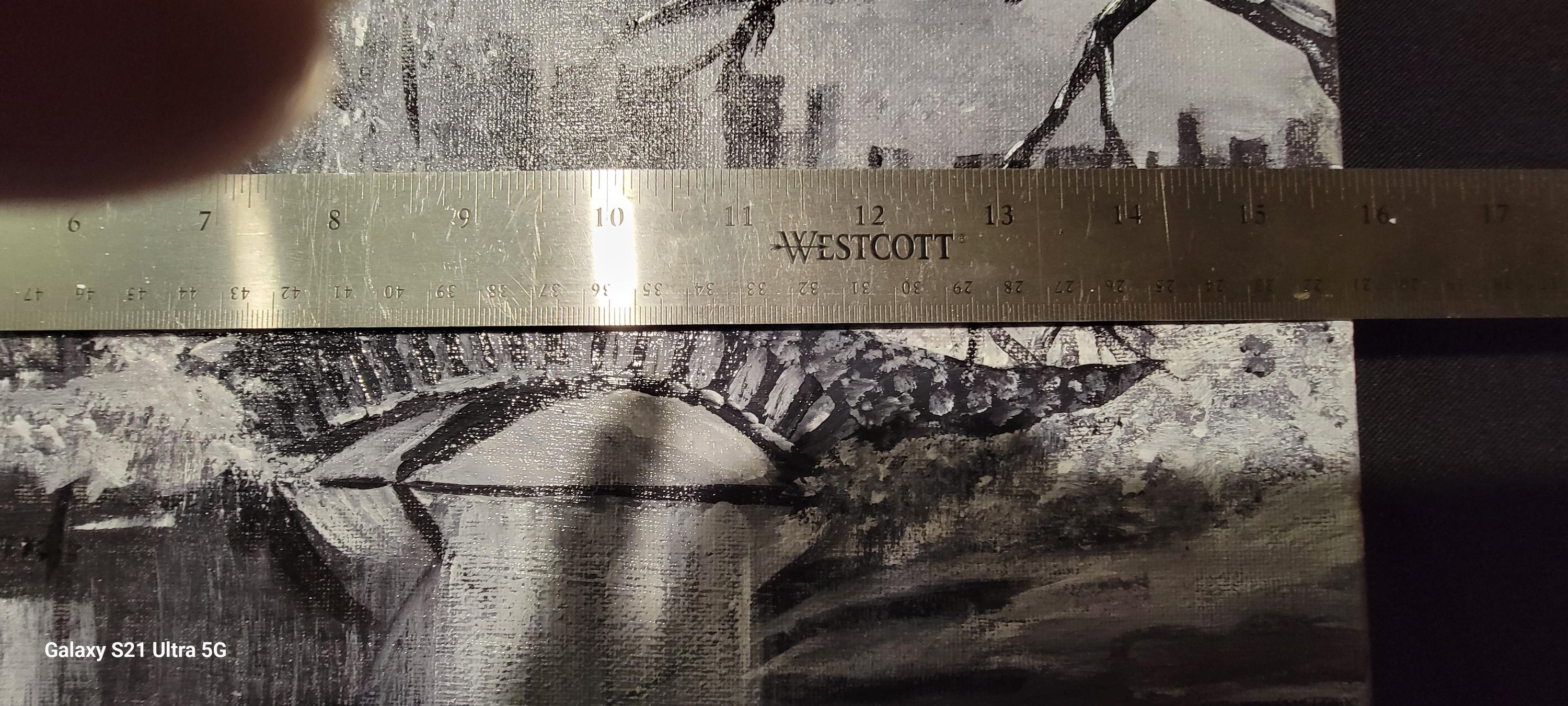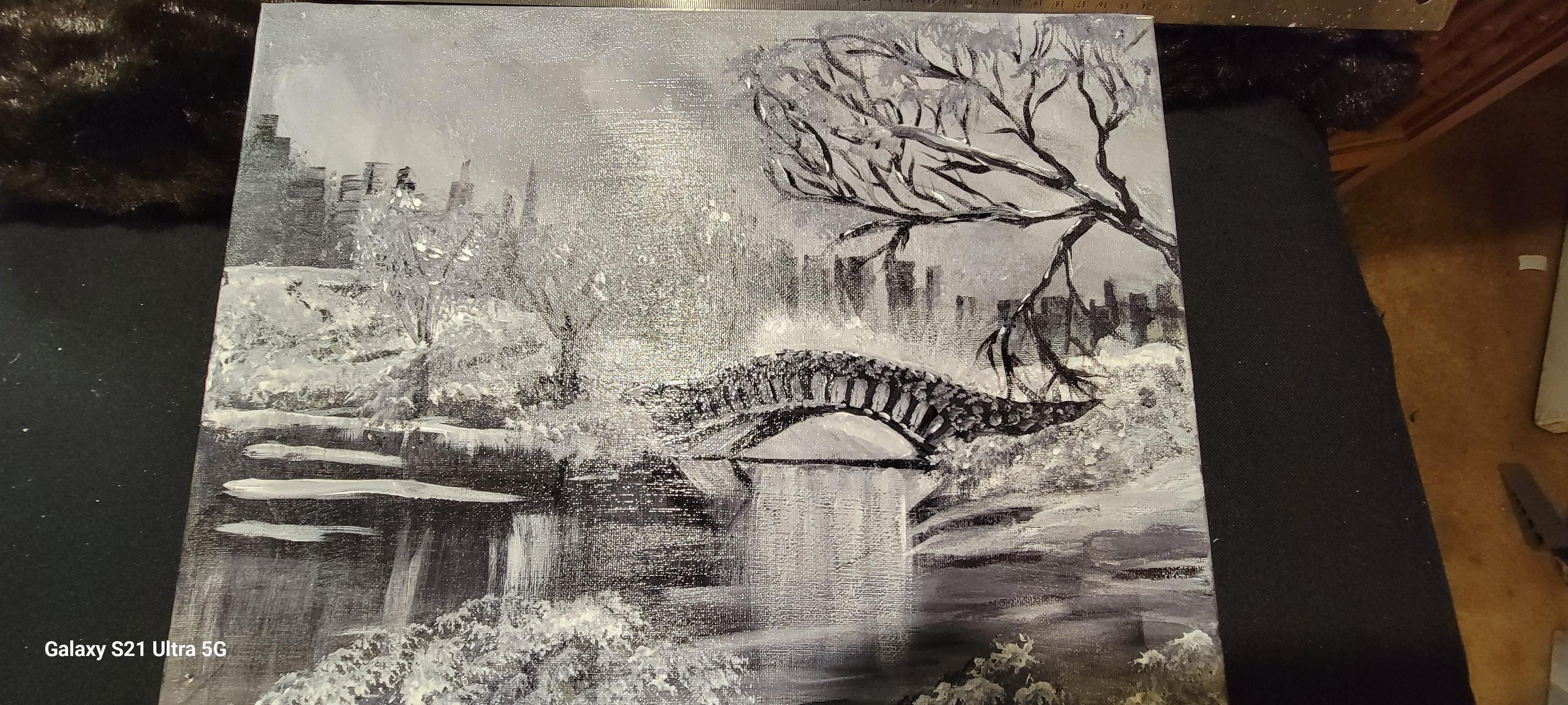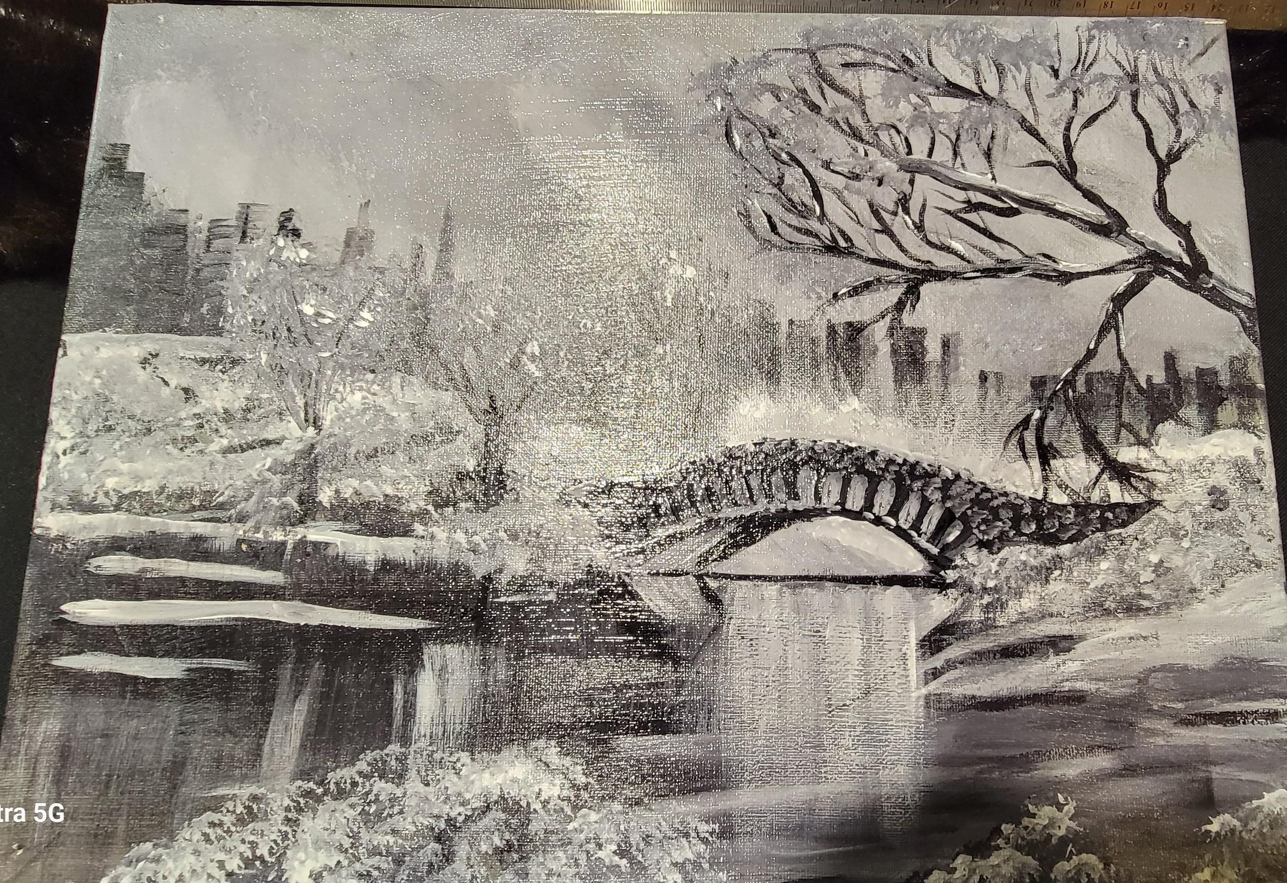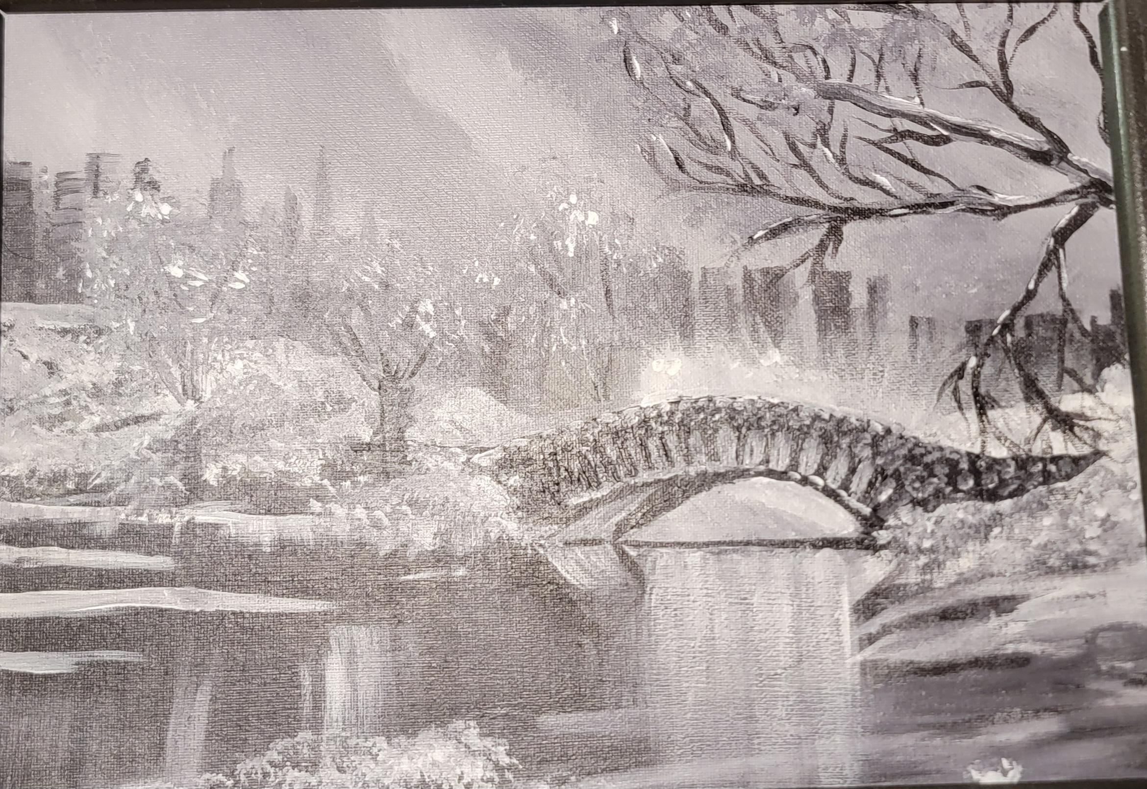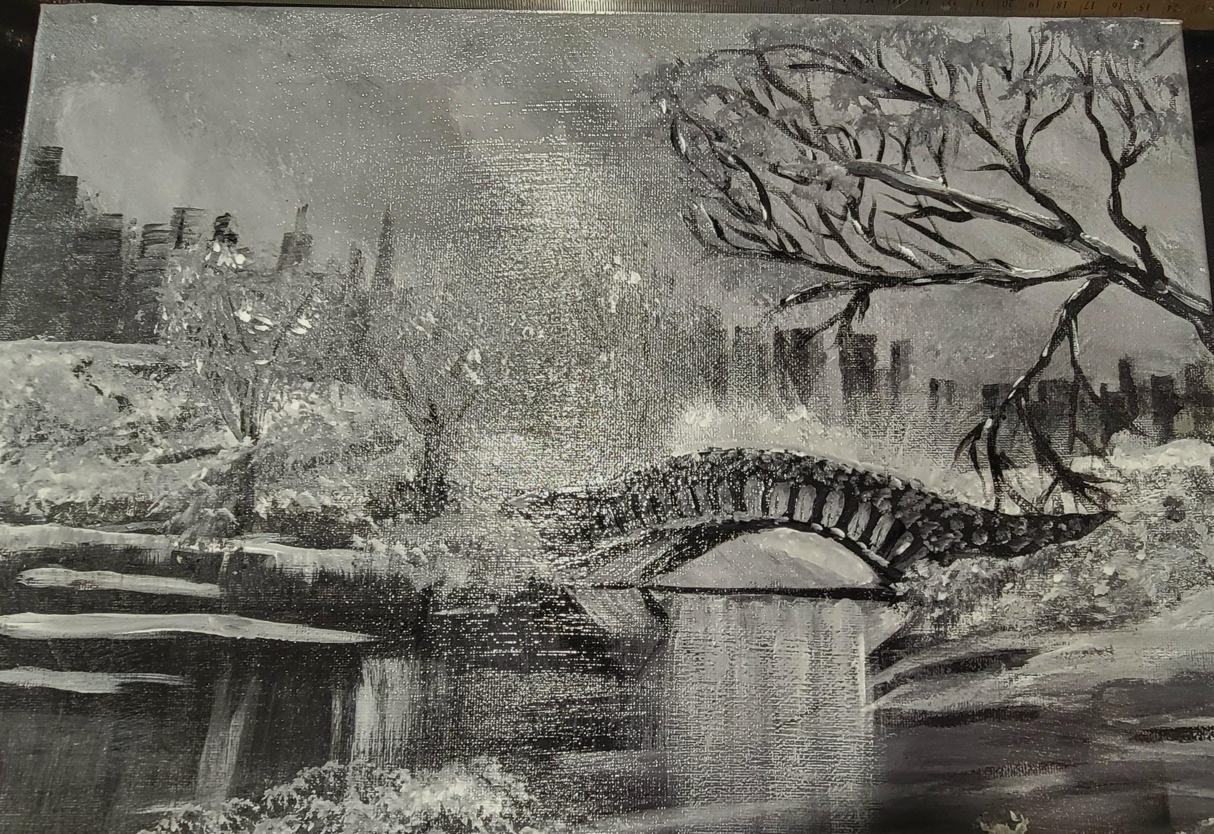 “Silent City” is an award-winning original acrylic painting, rendered in beautiful monochrome tones that capture the stillness of winter.