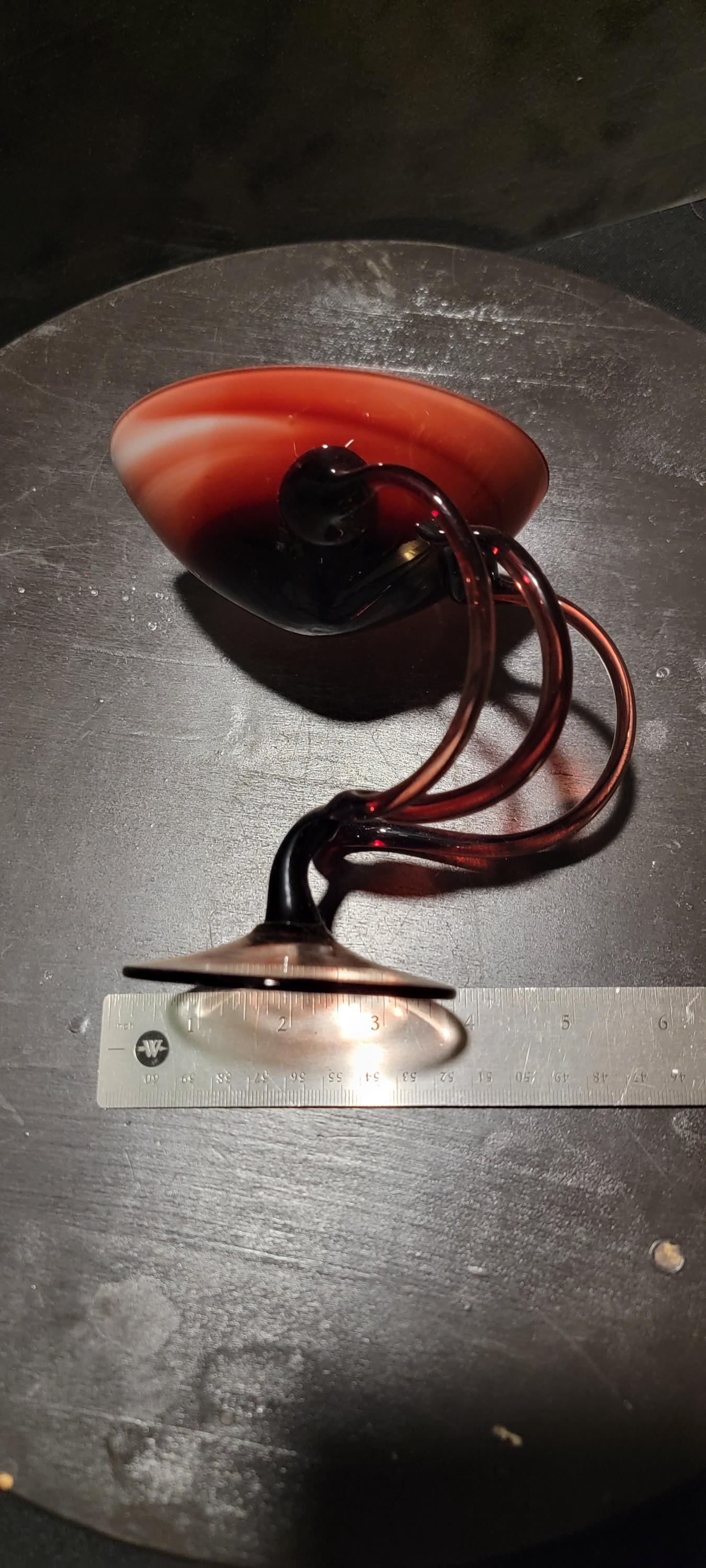 The piece features a dramatic red-to-black gradient with graceful, curved lines and a clear glass base that reflects light beautifully. Its organic, modern form makes it both an art object and a conversation piece.