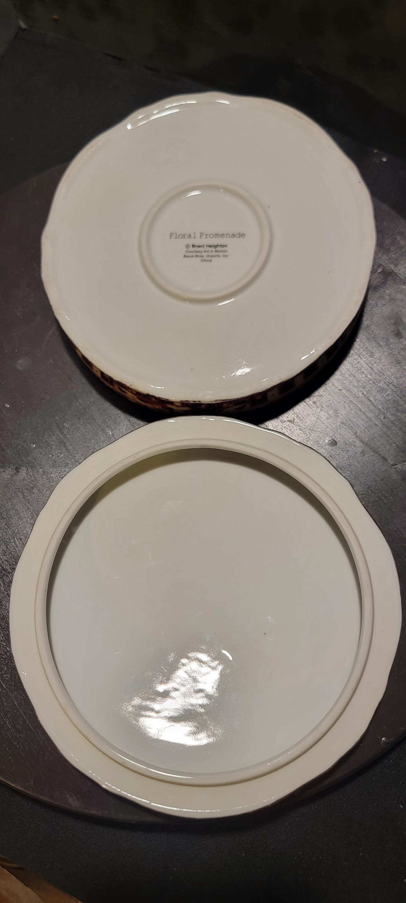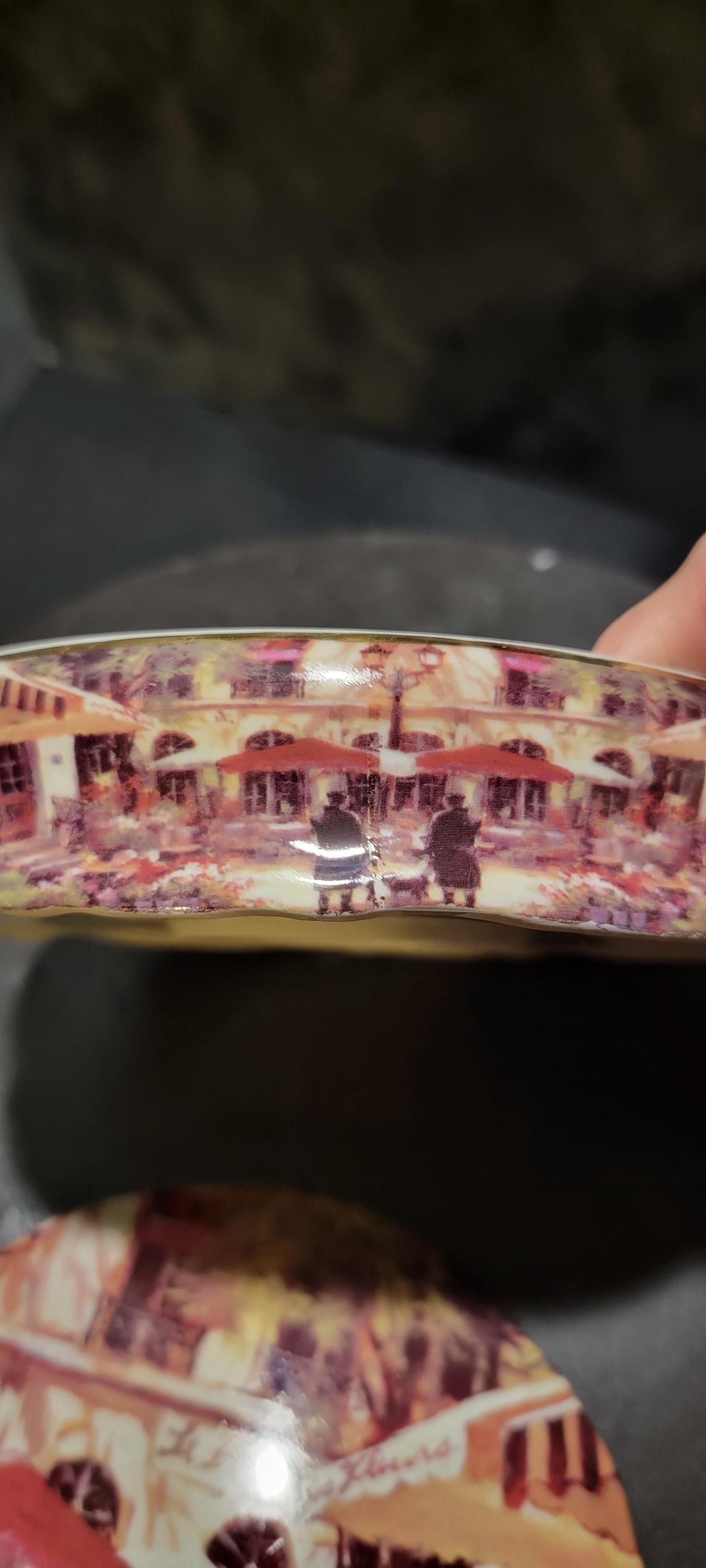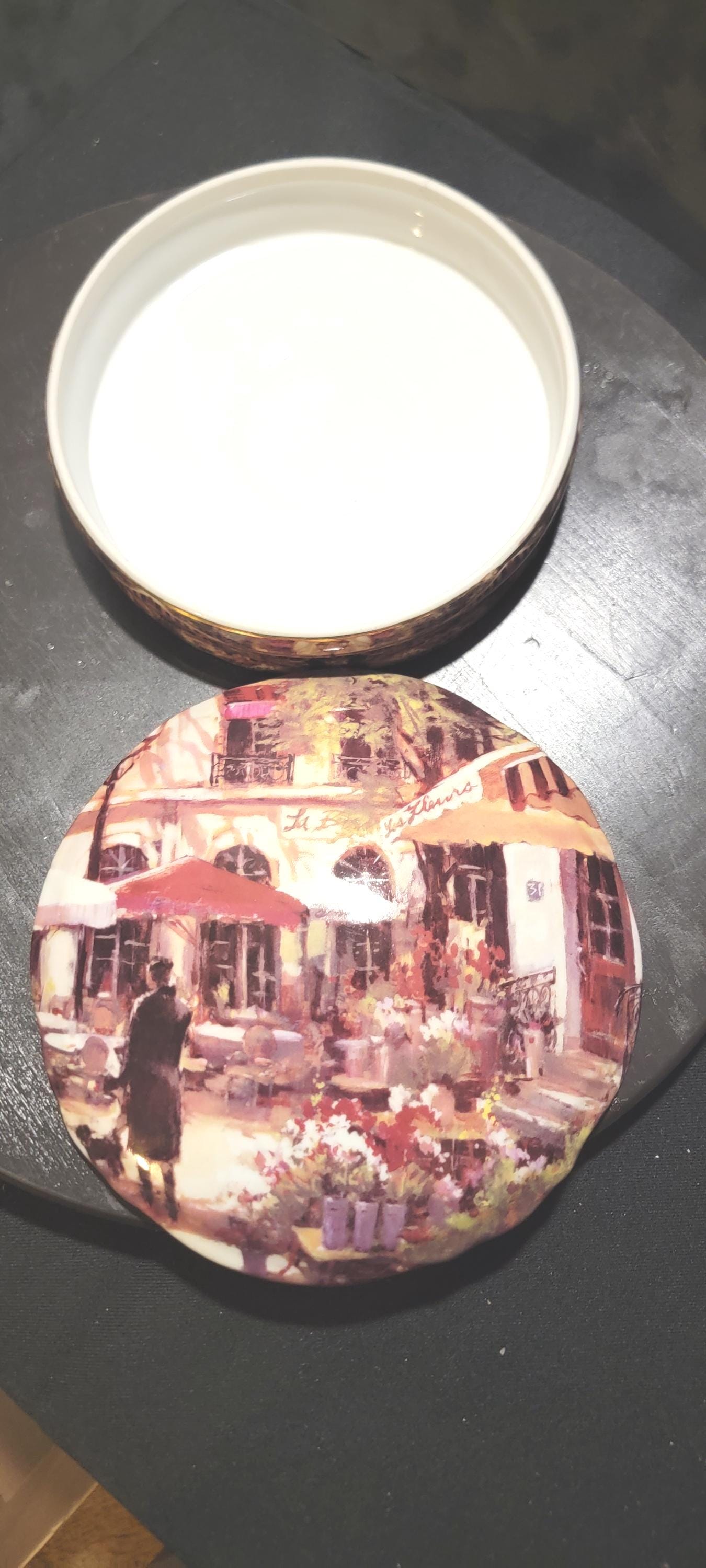 This charming porcelain trinket box features “Floral Promenade”, a lovely artwork by renowned Canadian artist Brent Heighton. The vivid street scene captures a bustling European flower market with rich colors, soft brushstrokes, and Heighton’s signature impressionistic style.