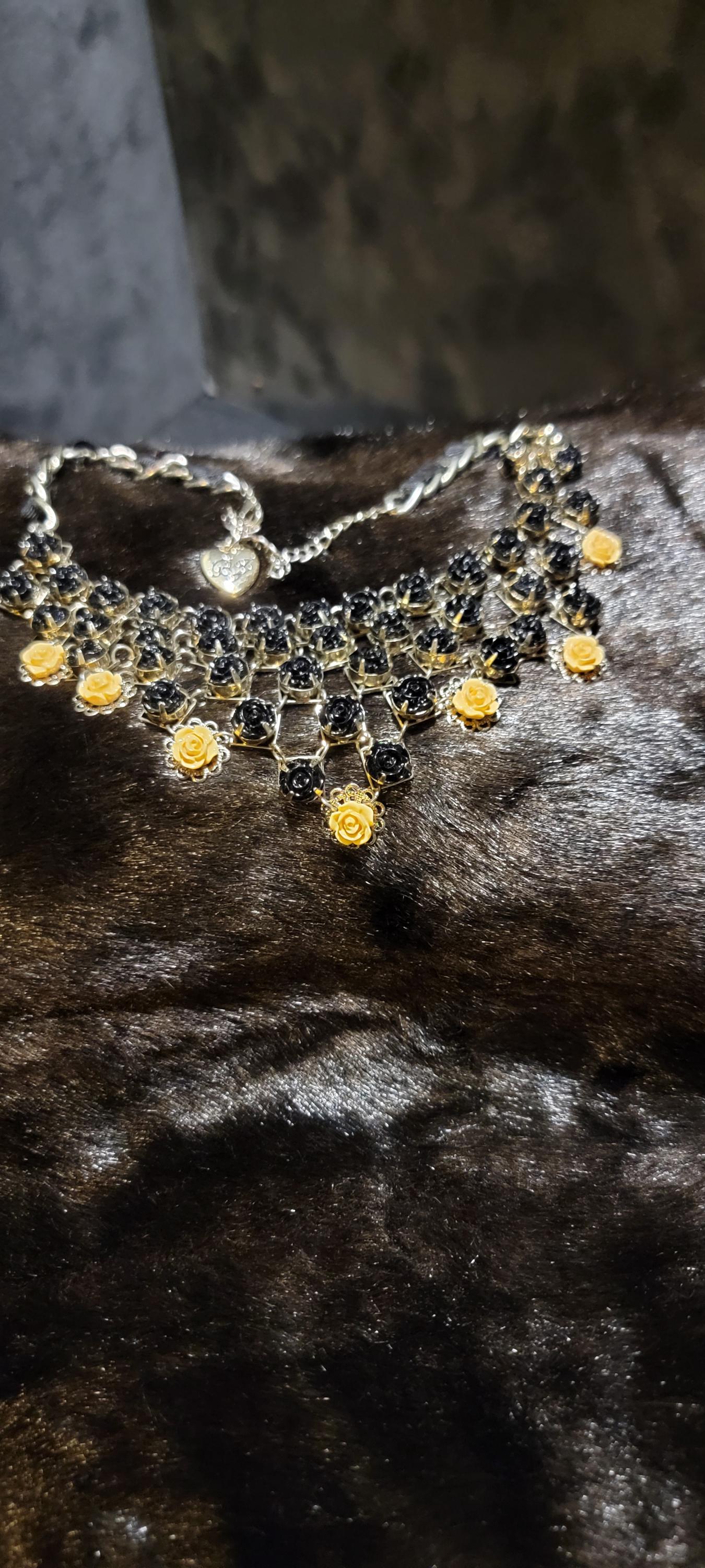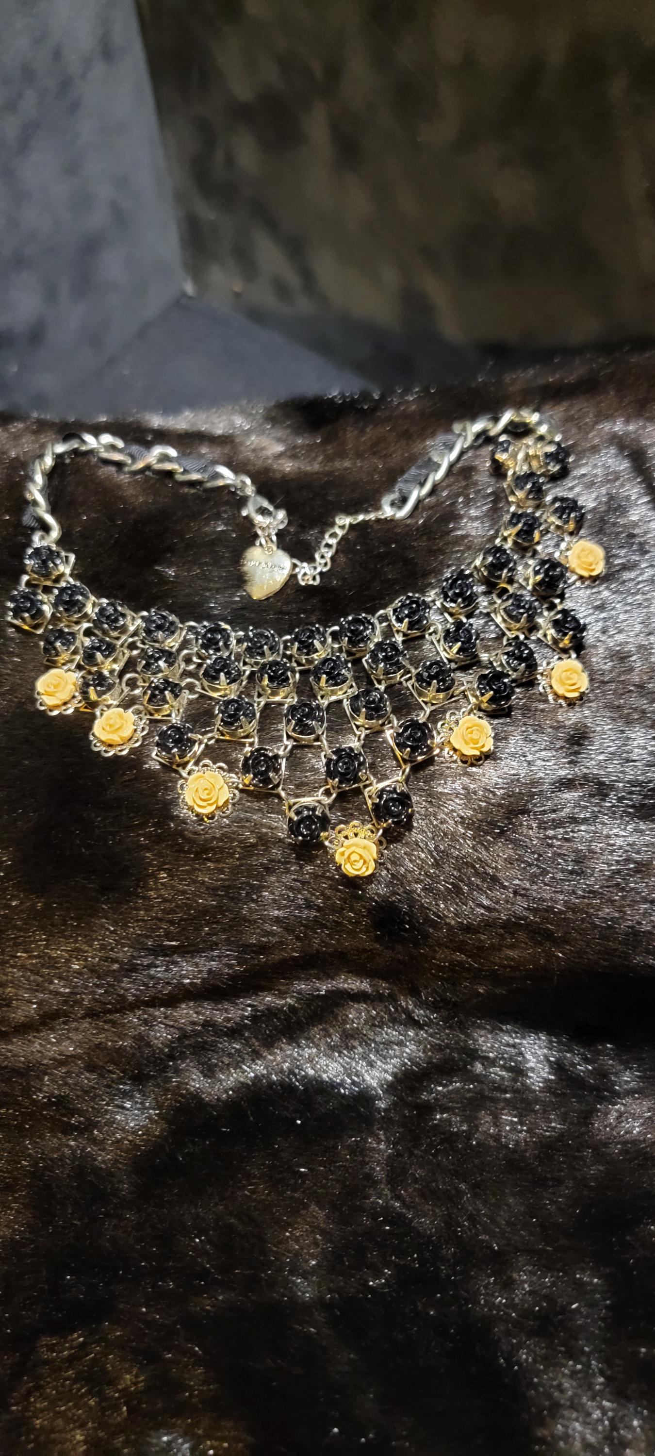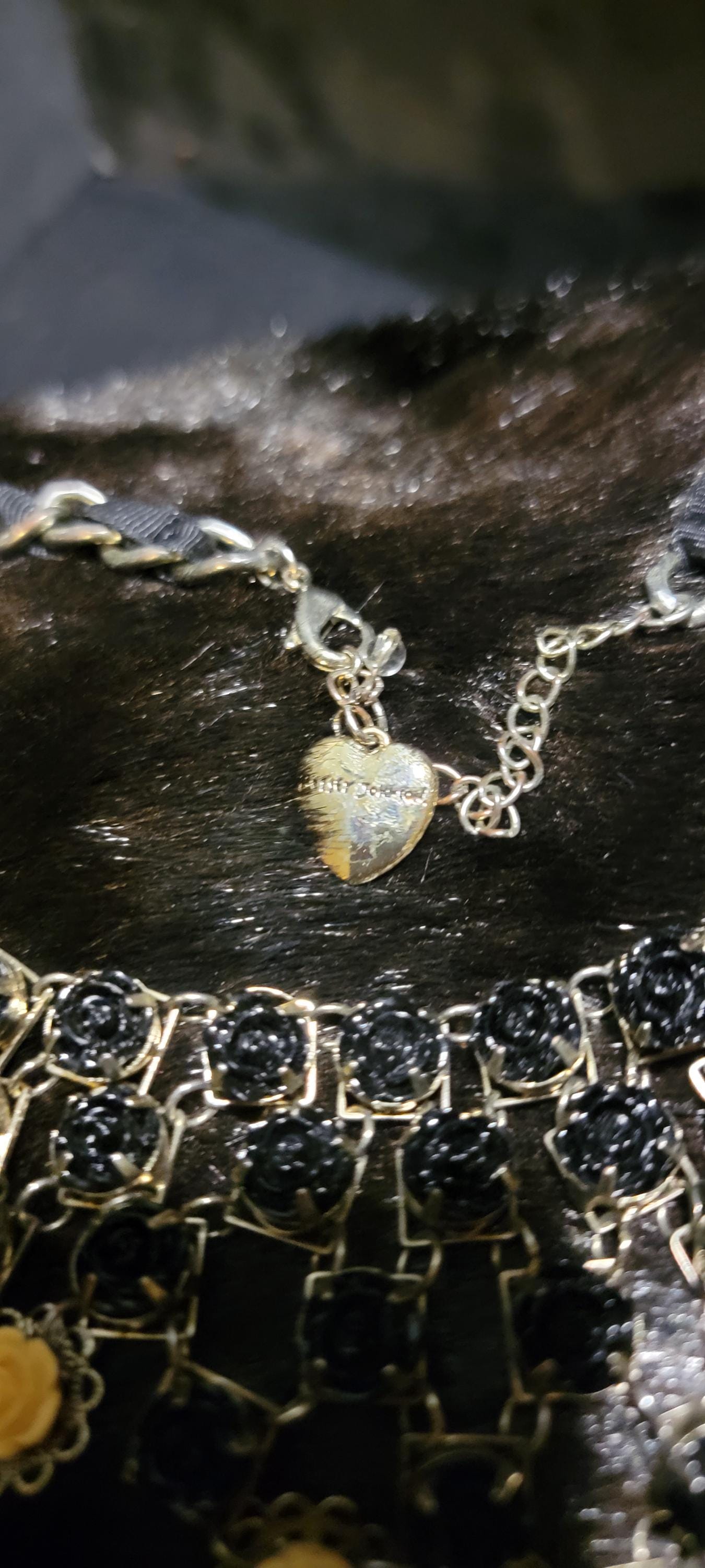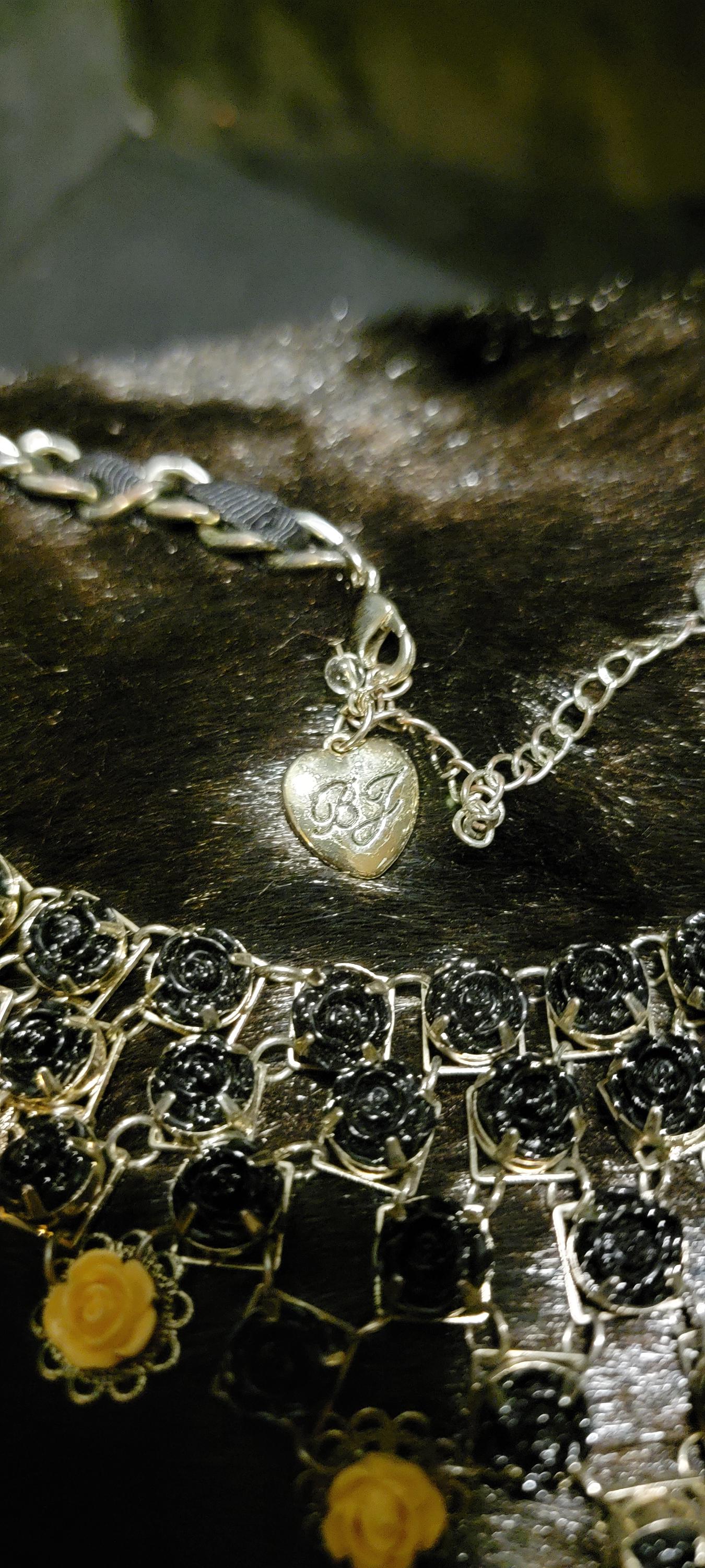 Add a bold touch of vintage Betsey flair to your look with this stunning black and gold rose bib necklace. Designed during Betsey Johnson’s signature late 2000s Romantic Goth period (circa 2008–2013), this piece features intricately sculpted black resin roses accented with golden blooms, all linked together in a dramatic tiered bib style. The necklace fastens with a secure lobster clasp and features the iconic Betsey Johnson heart charm, engraved with “BJ” on one side and “Betsey Johnson” on the reverse.