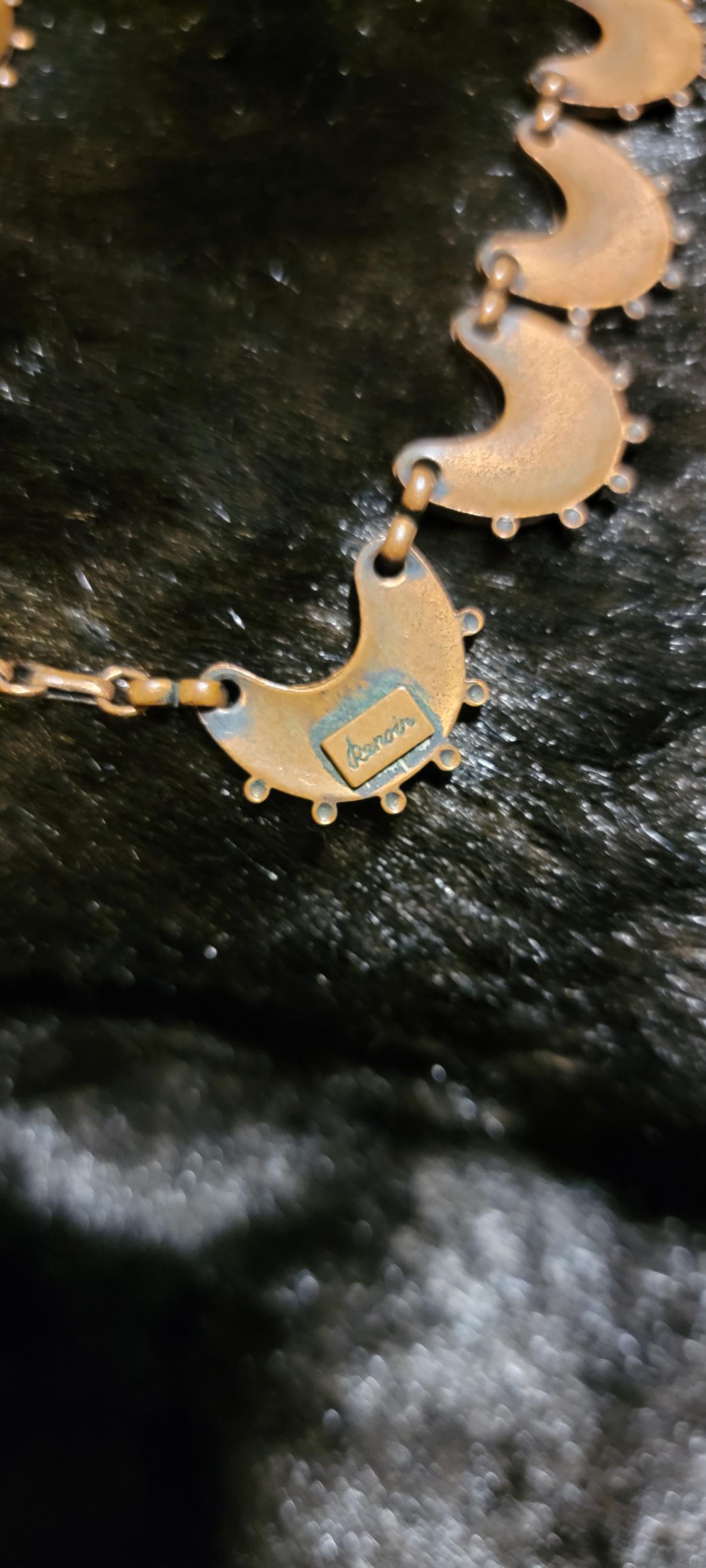 A striking piece of mid-century artistry from Renoir of California, this vintage copper necklace features a bold crescent link design with softly oxidized accents. Each curved segment is finished in a warm copper tone, connected by articulated links for comfortable wear and fluid movement. The adjustable chain ends with Renoir’s signature teardrop charm.