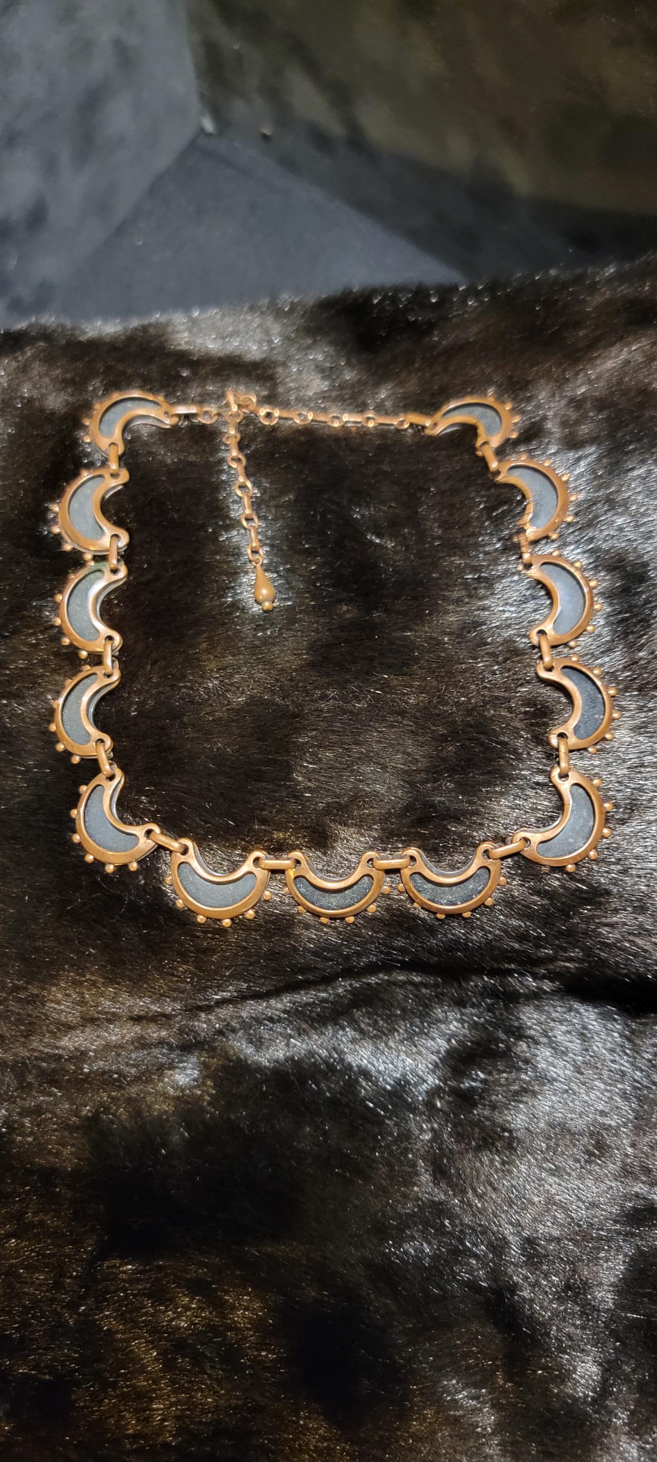 Renoir jewelry, produced between 1946 and 1964, is highly collectible for its craftsmanship and iconic mid-century modern aesthetic. This necklace is a wonderful statement piece that embodies the era’s sleek design sensibility and artisan metalwork.