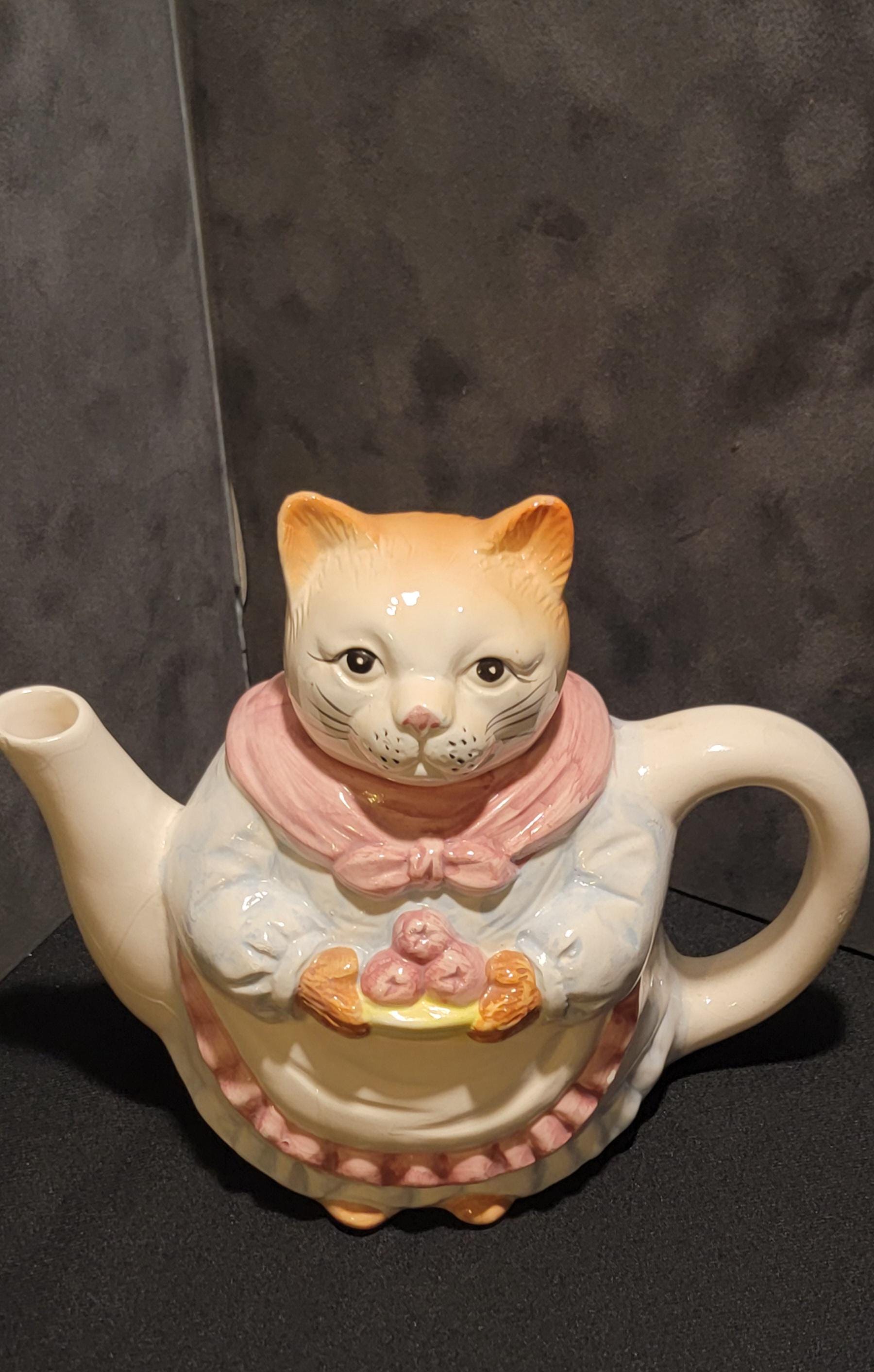 Add charm and whimsy to your kitchen with this adorable vintage ceramic cat teapot. Featuring a sweet anthropomorphic kitty dressed in a pastel bonnet and apron, this piece is perfect for cat lovers, cottagecore collectors, and whimsical kitchen décor enthusiasts.
