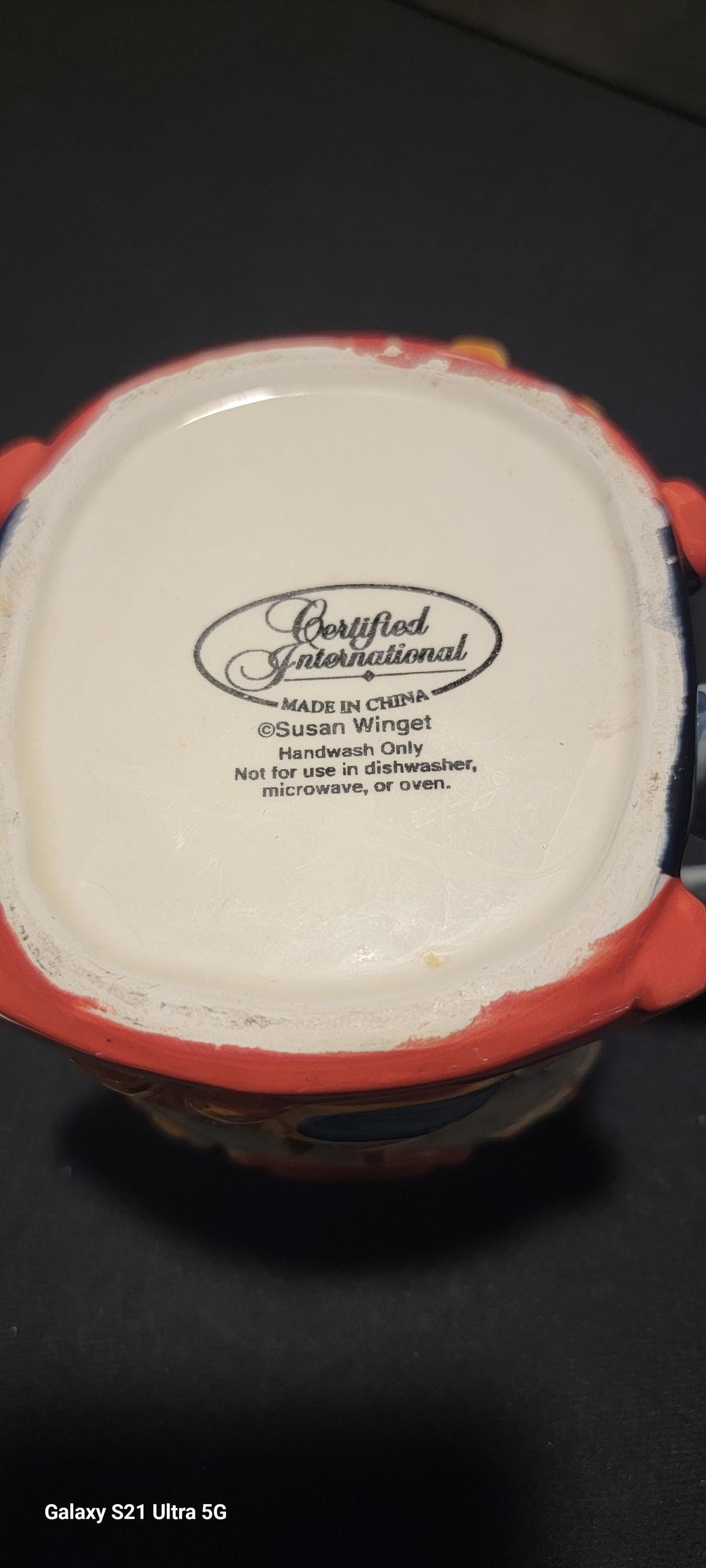 This charming Certified International coffee mug, designed by Susan Winget, features a beautifully detailed 3D cottage scene with a rocking horse accent on the front. Richly hand-painted with bows, windows, and textured elements, this mug has a cozy, nostalgic feel and doubles as a decorative collectible.