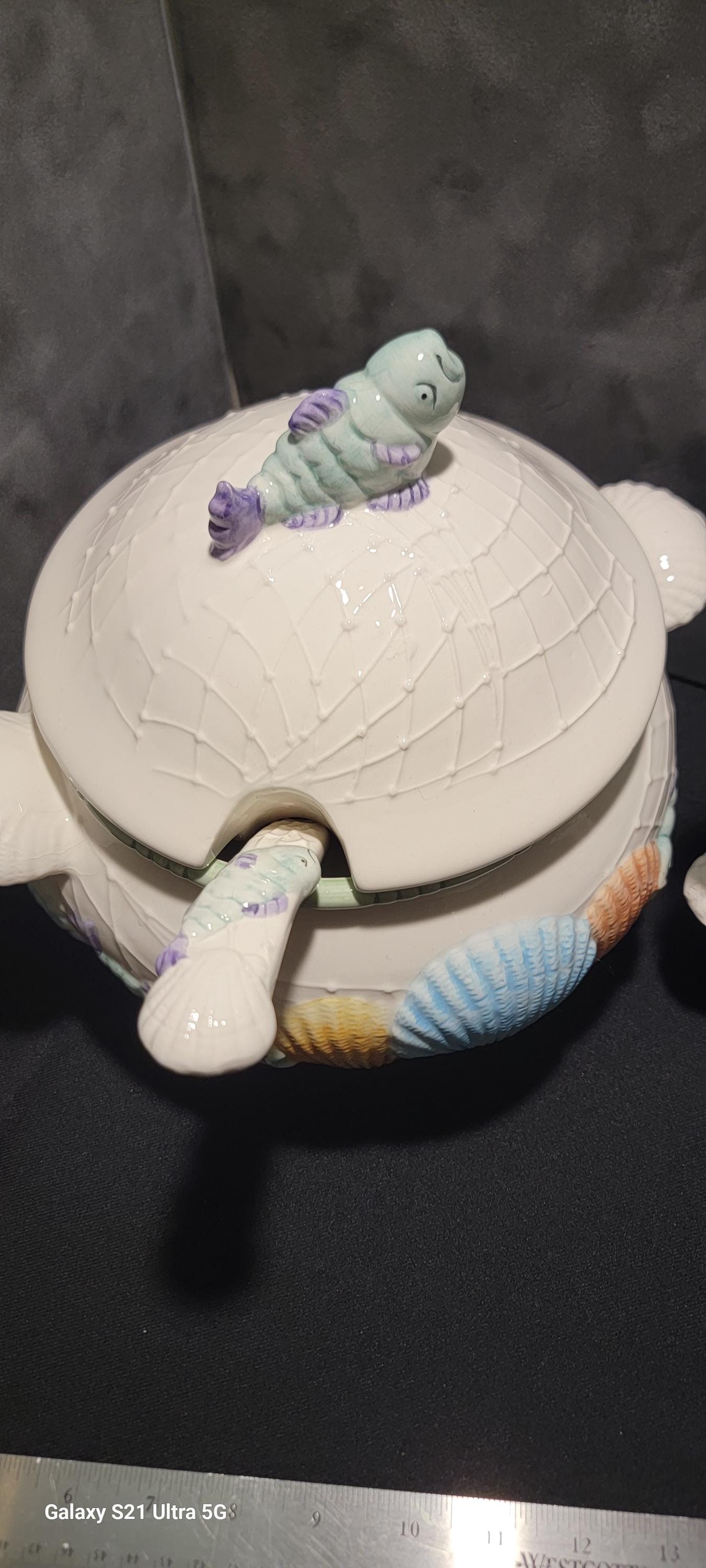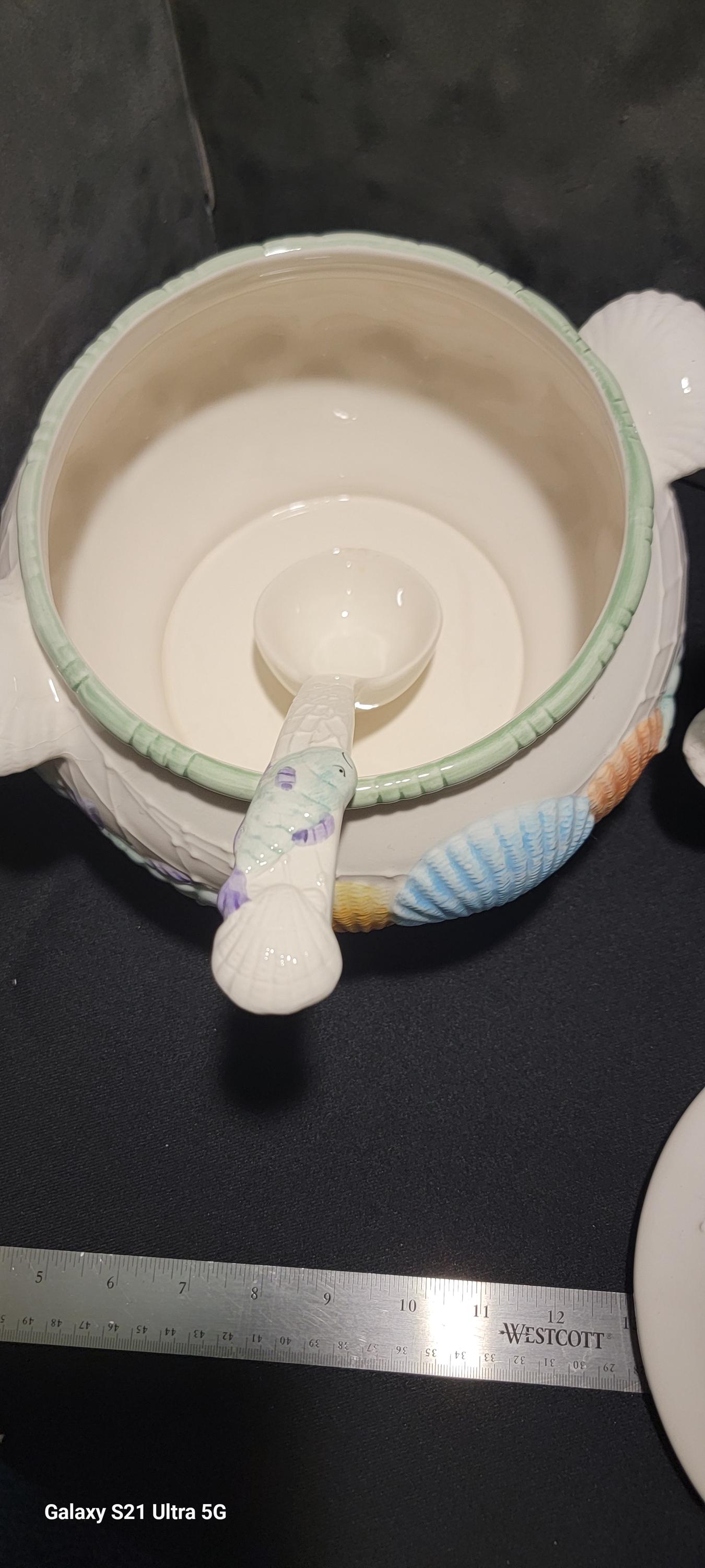 1 soup tureen with fishnet-patterned lid and fish finial handle