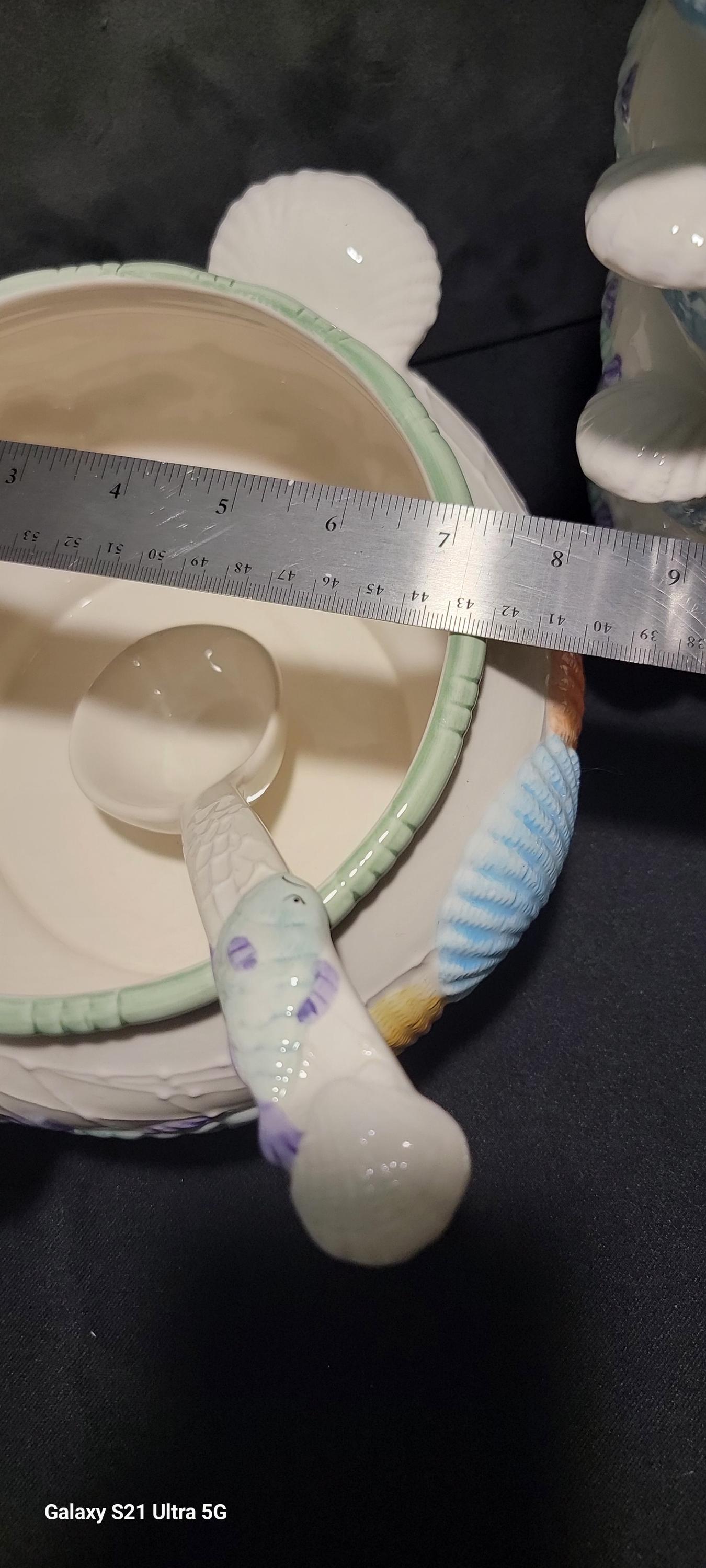 Ideal for serving chowder or seafood bisque, or for displaying as a statement centerpiece in a coastal kitchen or dining space.