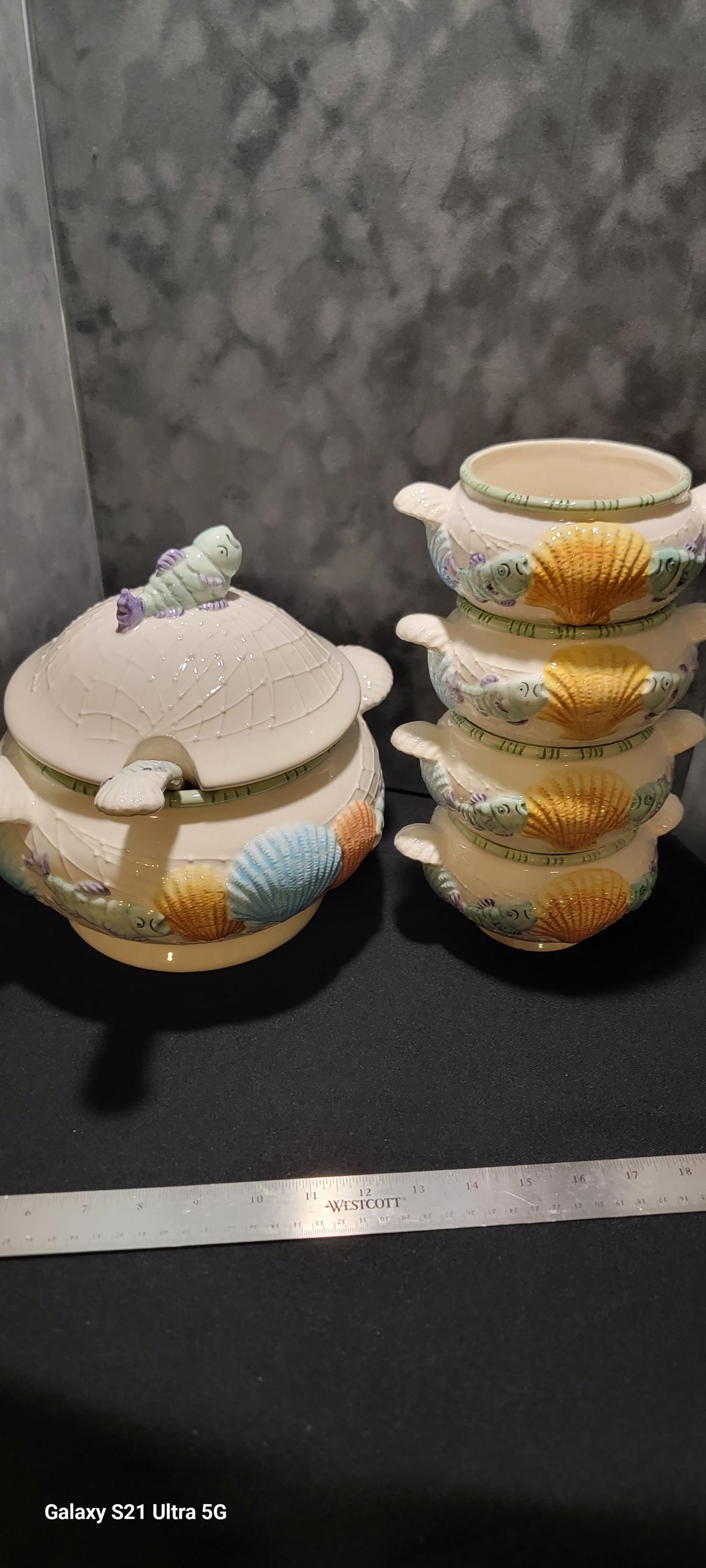 This striking vintage Water’s Edge serveware set by Himark showcases a beautifully detailed coastal seashell and fish design, perfect for beach house décor or nautical-inspired entertaining. The set includes a lidded soup tureen featuring a fishnet-textured lid topped with a sculpted fish finial, along with four matching handled soup bowls adorned with raised seashell and sea life motifs.