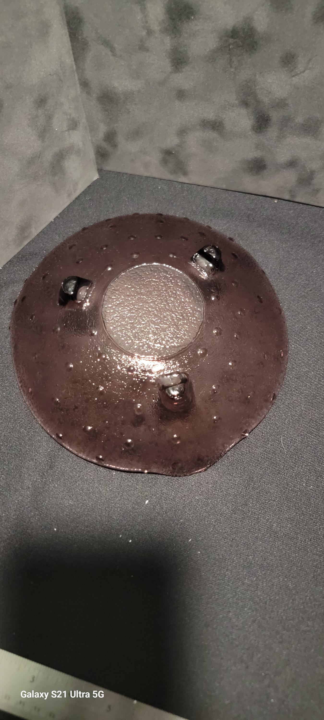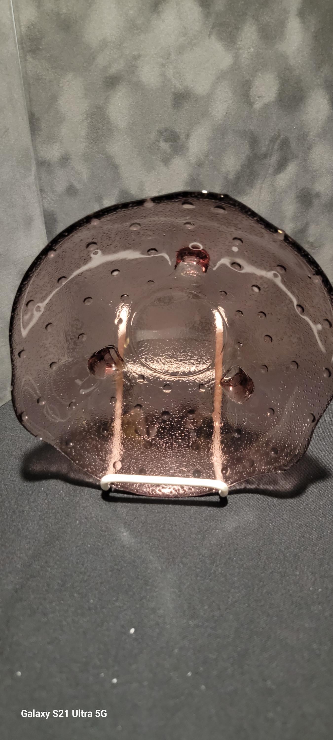 This beautiful vintage amethyst art glass bowl features a softly scalloped rim, controlled bubble texture, and three applied glass feet. The translucent purple hue shifts beautifully in the light, giving the piece a rich, elegant presence perfect for display.