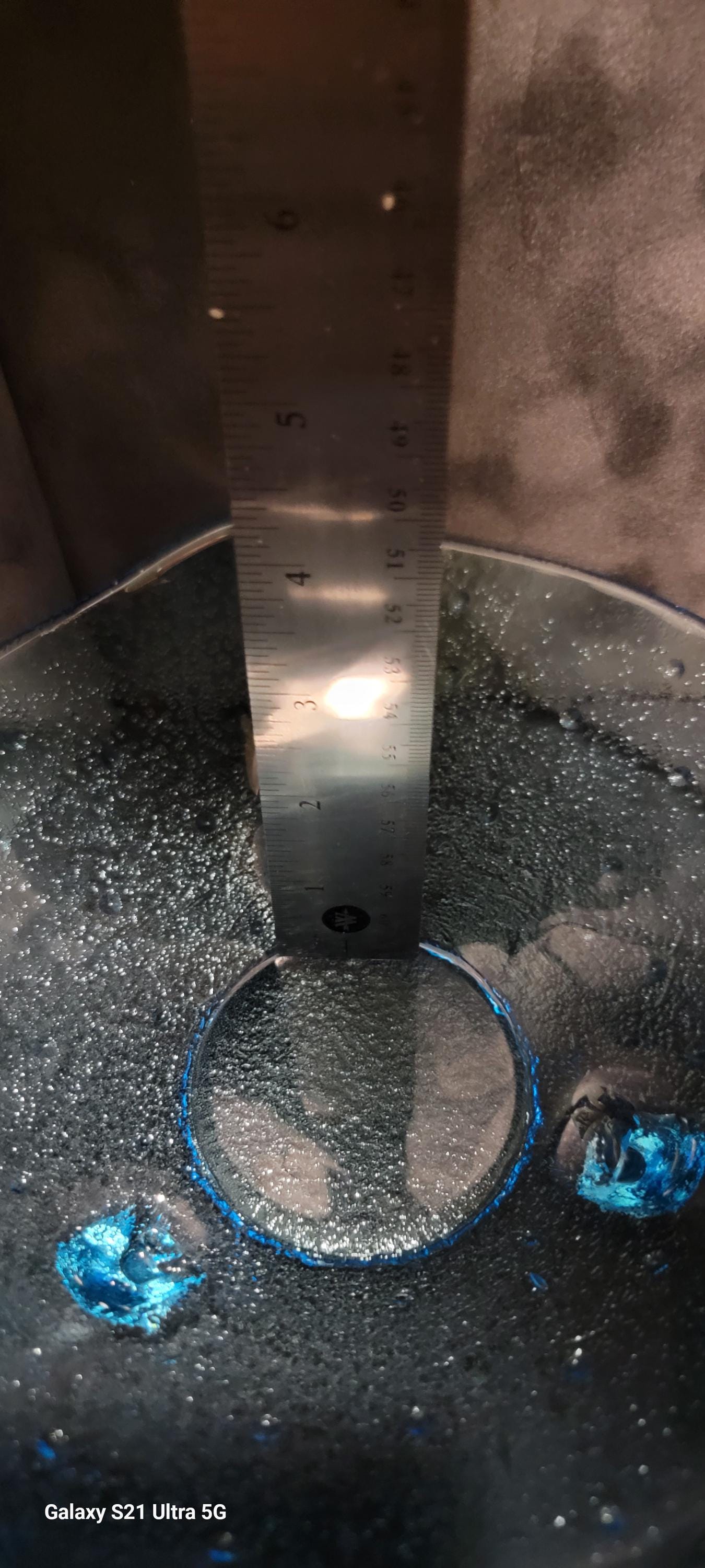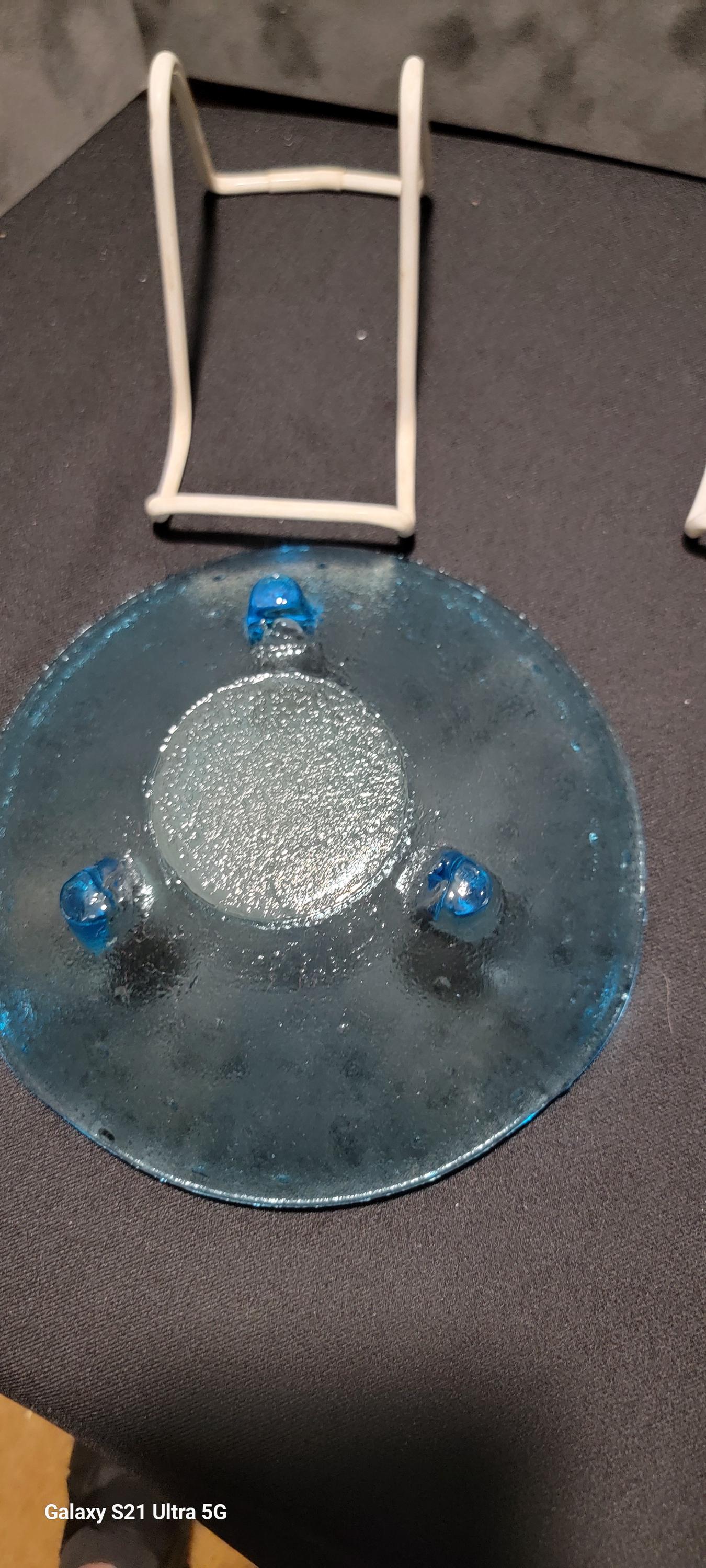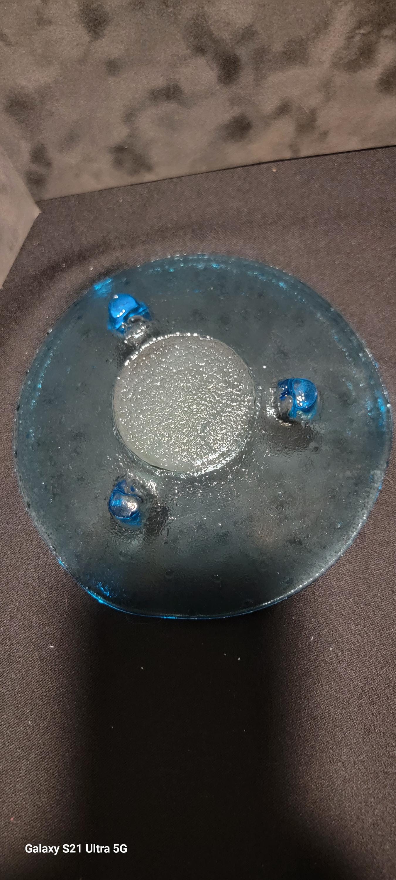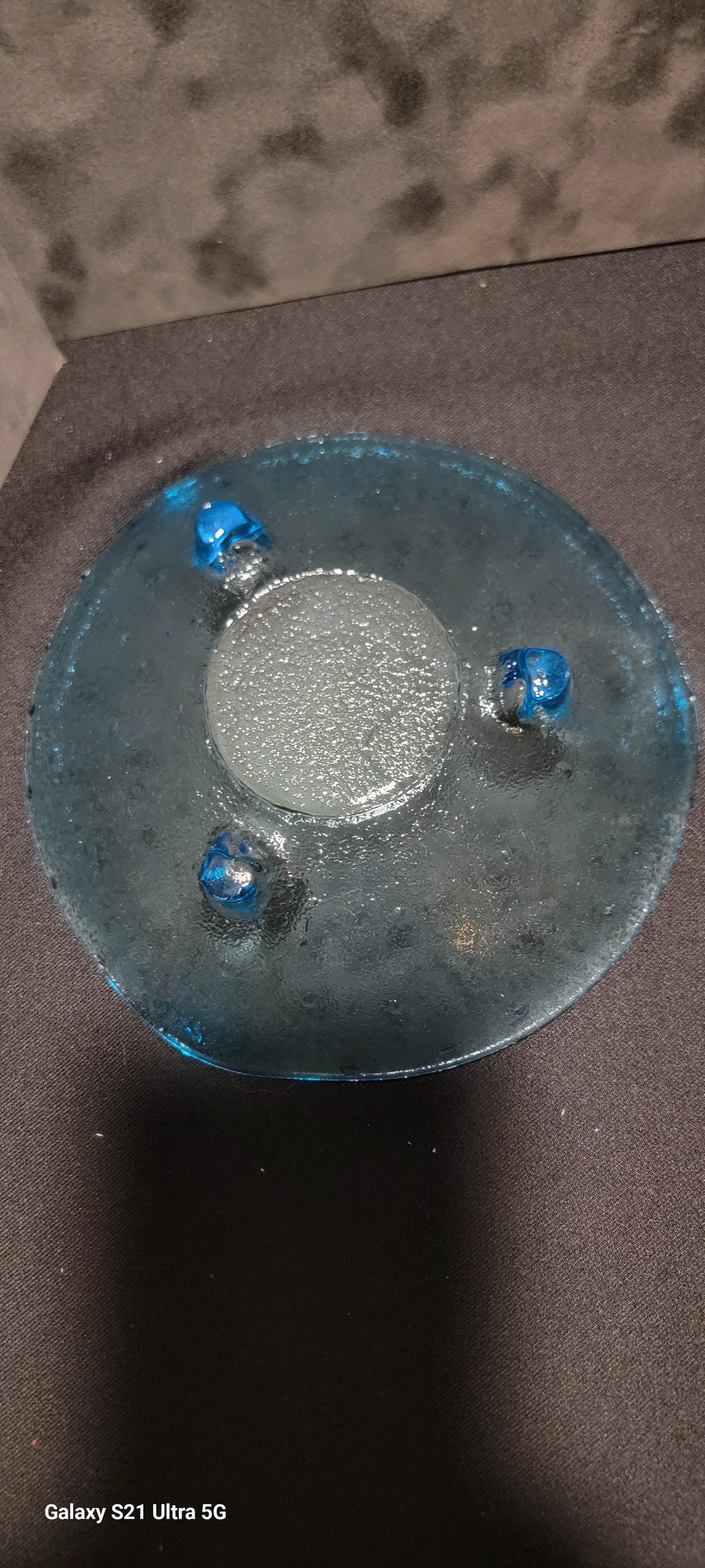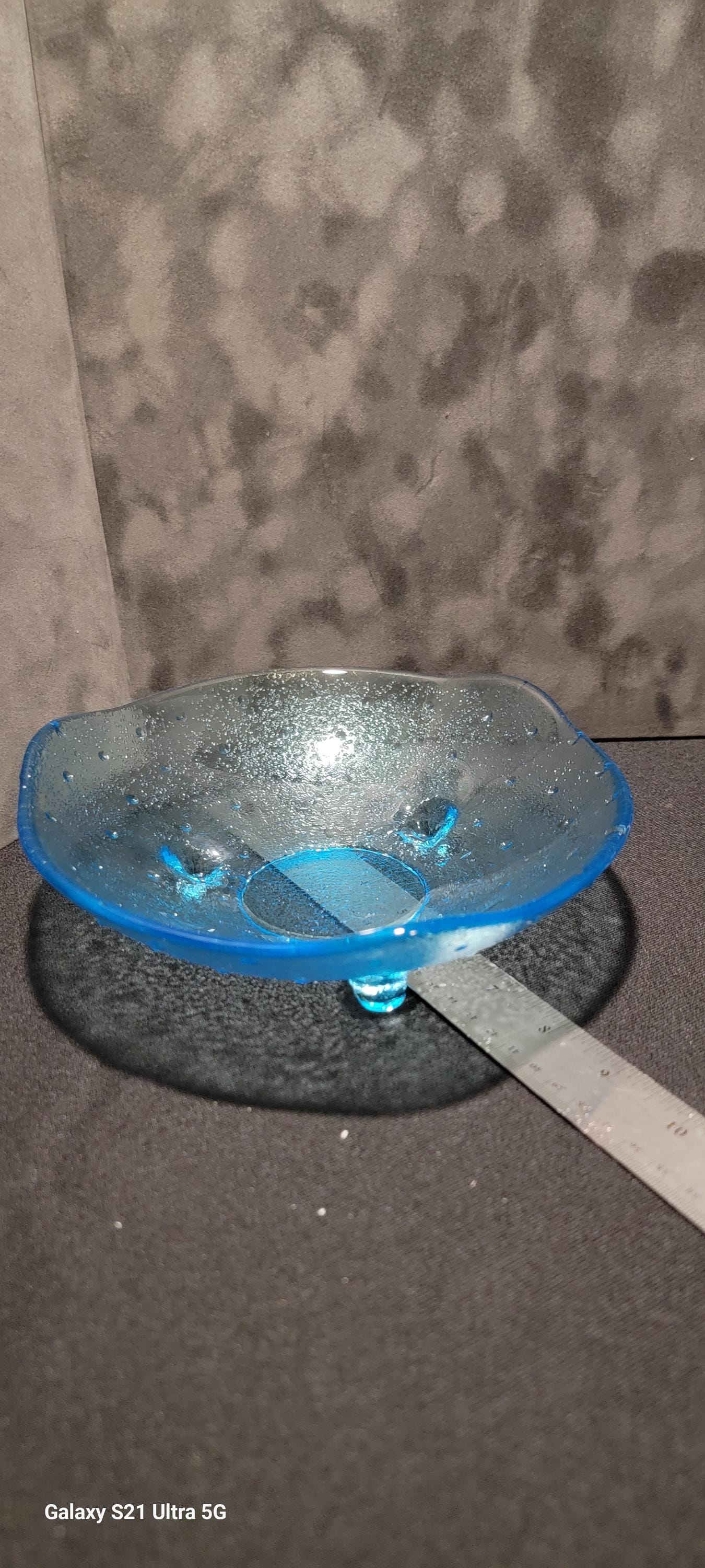 This beautiful vintage blue art glass bowl features a softly scalloped rim, textured bubble pattern, and a delicate footed base. The translucent aqua-blue glass catches the light beautifully, creating a shimmering effect that makes it a stunning decorative centerpiece.