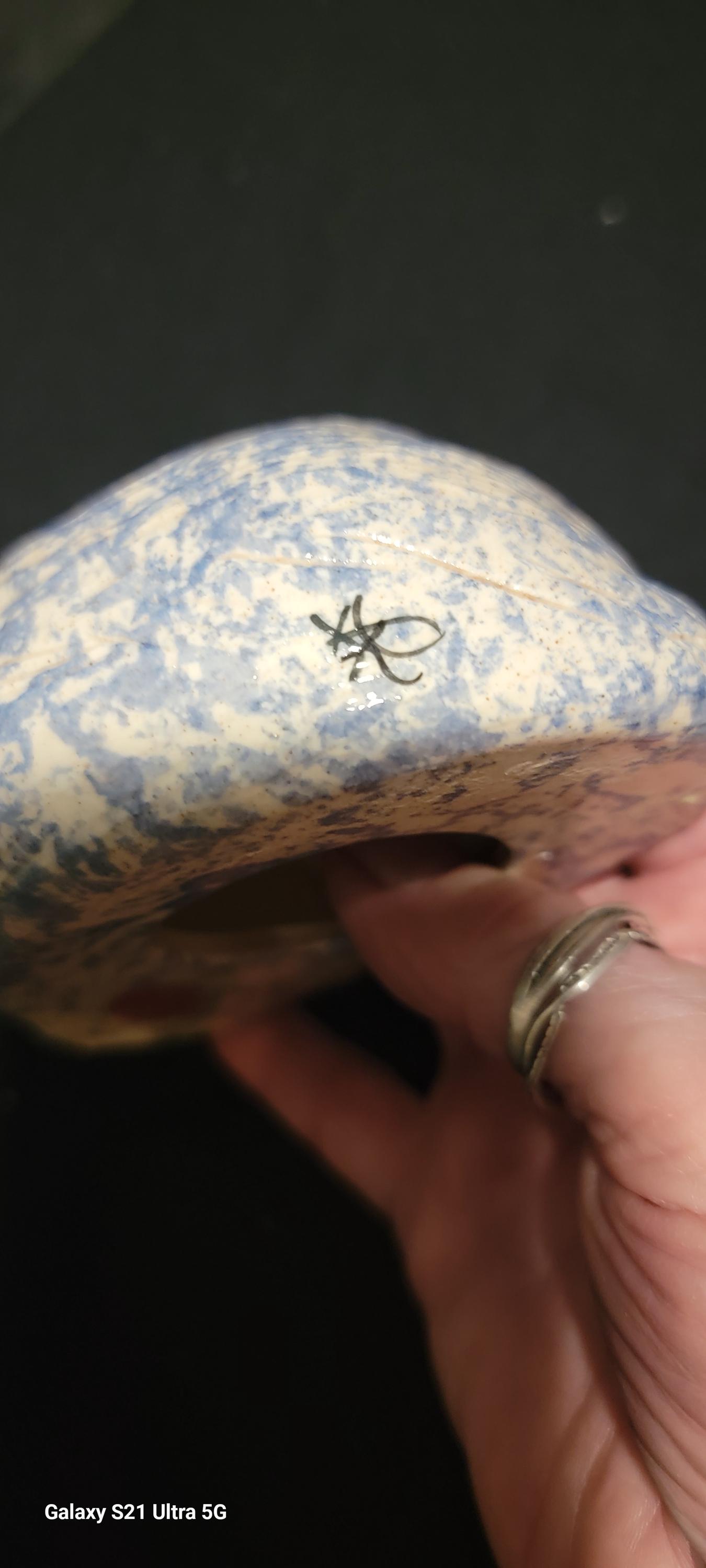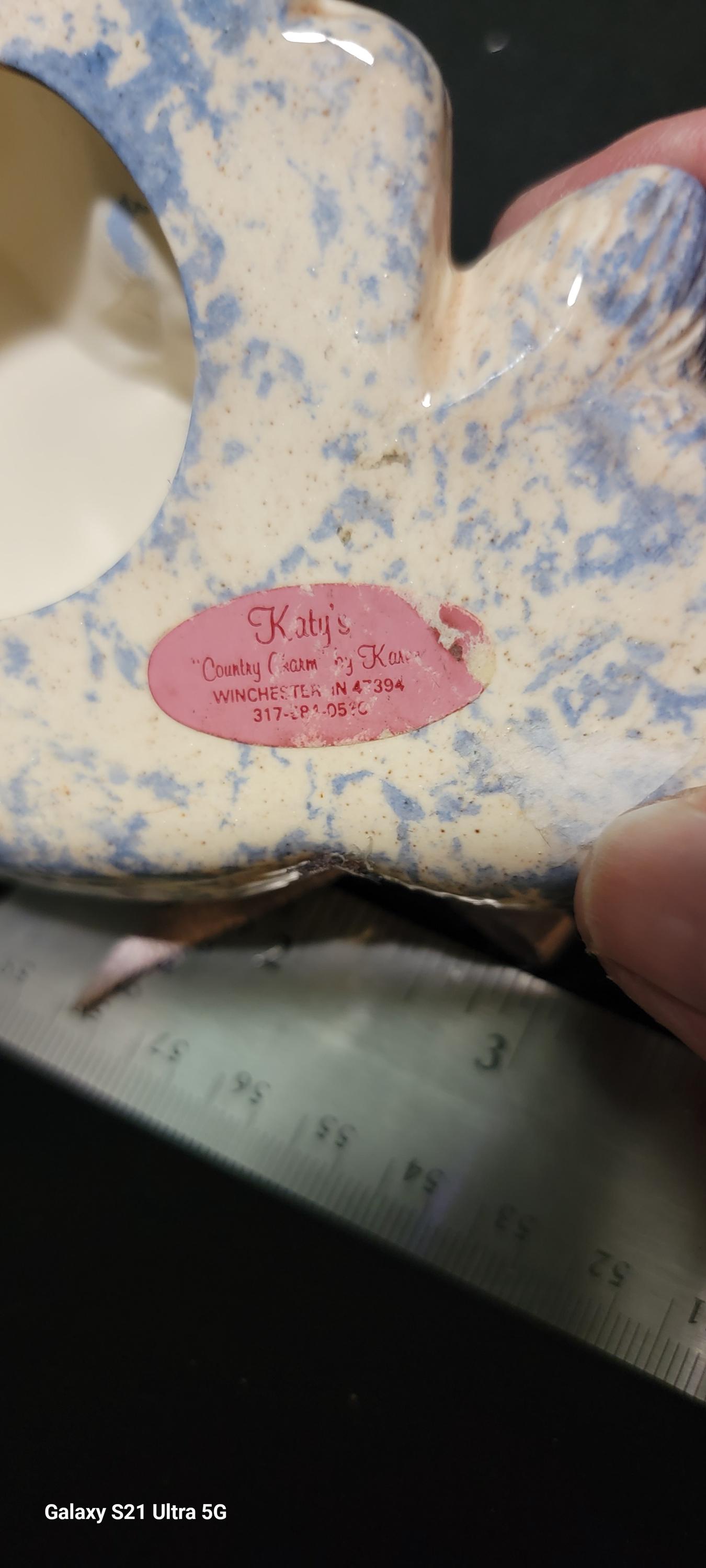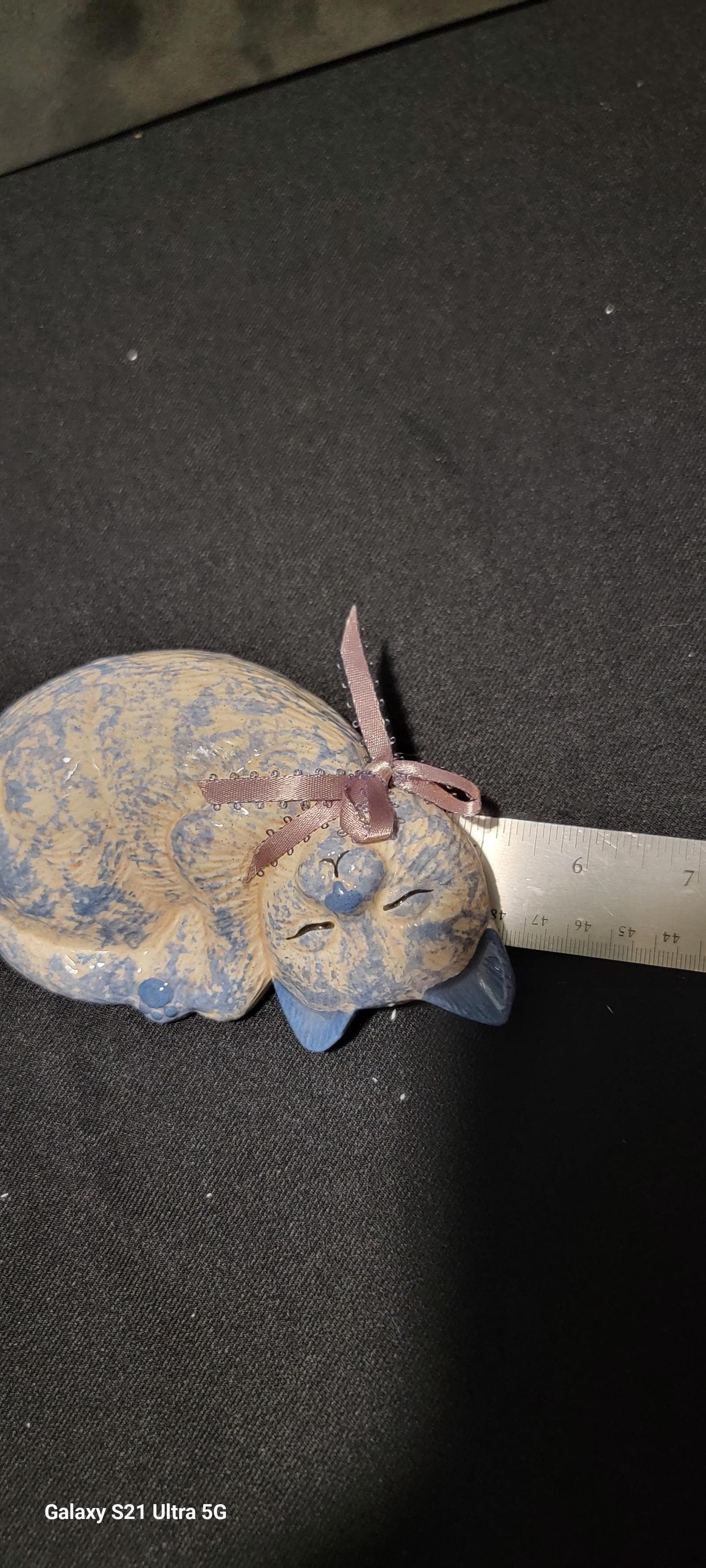 A charming vintage sleeping cat figurine from Katy’s Country Creamery, featuring a soft blue spongeware glaze and cozy cottage charm. A sweet collectible accent perfect for farmhouse, country, or cat lover décor.
