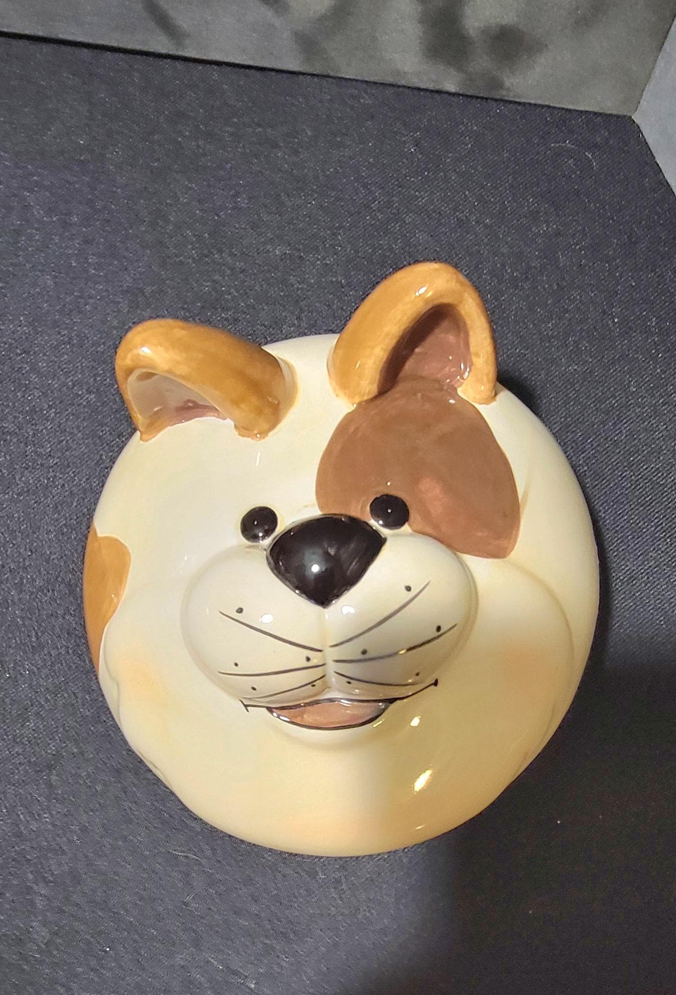 Adorable vintage ceramic cat cookie jar featuring a charming chubby cat design with a decorative doghouse glass window. This whimsical jar has a removable top lid and a spacious interior, perfect for storing cookies, treats, candy, or pet snacks.
