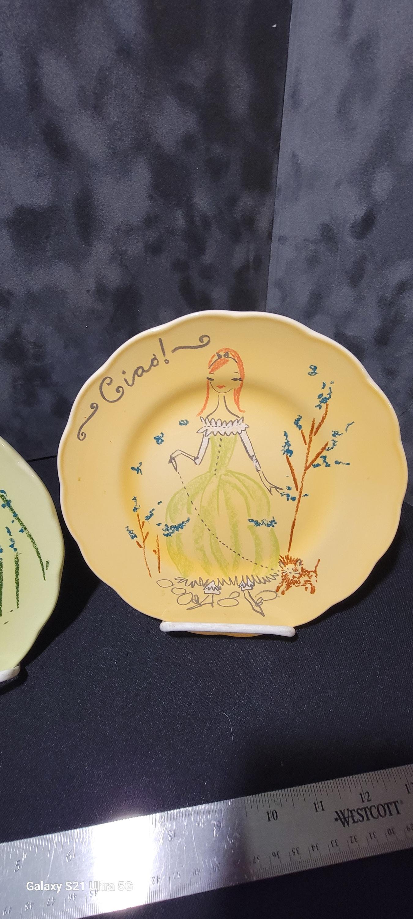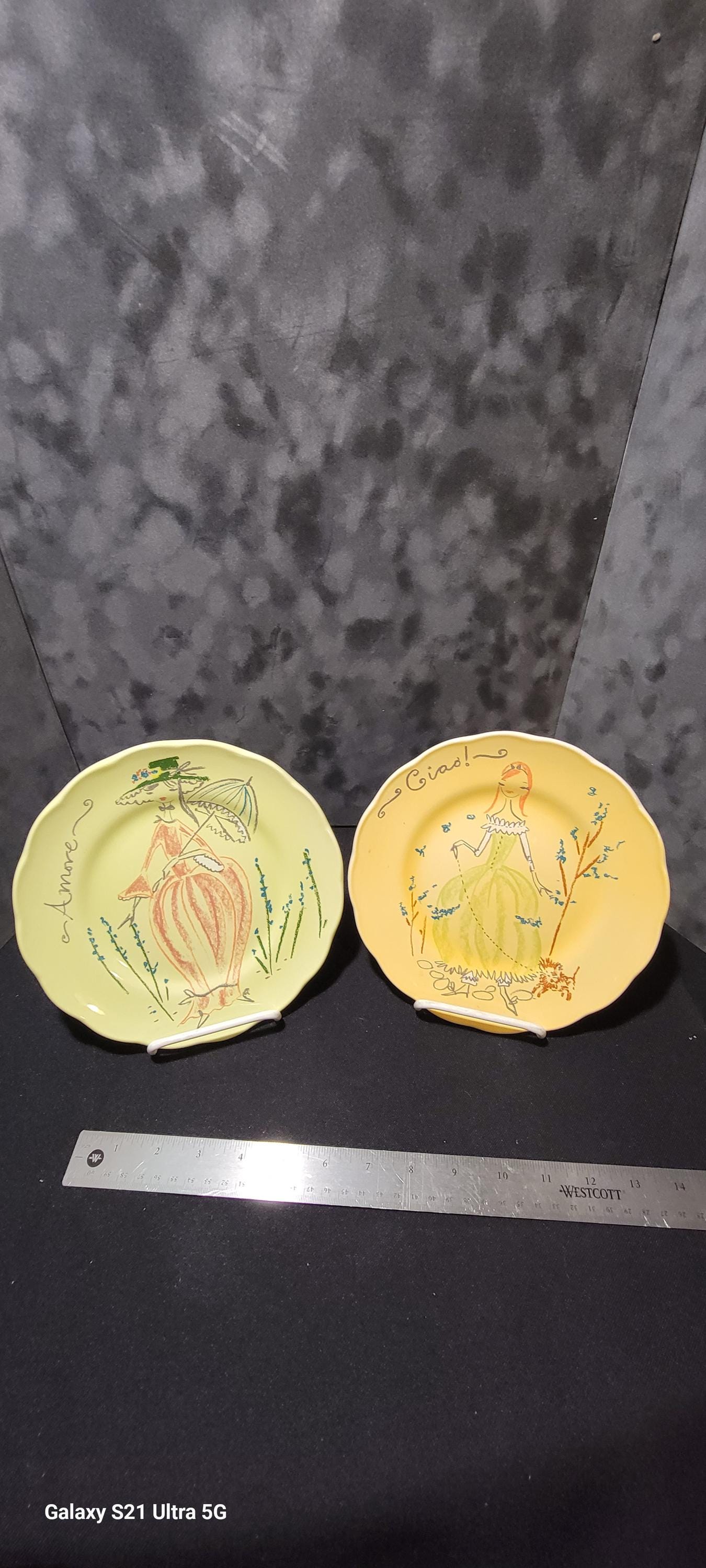 Add a charming European touch to your décor with this vintage set of two decorative plates made in Portugal, featuring whimsical hand-drawn fashion illustrations and soft pastel tones.