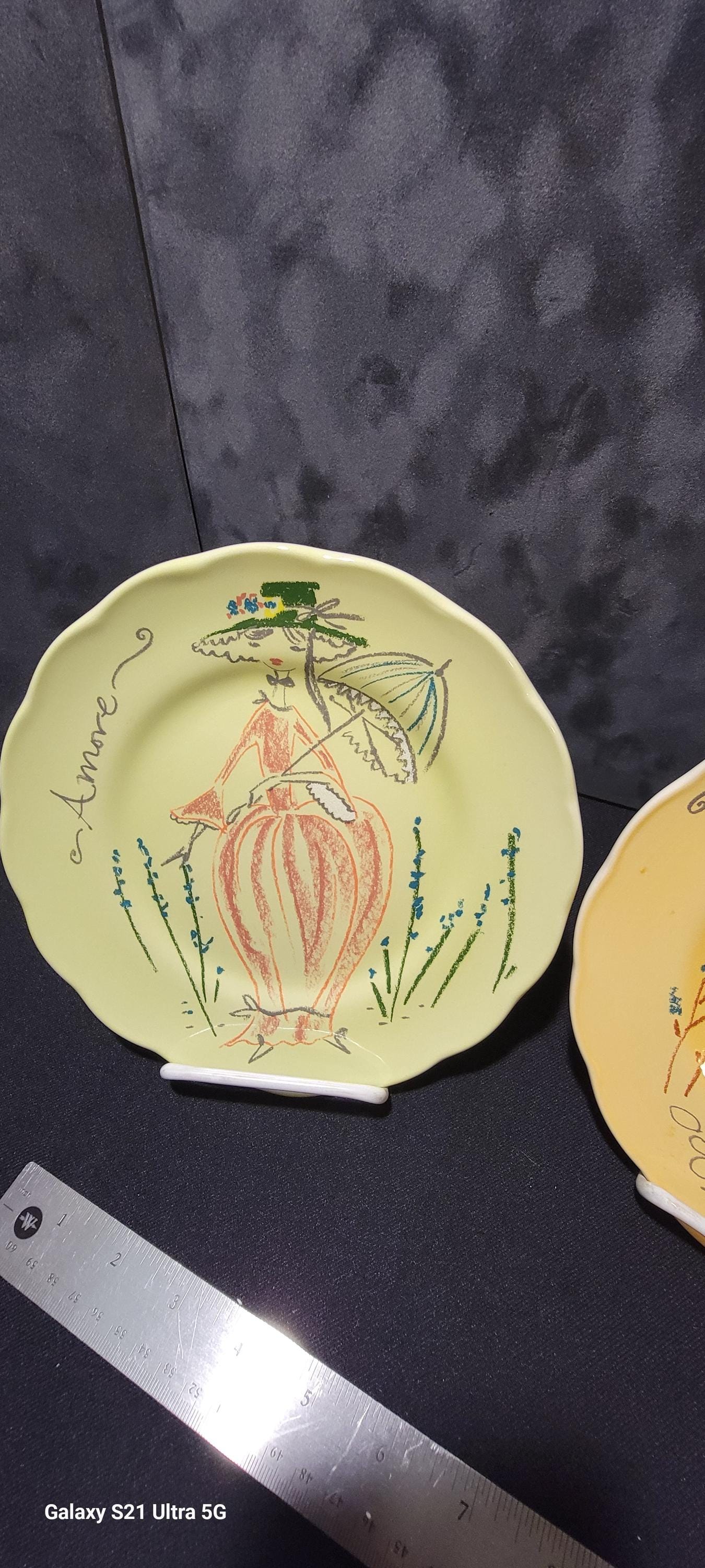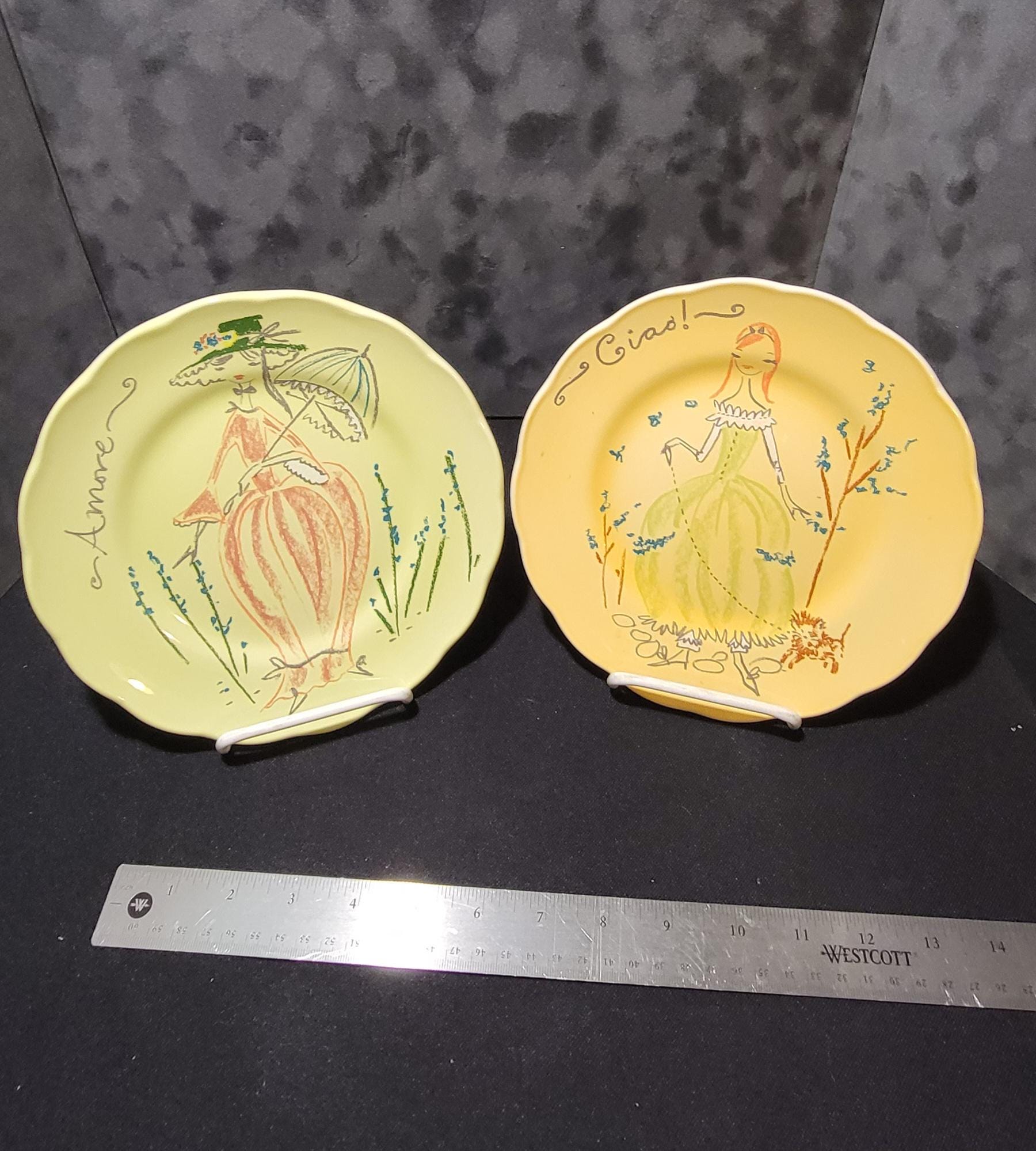 Each plate showcases a unique illustrated lady design with handwritten script details including “Amore” and “Ciao!”, giving them a romantic, artistic, and cottagecore aesthetic. The scalloped edges and warm yellow glaze make them perfect for display on a wall, shelf, or gallery arrangement.