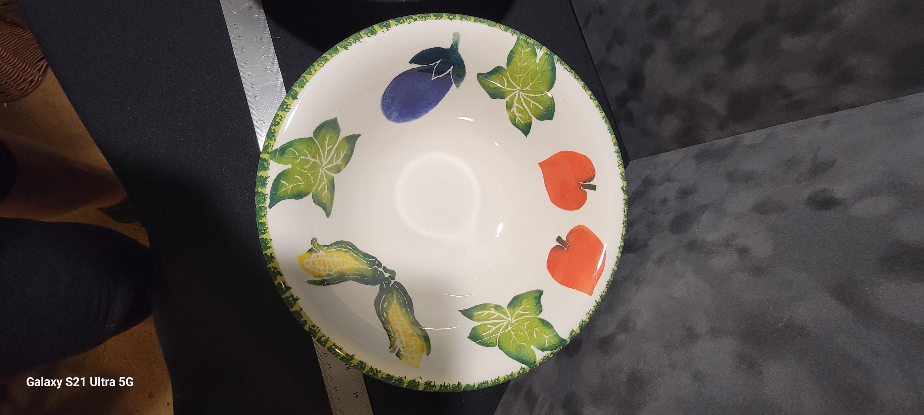 Each bowl features vibrant hand-decorated vegetables including eggplant, corn, ivy, and apples with a classic green speckled rim, inspired by Tuscan countryside kitchenware. These bowls are both decorative and functional, perfect for serving salads, pasta, fruit, or displaying in a rustic kitchen setting.