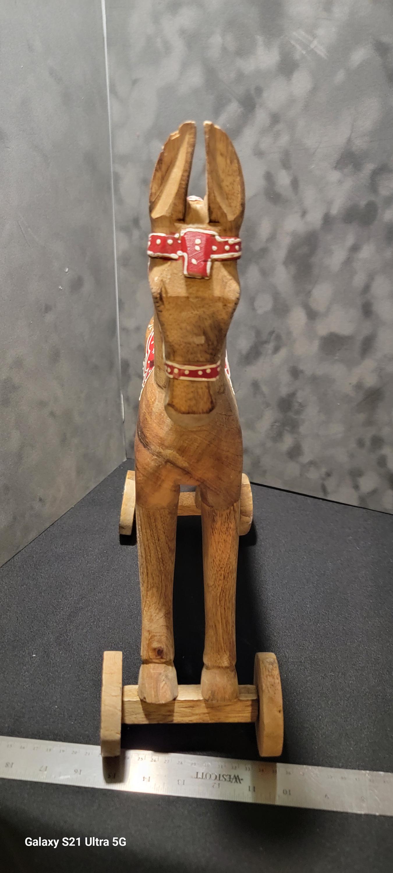 Bring timeless charm to your space with this beautifully hand-carved wooden horse on wheels, featuring a rustic folk-art design and hand-painted red saddle details.