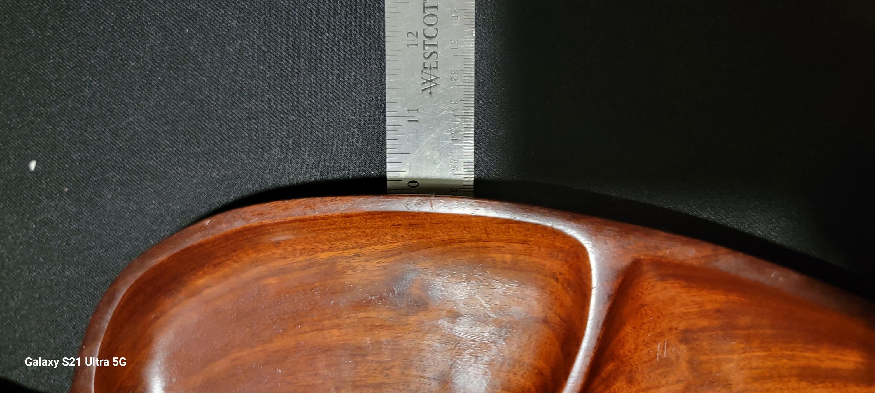 This mid-century tray features a rich natural wood grain and an organic leaf-shaped design with three compartments, perfect for serving snacks, charcuterie, nuts, or appetizers. The warm mahogany tone and craftsmanship make it both functional and decorative.