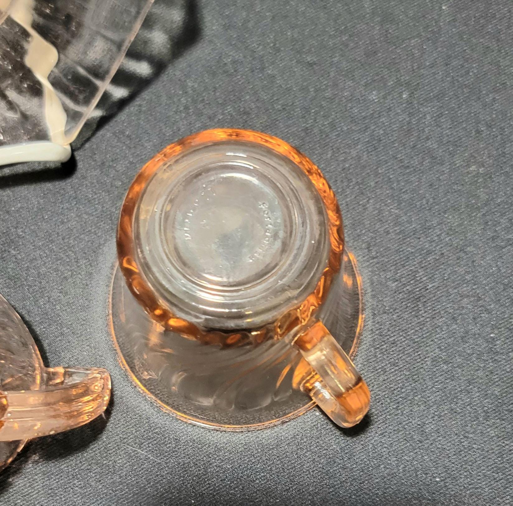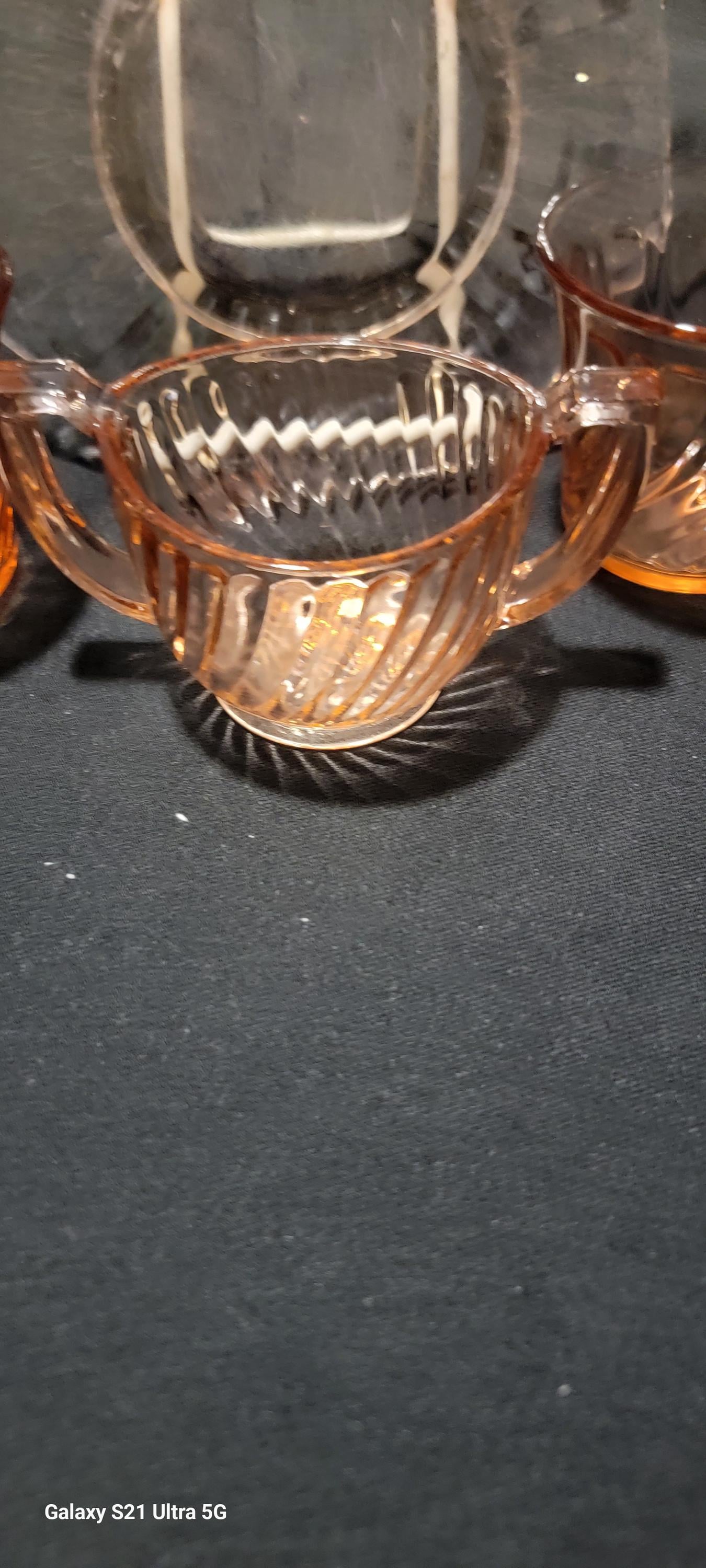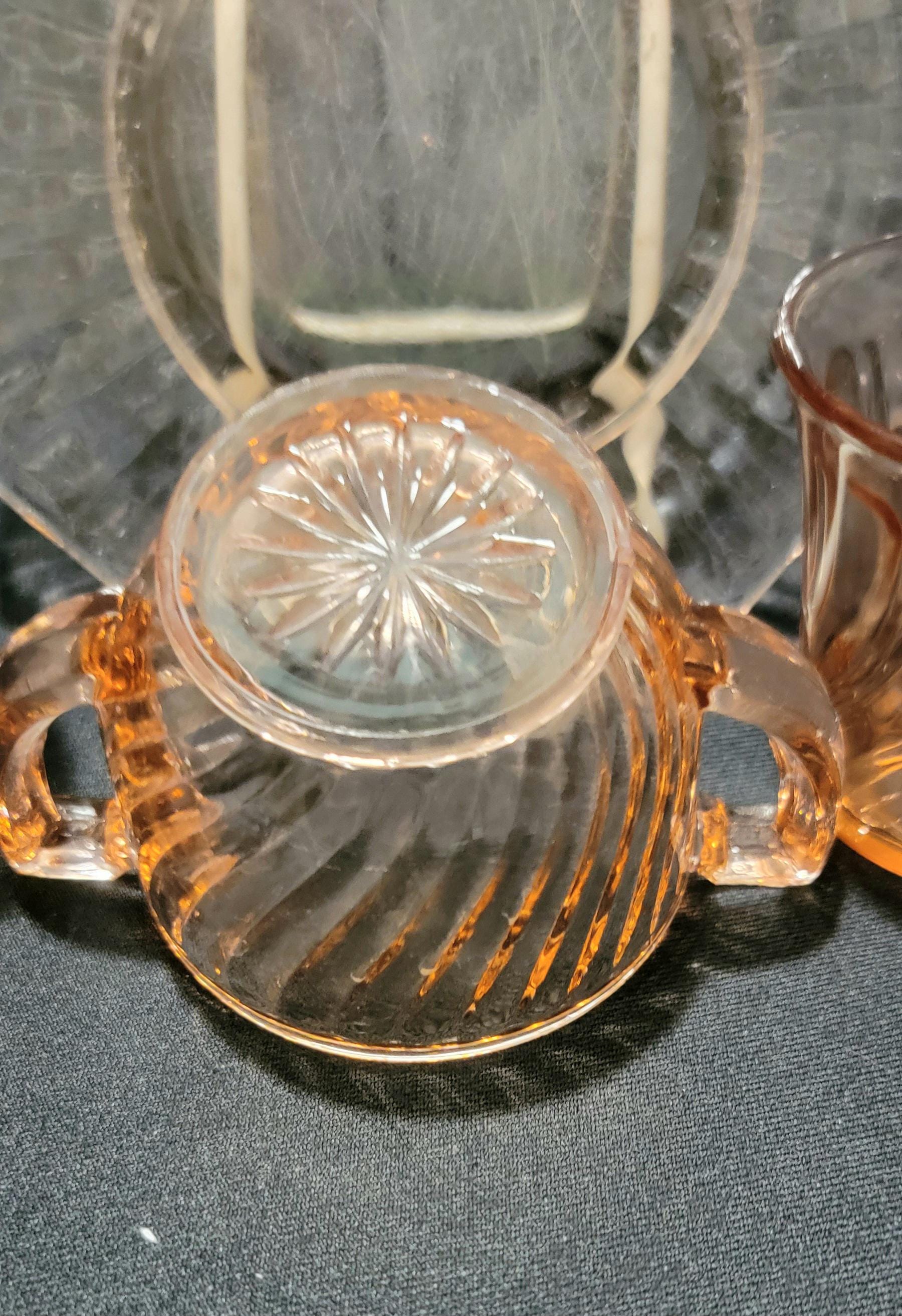 Add timeless vintage charm to your collection with this authentic Federal Glass pink Depression glass tea set. This beautiful 4-piece set includes two matching cups, a sugar bowl, and a coordinating plate, all featuring a classic swirl/ribbed pattern in soft pink glass.