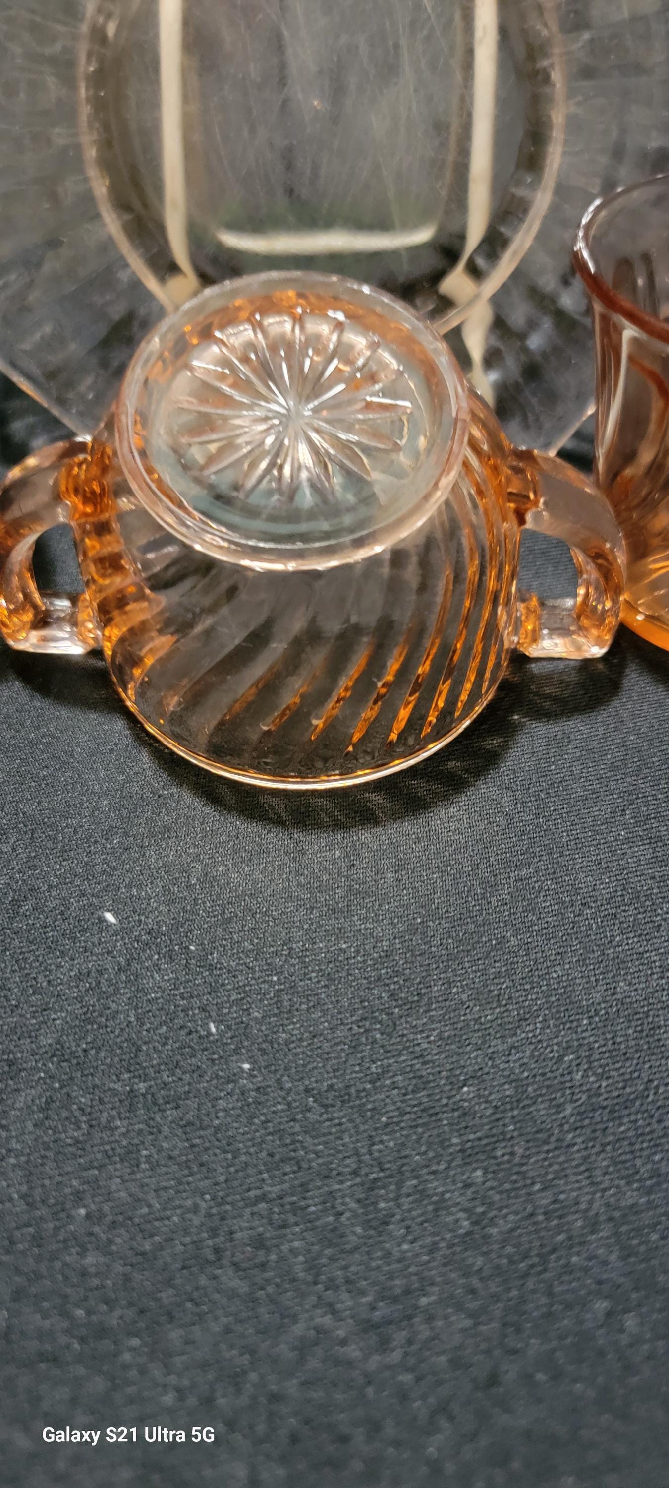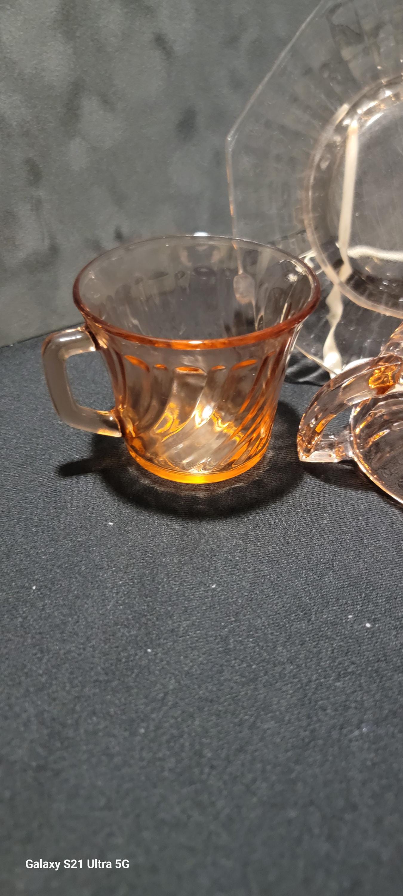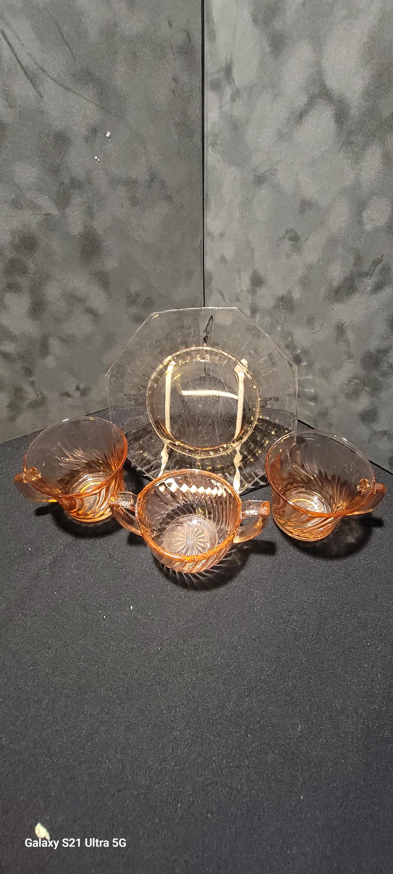 Add timeless vintage charm to your collection with this authentic Federal Glass pink Depression glass tea set. This beautiful 4-piece set includes two matching cups, a sugar bowl, and a coordinating plate, all featuring a classic swirl/ribbed pattern in soft pink glass.