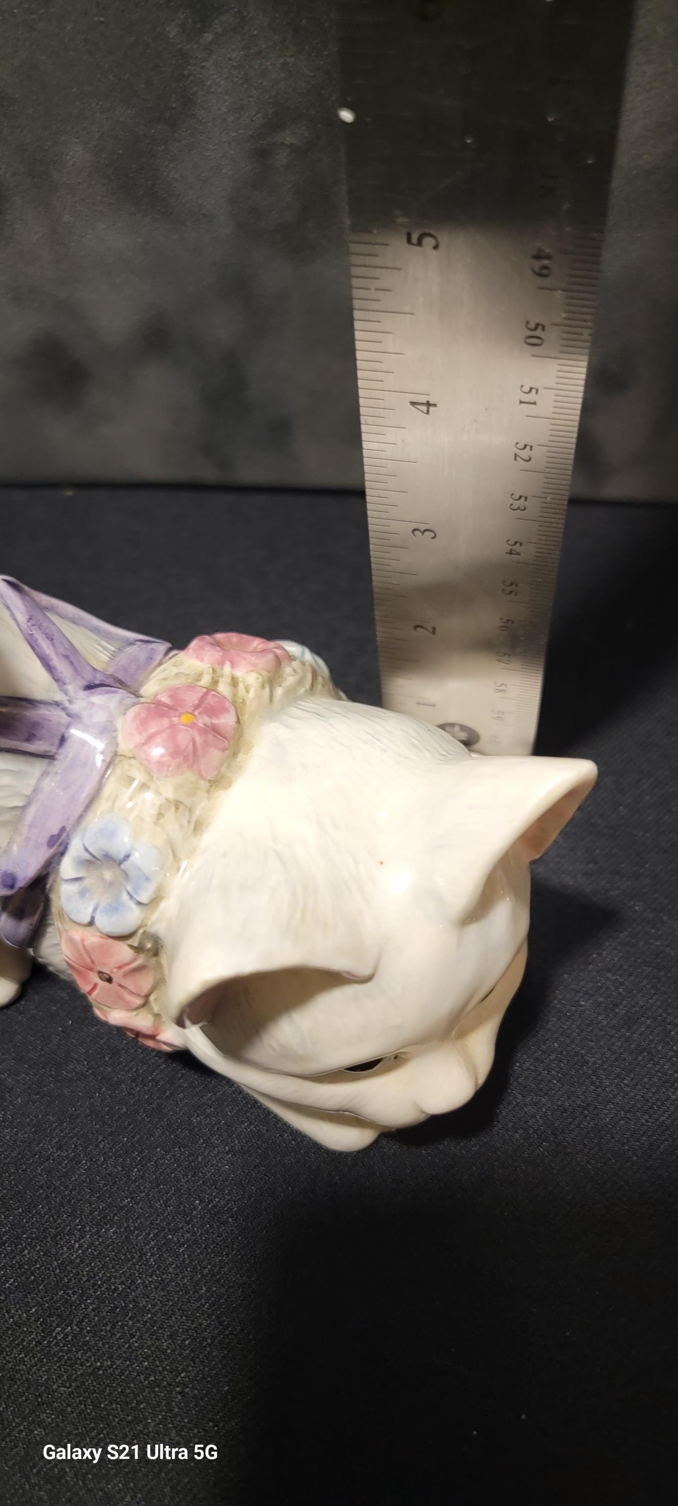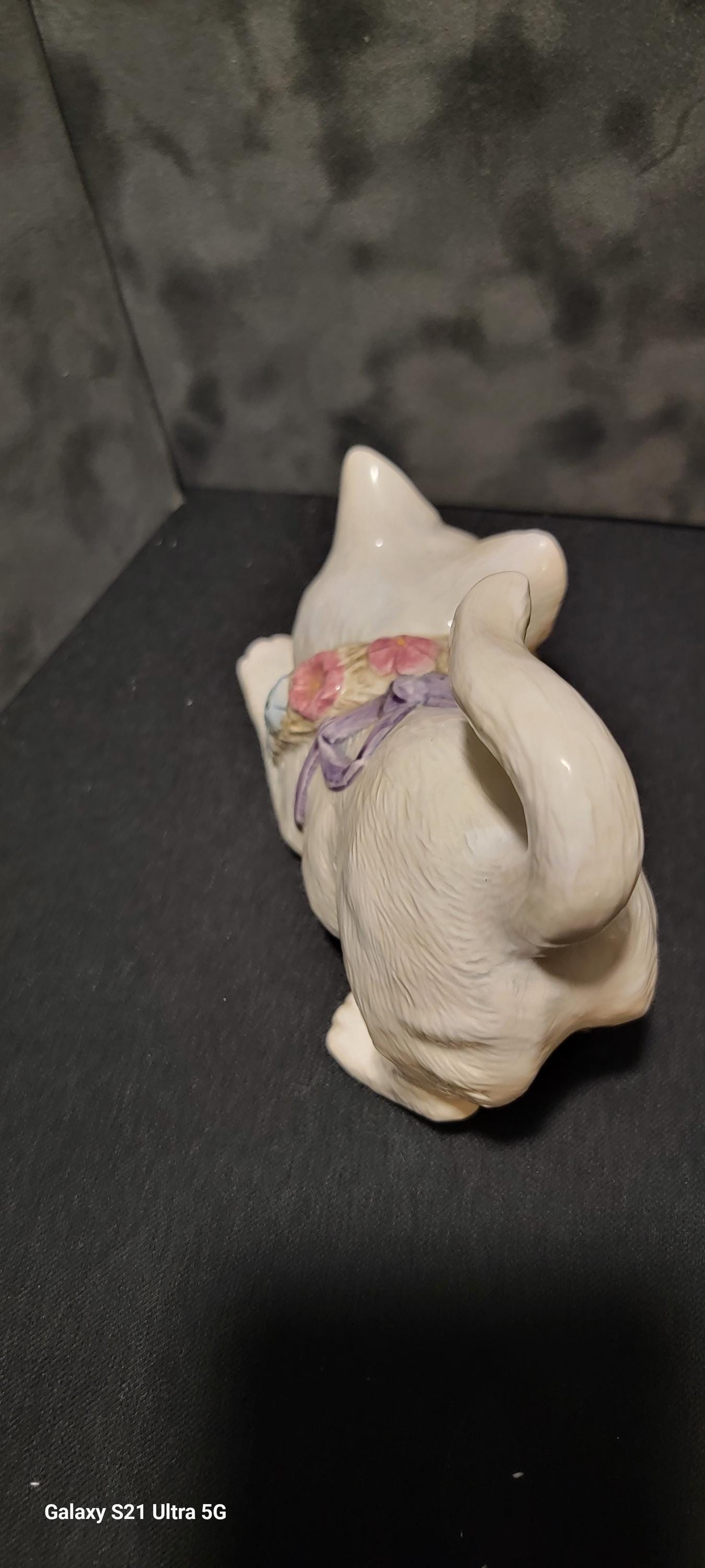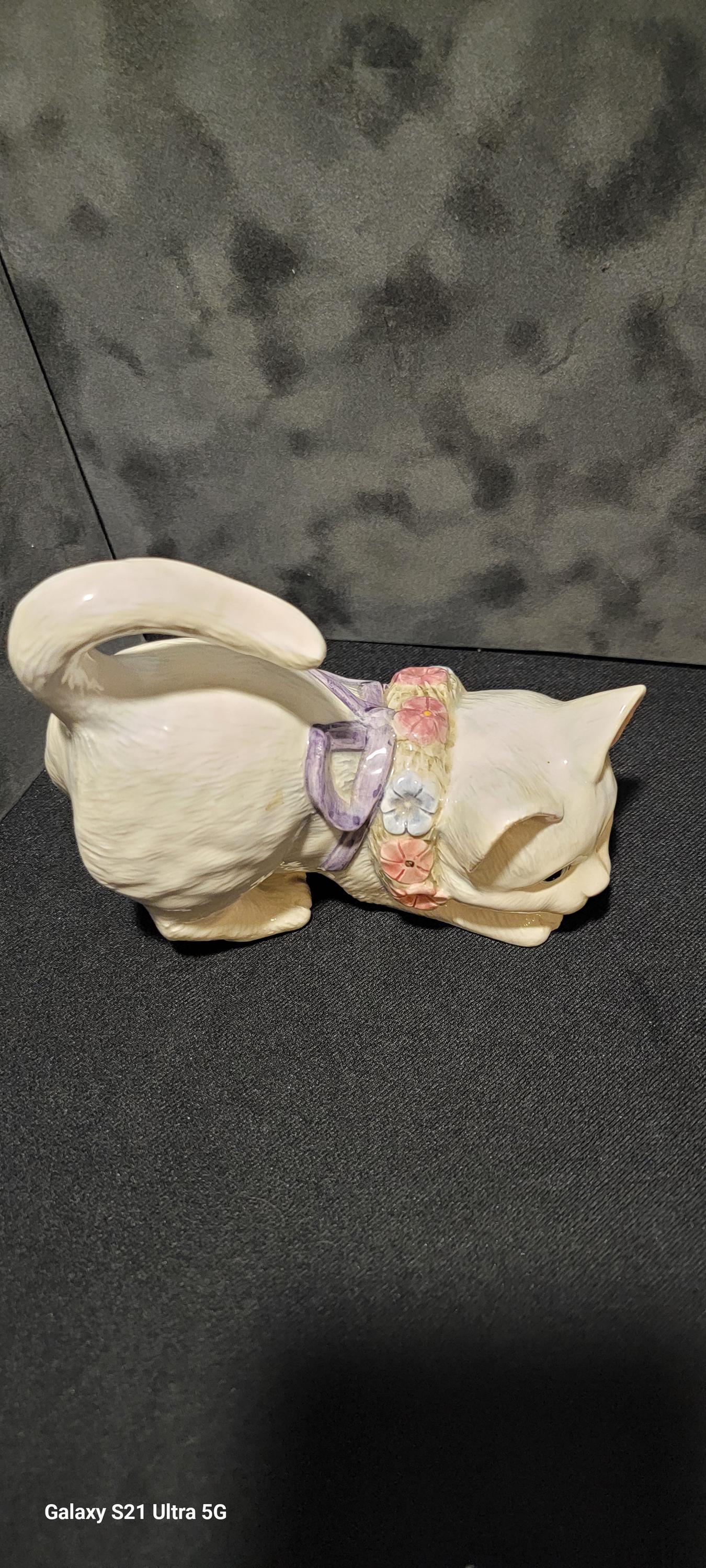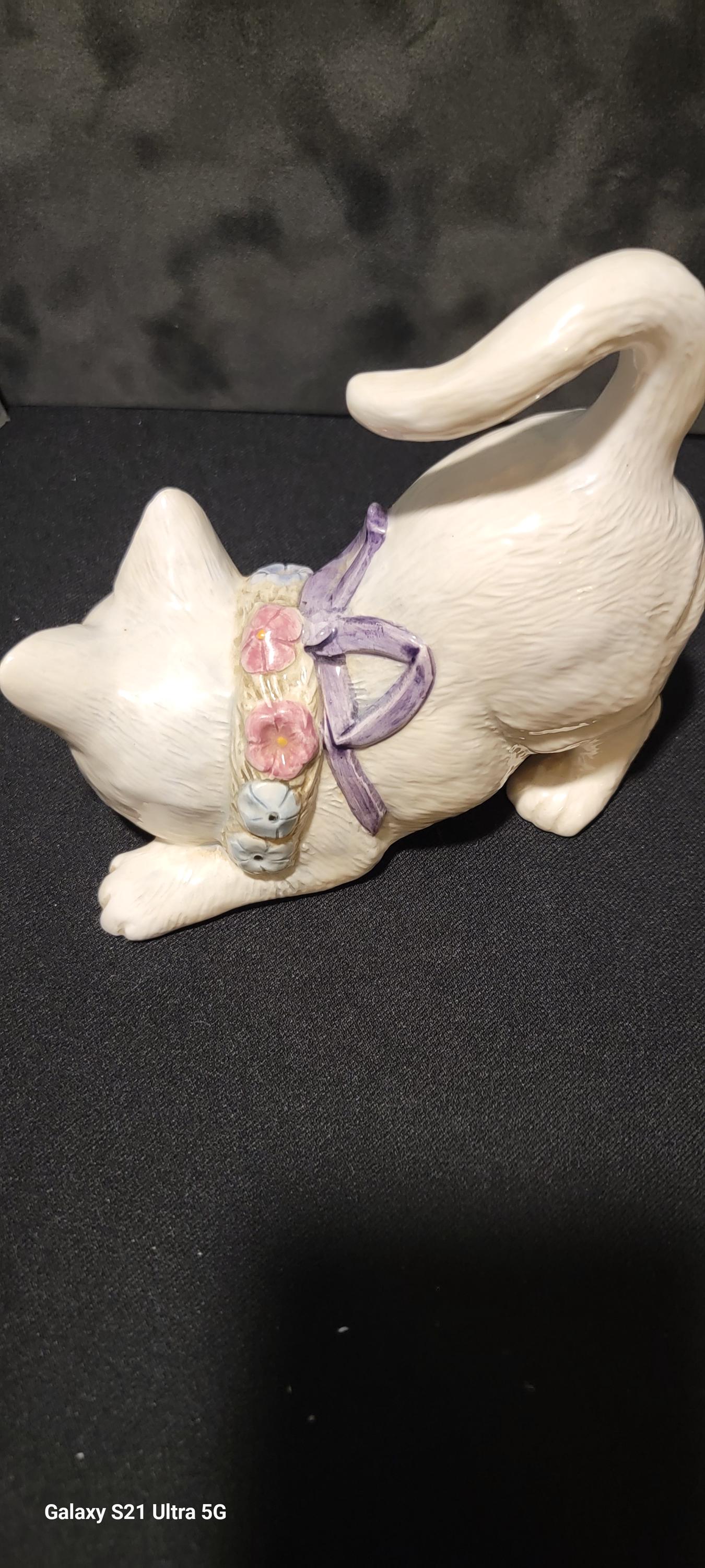 Adorable vintage ceramic cat planter by Lefton, featuring a sweet crouching kitten design with a pastel floral collar and bow. This charming piece has a soft ivory glaze with delicate hand-painted flowers in pink, blue, and lavender, giving it a classic cottagecore and shabby chic aesthetic.