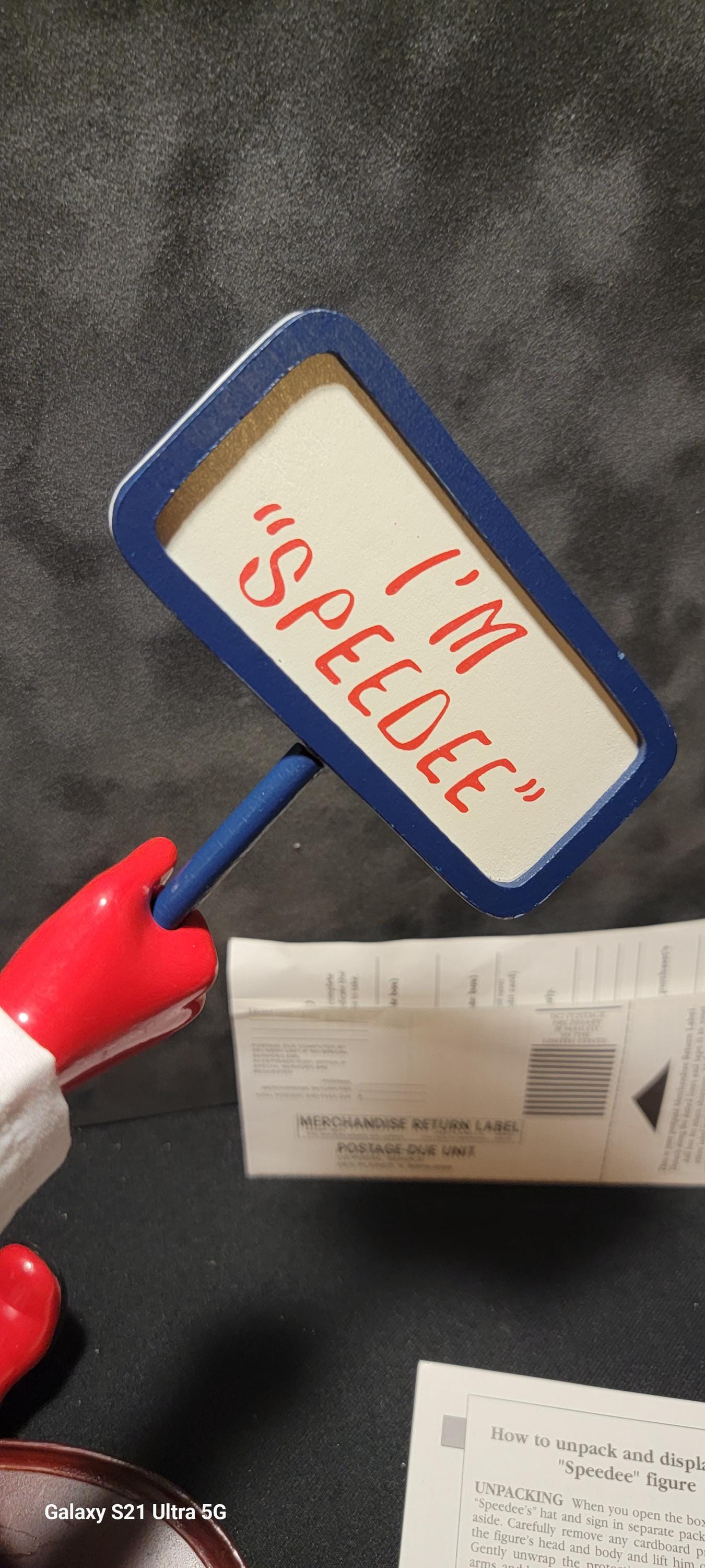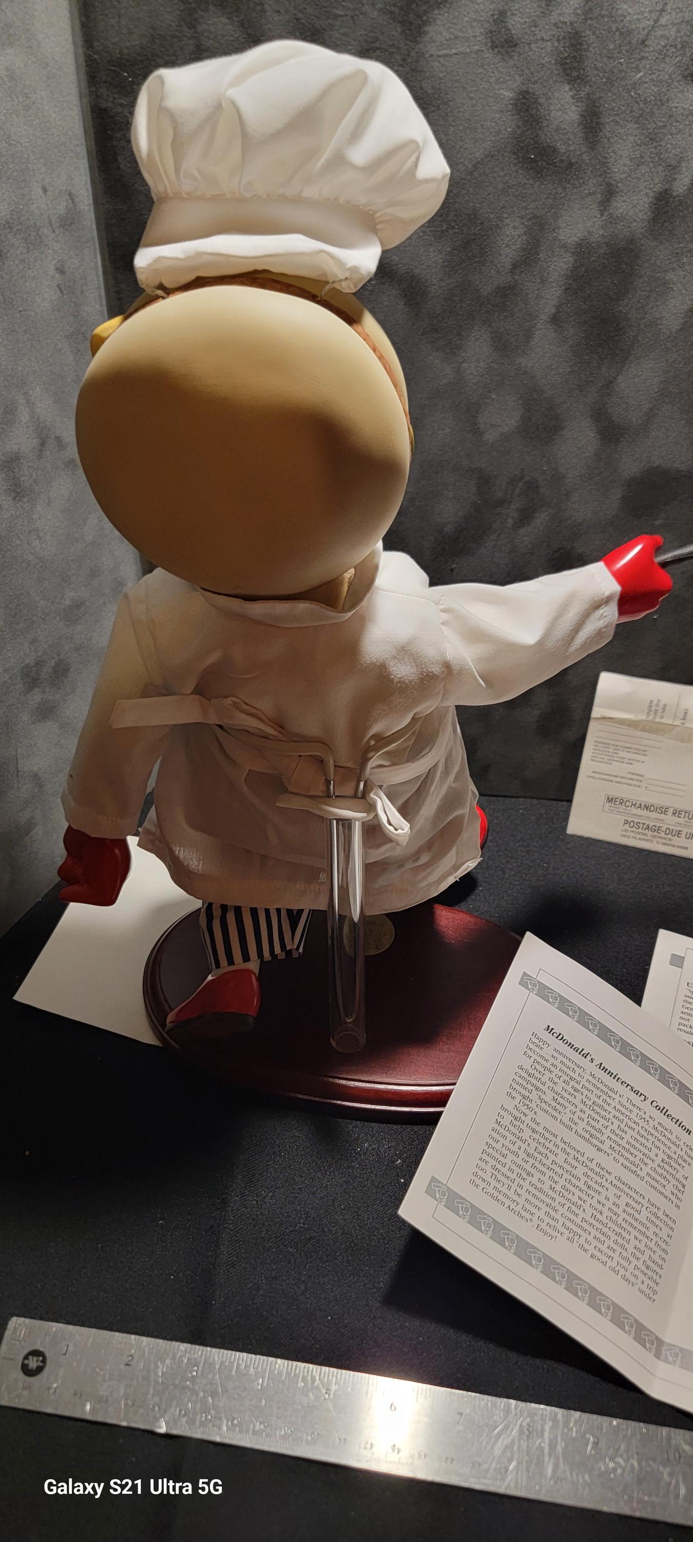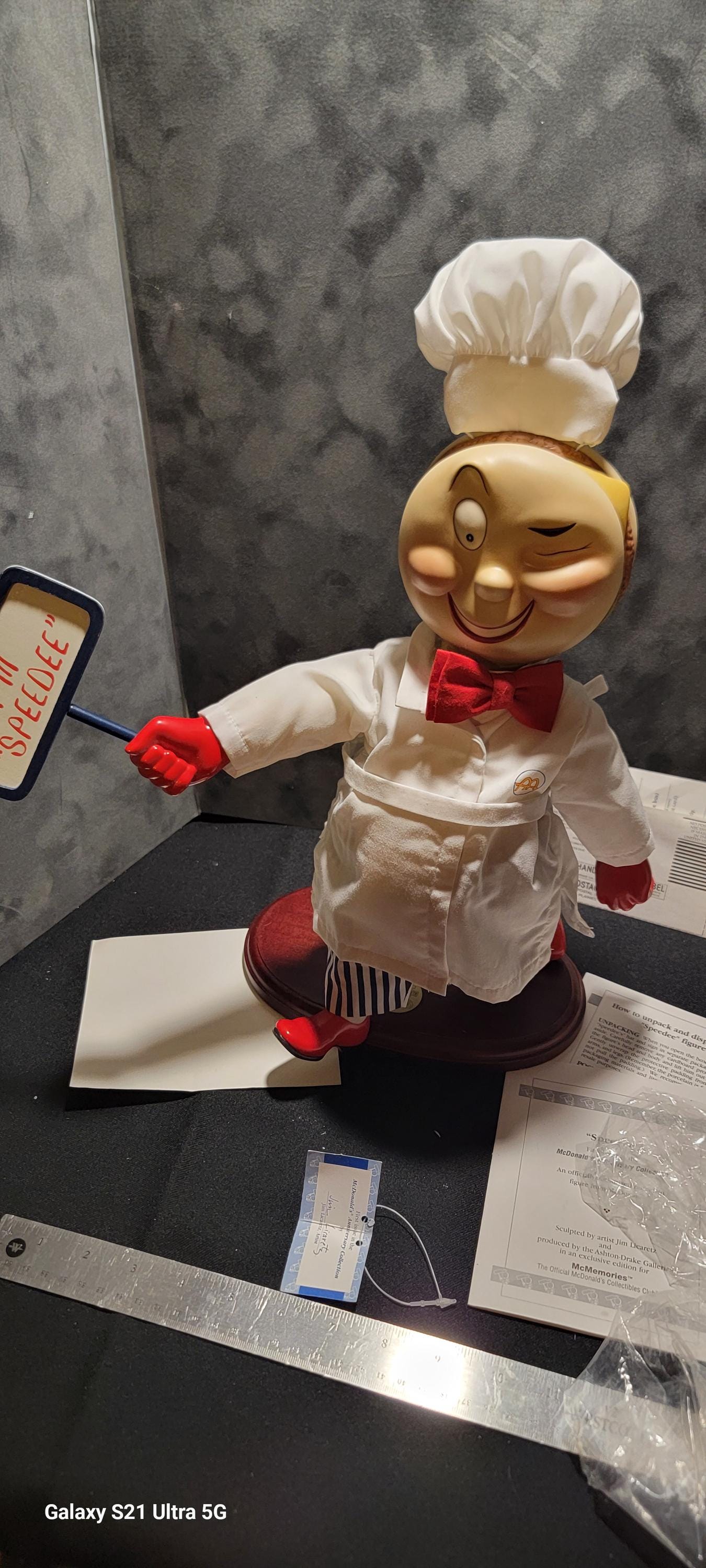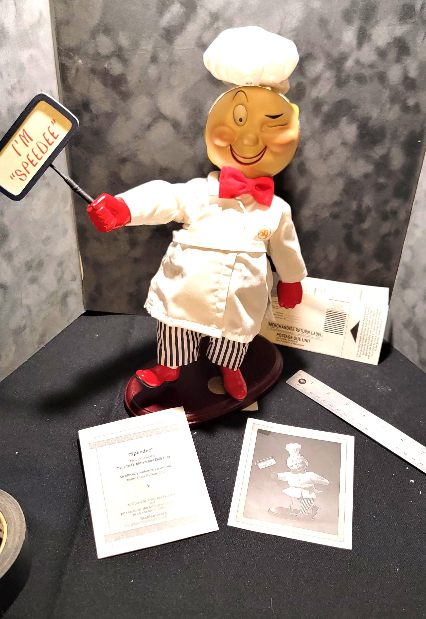 Mr. Speedee was McDonald’s original mascot, representing the “Speedee Service System” before Ronald McDonald became the brand’s face. This charming figure captures that early era with his classic chef outfit, red gloves, striped pants, and iconic sign.