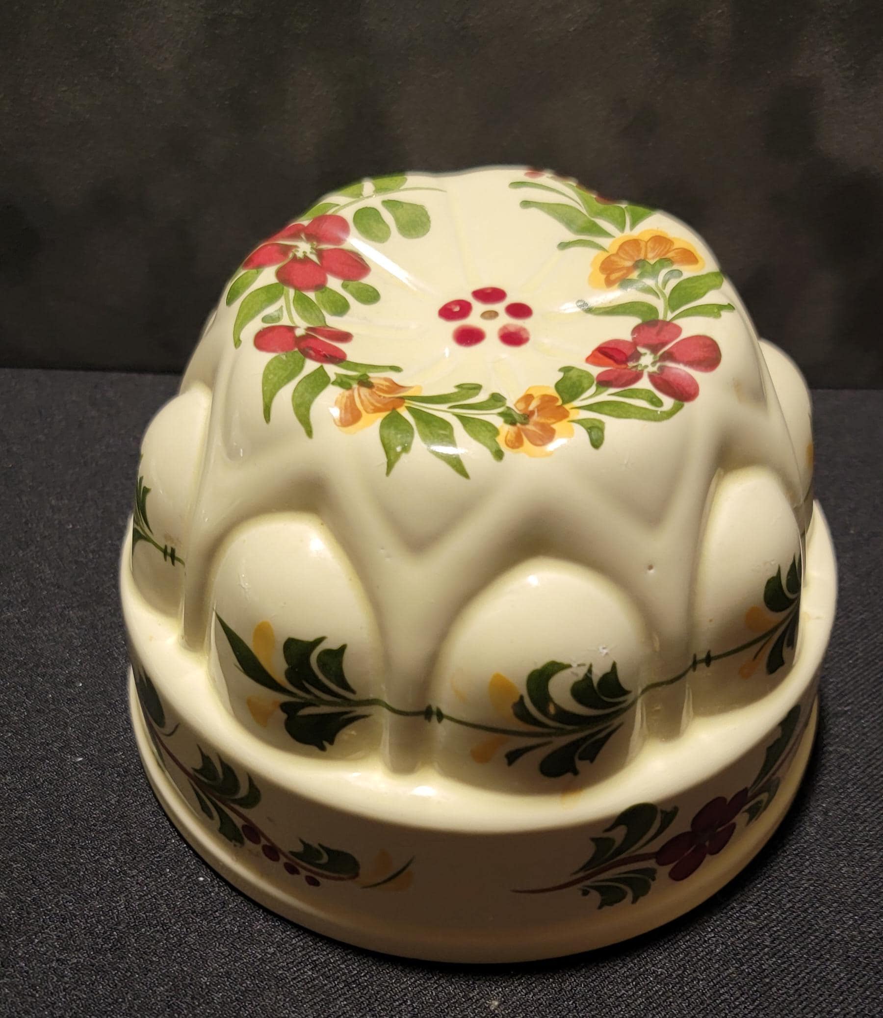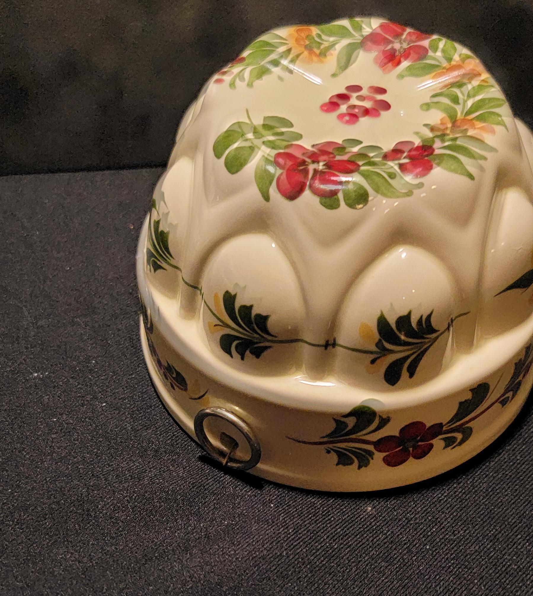Beautiful vintage ceramic Jell-O mold hand painted in Portugal for Teleflora, featuring a charming floral design and classic scalloped bundt shape.