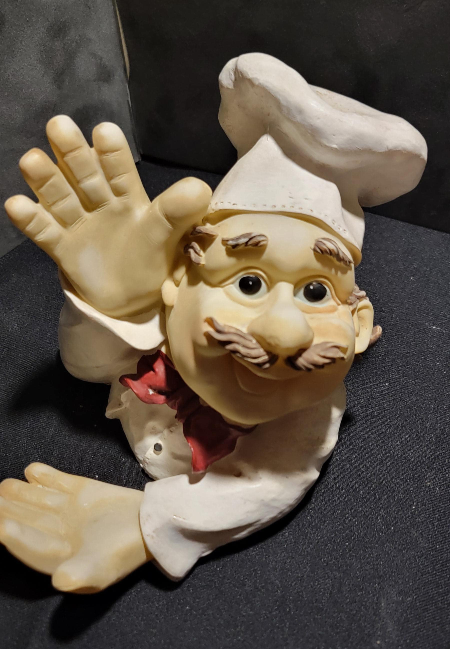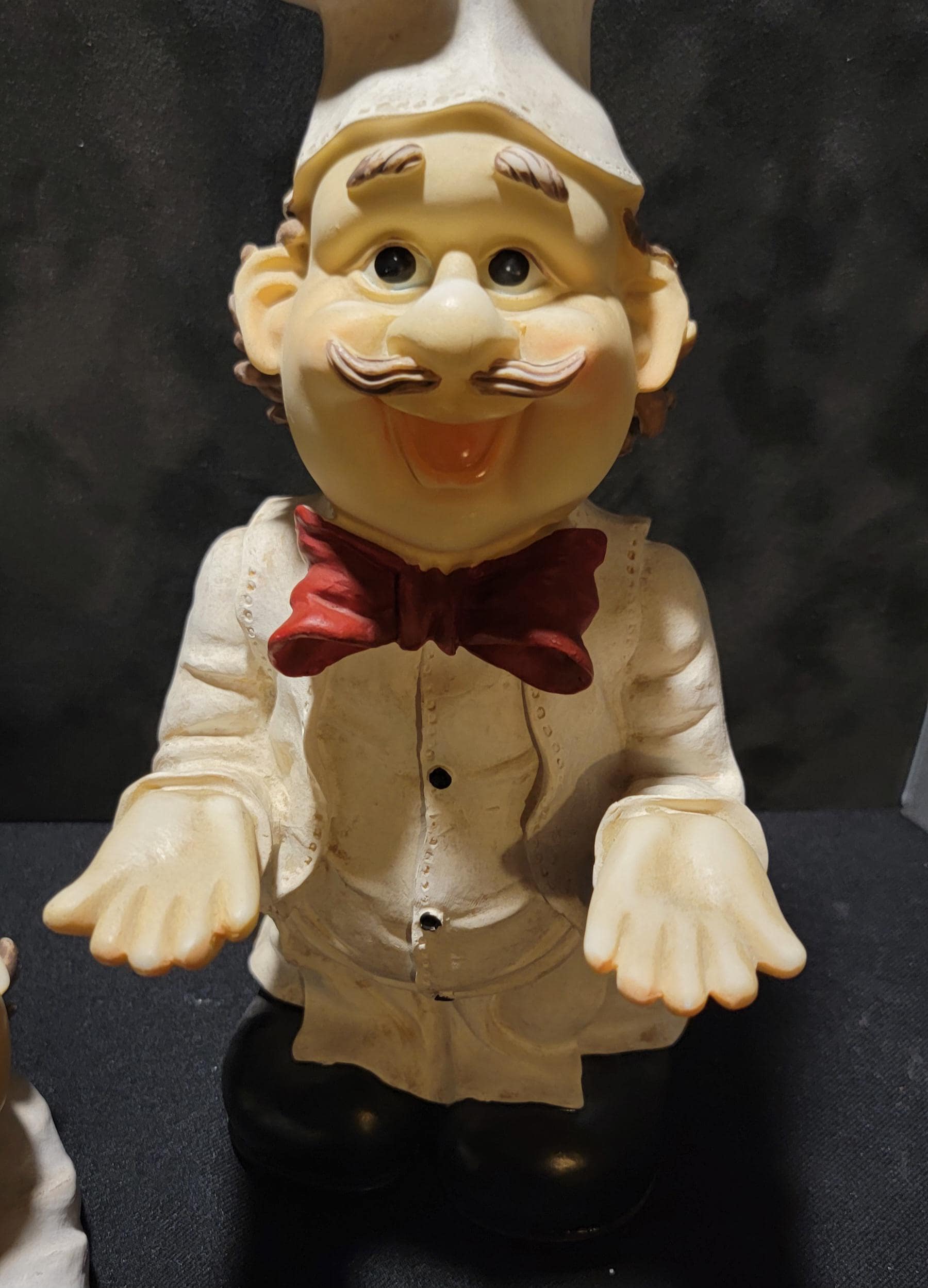 This charming pair includes one standing chef and one reclining chef, both with signature red bow ties and expressive faces. Perfect for adding personality to a kitchen, coffee bar, or restaurant-themed space.