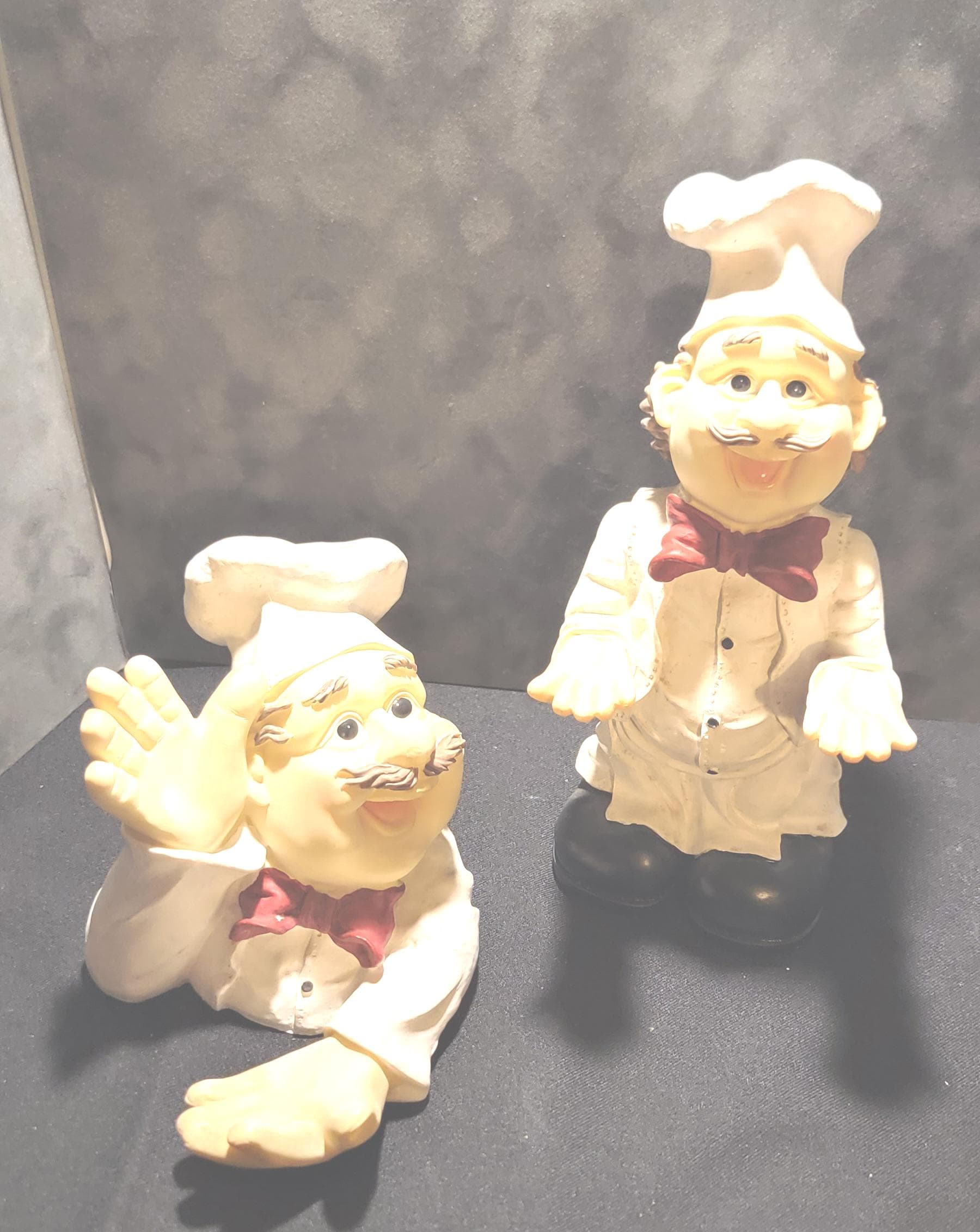 Adorable set of two vintage chef figurines featuring classic whimsical kitchen decor styling from the late 1980s–1990s.